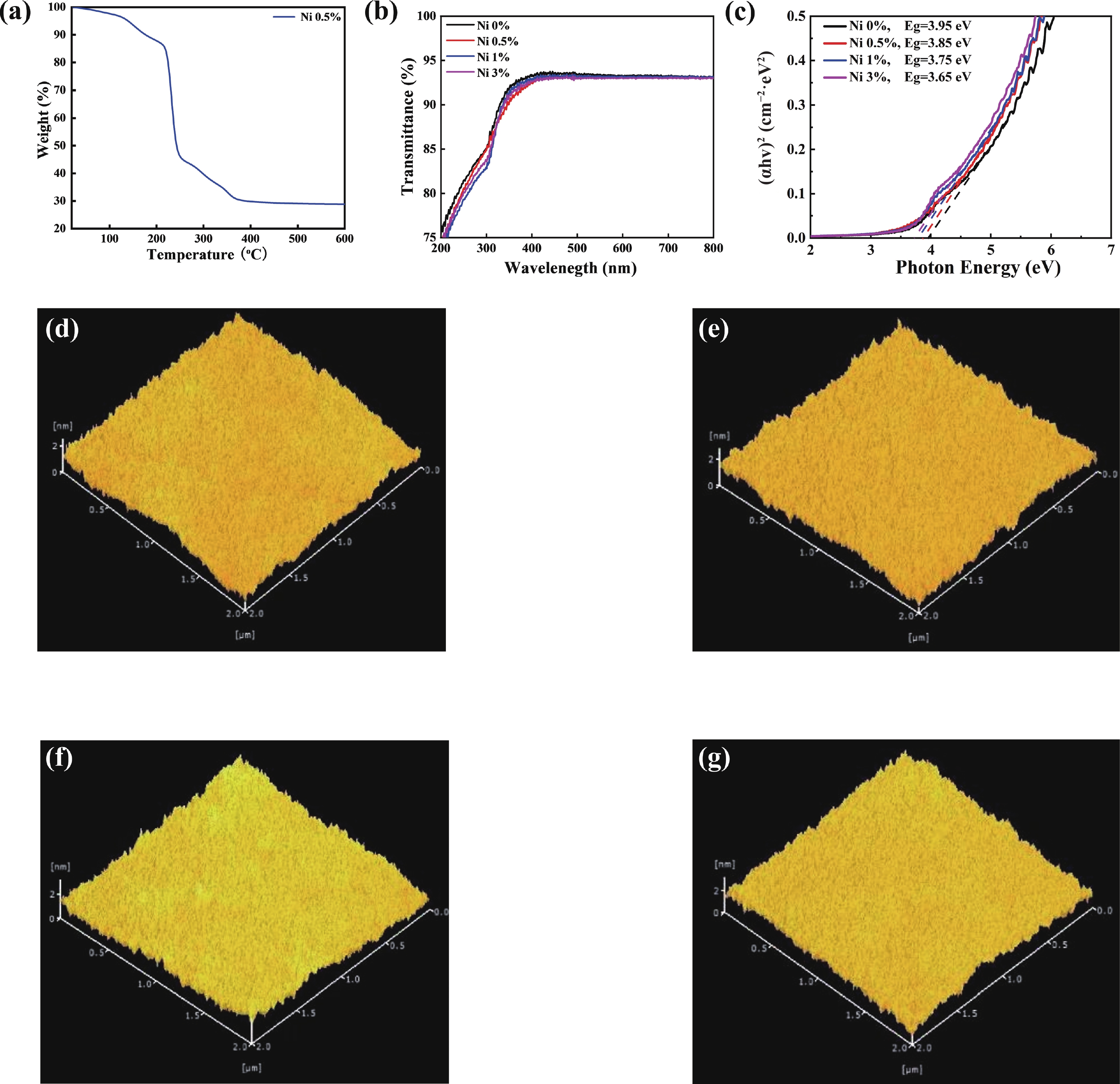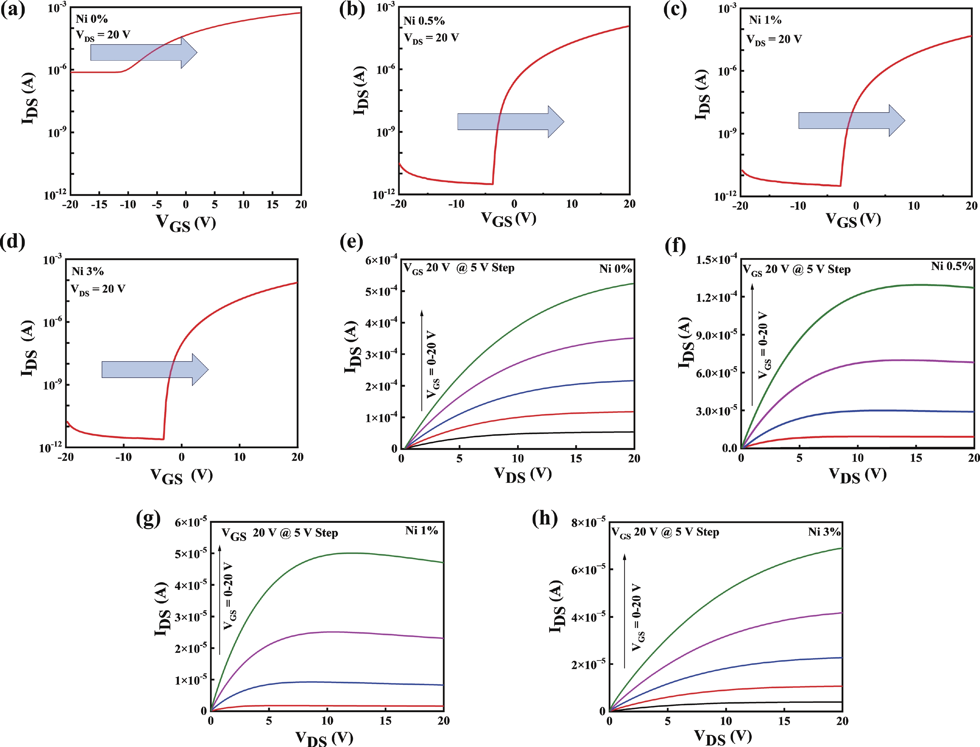 Doping in thin-film transistors (TFTs) plays a crucial role in tailoring material properties to enhance device performance, making them essential for advanced electronic applications. This study explores the synthesis and characterization of TFTs fabricated using nickel (Ni)-doped indium oxide (In2O3) via a wet-chemical approach. The presented work investigates the effect of "Ni" incorporation in In2O3 on the structural and electrical transport properties of In2O3, revealing that higher "Ni" content decreases the oxygen vacancies, leading to a reduction in leakage current and a forward shift in threshold potential (Vth). Experimental findings reveal that NiInO-based TFTs (with Ni = 0.5%) showcase enhanced electrical performance, achieving mobility of 7.54 cm2/(V∙s), an impressive ON/OFF current ratio of ~107, a Vth of 6.26 V, reduced interfacial trap states (Dit) of 8.23 × 1012 cm−2 and enhanced biased stress stability. The efficacy of "Ni" incorporation is attributed to the upgraded Lewis acidity, stable Ni−O bond strength, and small ionic radius of Ni. Negative bias illumination stability (NBIS) measurements further indicate that device stability diminishes with shorter light wavelengths, likely due to the activation of oxygen vacancies. These findings validate the solution-processed techniques' potential for future large-scale, low-cost, energy-efficient, and high-performance electronics. -