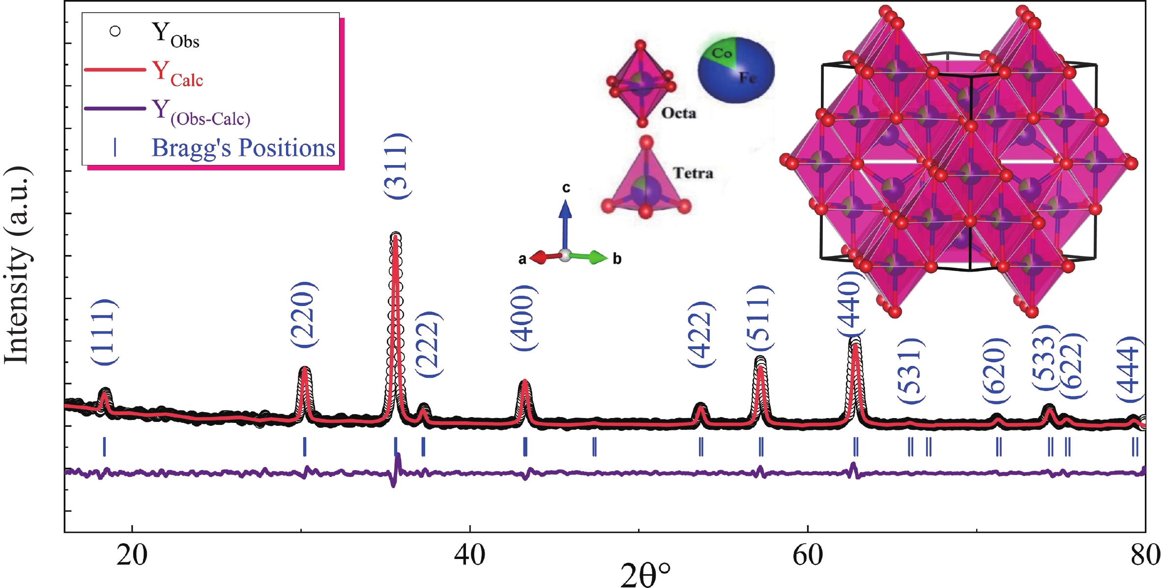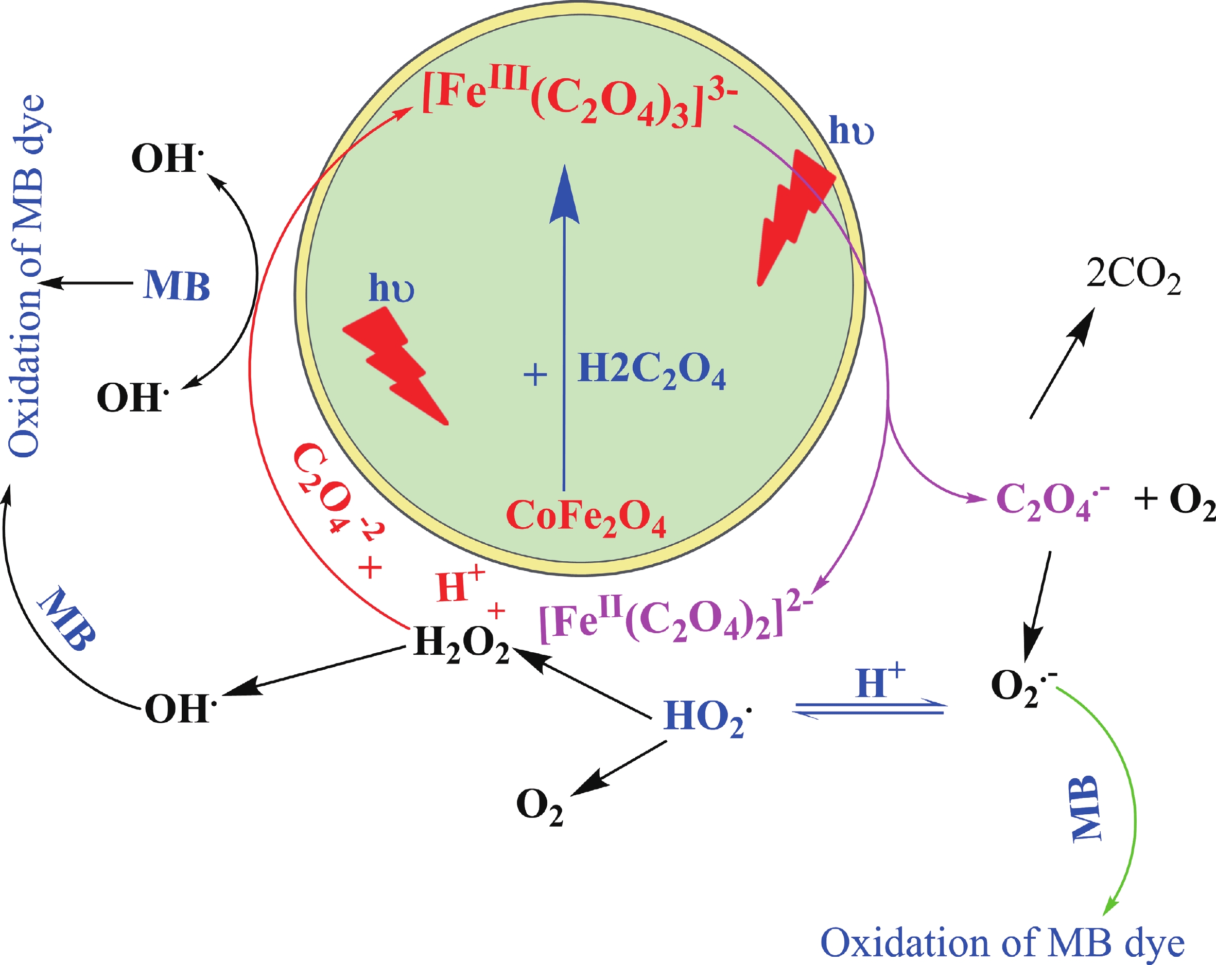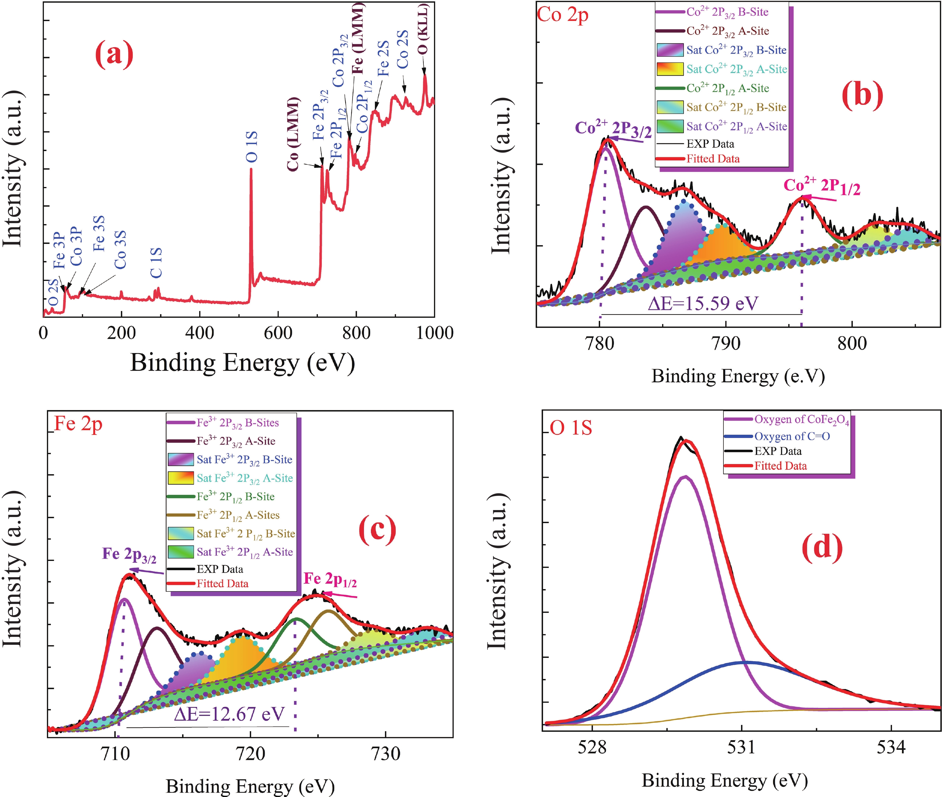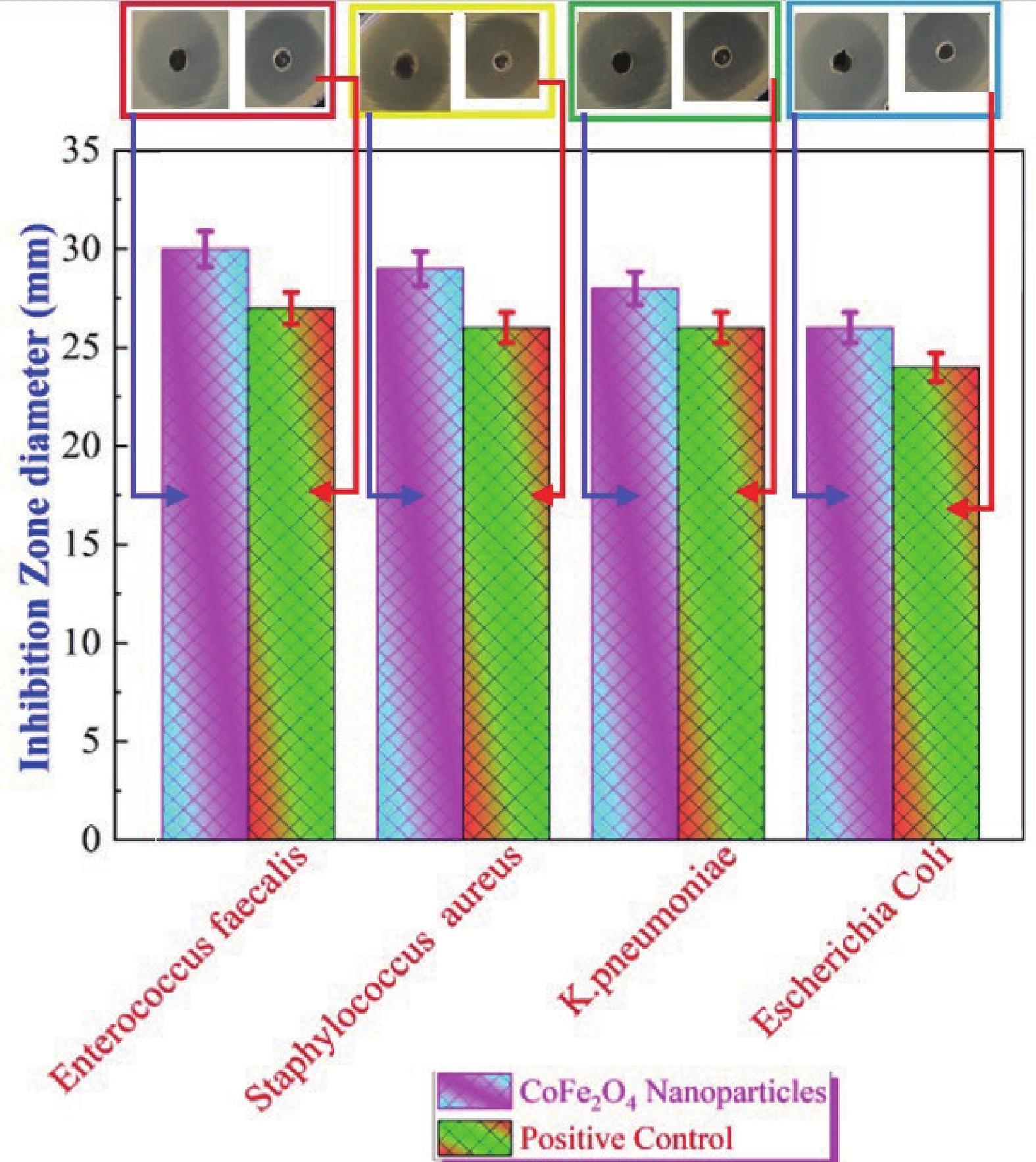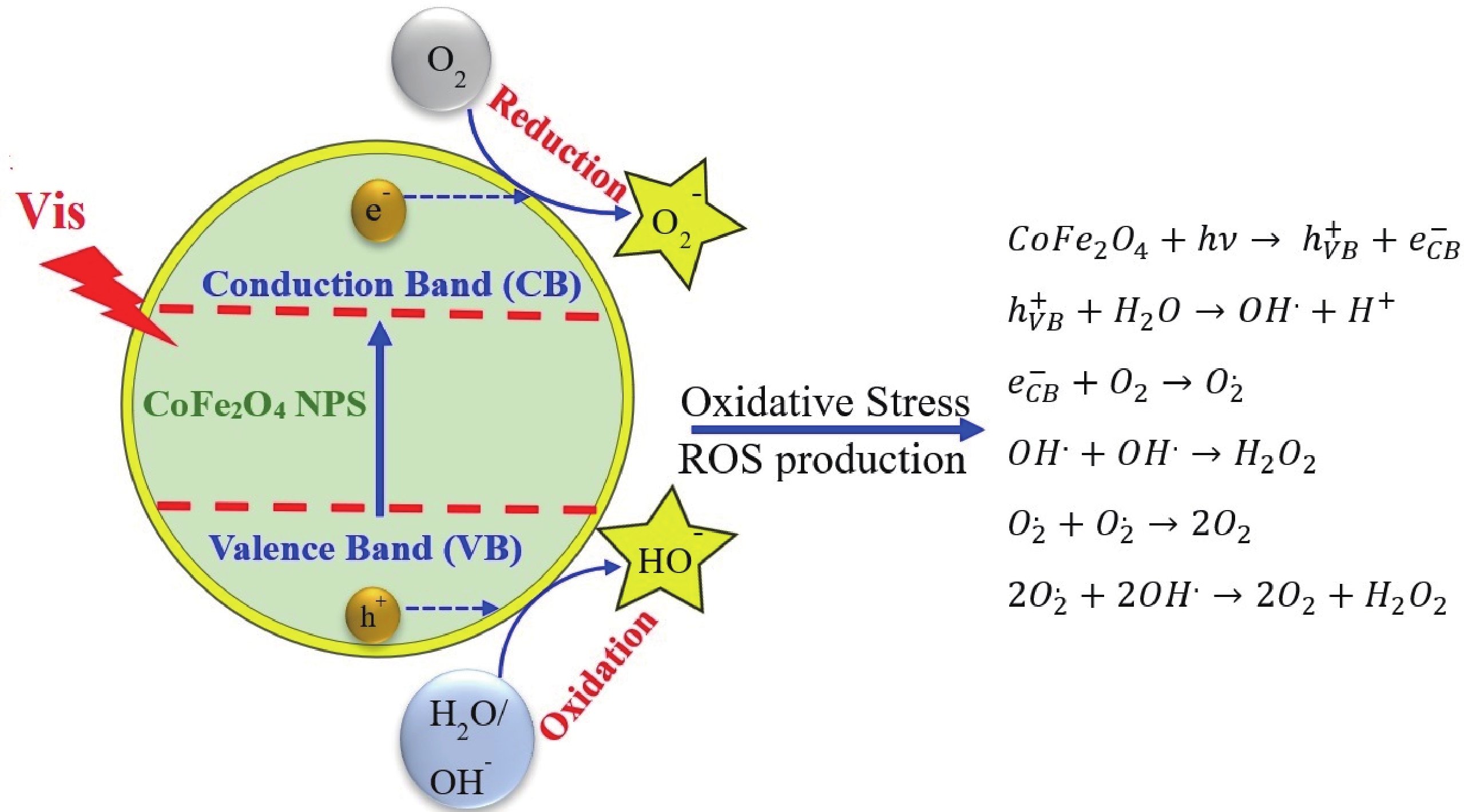This study investigates the effect of apple extract on CoFe2O4 nanoparticles synthesized via a green self-ignition method. High resolution transmission electron microscope (HRTEM) showed nanometric particles with varied shapes, while X-ray diffraction (XRD) and Rietveld refinement confirmed a facecentered cubic (Fd3̅m) structure. Mössbauer spectroscopy revealed a Zeeman sextet pattern with only Fe3+ ions. Ultra violet vissible nearinfrared (UV–Vis–NIR) spectra indicated strong absorbance in the visible and NIR regions, suggesting optoelectronic potential. The nanoparticles demonstrated high photo-Fenton catalytic efficiency, degrading 96.88% of Methylene Blue under visible light. They also exhibited 100% adsorption capacities for Cr3+ and Pb2+, making them effective for water treatment. These properties were attributed to a large surface area (347.04 m2/g), mesoporous structure, and mixed spinel phase. ANOVA and Tukey’s honestly significant difference (HSD) tests confirmed that contact time and adsorbent dosage significantly affected pollutant removal. Additionally, strong antimicrobial activity highlighted their biotechnological relevance. The inclusion of apple extract enhanced structural and functional features, expanding application prospects in spin valves, magnetic recording, refrigeration, microwave technologies (C to Ku bands), optoelectronics, and biotechnology. Future work should explore the photo-Fenton degradation mechanism and optimize synthesis for scalable production, aiming to maximize their industrial utility. -