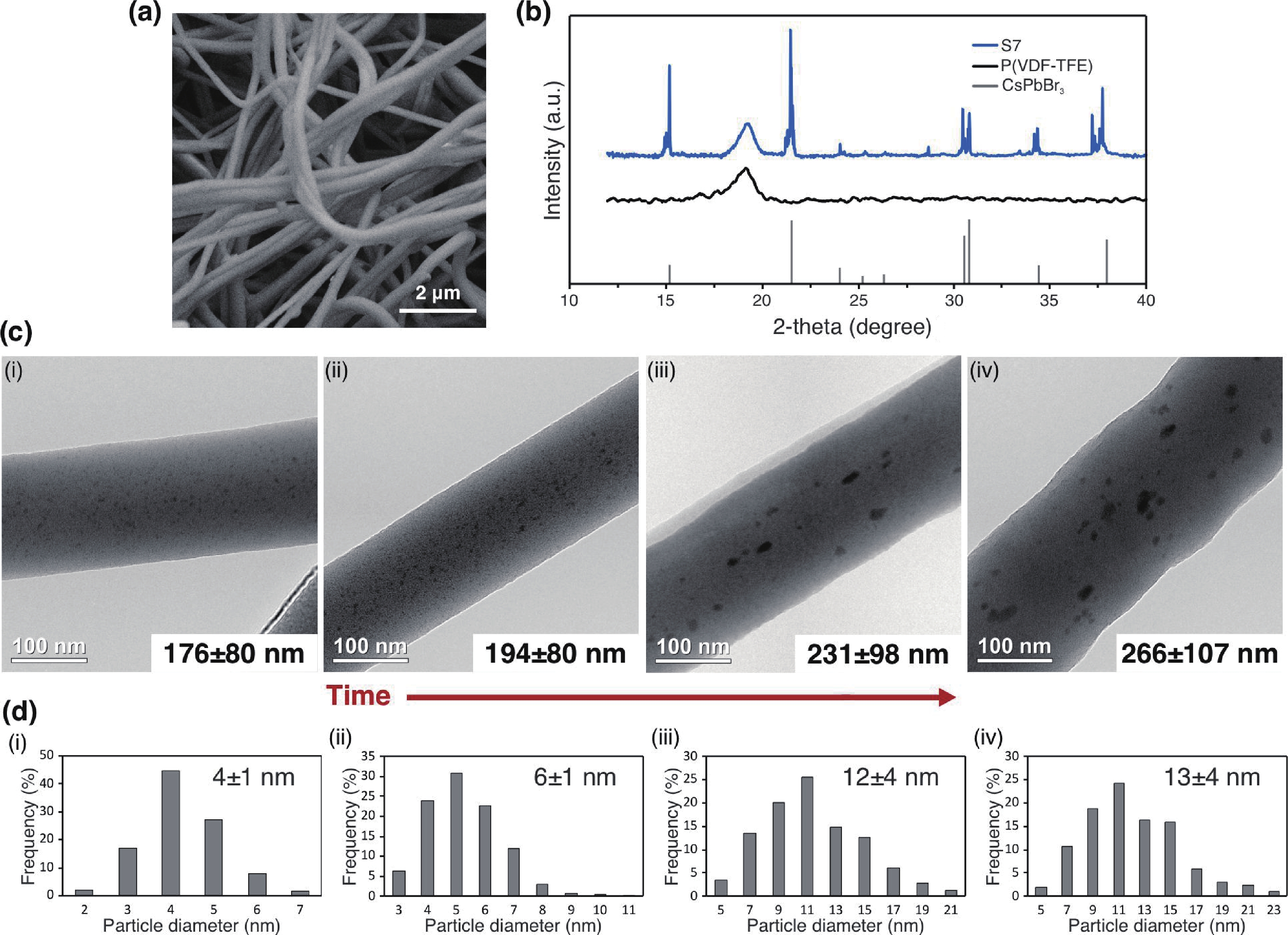Fig. 2.  (Color online) (a) SEM image of sample S7. (b) XRD pattern of samples S7, pure P(VDF-TFE), and PDF card 00-054-0751 corresponding to the CsPbBr3 monoclinic phase (JCPDS PDF-2 v. 2.2102). (c) TEM images of nonwoven fibers of sample S1 (ⅰ), S2 (ⅱ), S7 (ⅲ), and S8 (ⅳ). (d) Perovskite QDs size distribution diagrams of sample S1 (ⅰ), S2 (ⅱ), S7 (ⅲ), and S8 (ⅳ). The value was represented as the "mean ± standard deviation".