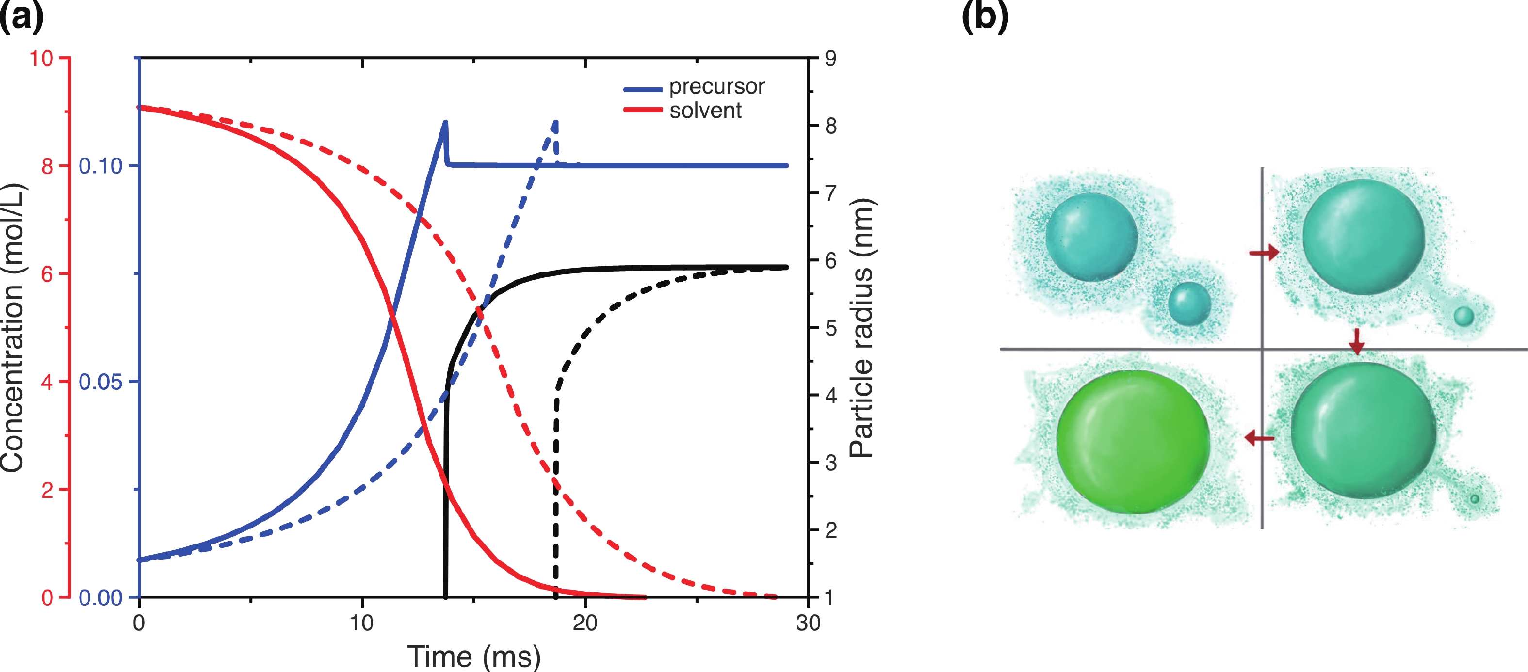 Fig. 4.  (Color online) (a) Dependence of the solvent concentration (red lines), precursor concentration (blue lines), and the radius of perovskite particles (black lines), versus the growth time for two values of the dry fiber radius, $R_{\rm{f1}}^{(1)}$ (solid lines) and $R_{\rm{{f1}}}^{(2)}$ (dashed lines). The following values of the model parameters are used: T = 25 °C, kg = 0.5 m∙s–1, $ {\tilde p_{\rm{S}}} $ = 1013 Pa, $ {\Omega _{\rm{S}}} $ = 0.172 nm3, R*= 1 nm. (b) A schematic representation of Ostwald ripening.