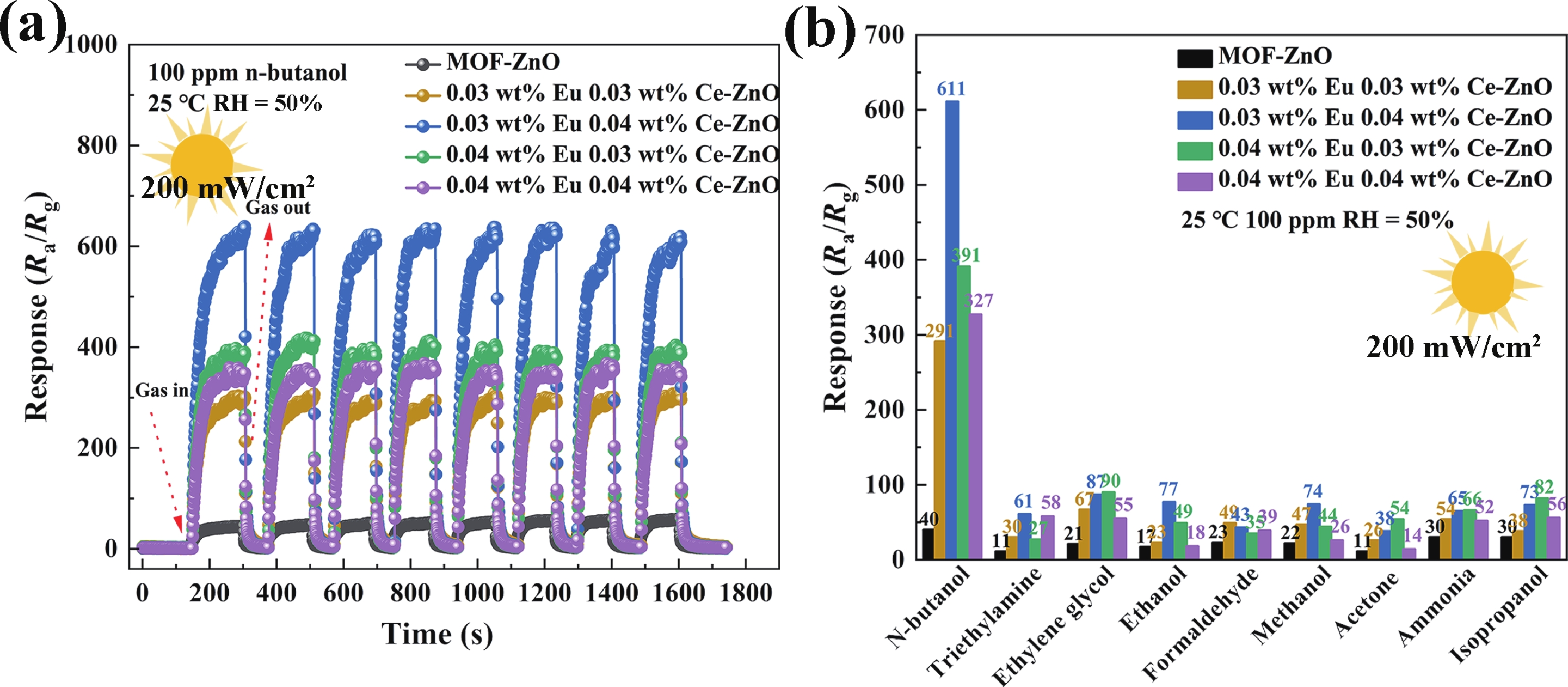 Prolonged exposure to n-butanol, a common hazardous volatile organic compound (VOC) in the environment, can lead to a broad range of adverse health effects. Therefore, detecting n-butanol safely and efficiently at low concentrations becomes critical for both environmental monitoring and human health. In this study, a novel Eu/Ce-codoped MOF-ZnO gas sensor was developed for the sensitive detection of n-butanol gas under ultraviolet activation at ambient temperature. A series of Eu/Ce-ZnO nanomaterials were synthesized via a simple co-precipitation route, by carefully designing the varied mass ratios of Eu and Ce incorporated into pristine ZnO derived from MOF precursors. The gas testing results revealed that introducing an appropriate amount of Eu and Ce would enlarge the specific surface area and enrich the oxygen vacancy content compared to pristine MOF-ZnO. Upon UV irradiation, the 0.03 wt% Eu 0.04 wt% Ce-ZnO sensor achieved a superior response of 611 for 100 ppm n-butanol at room temperature, 15.28 times higher than that of pristine MOF-ZnO (40). Furthermore, the sensor presented rapid response/recovery times (15 s/28 s) and excellent selectivity. The above contributions pave the way for the promising development of highly sensitive, ultraviolet-enhanced gas sensors for ambient temperature detection of VOCs.-
