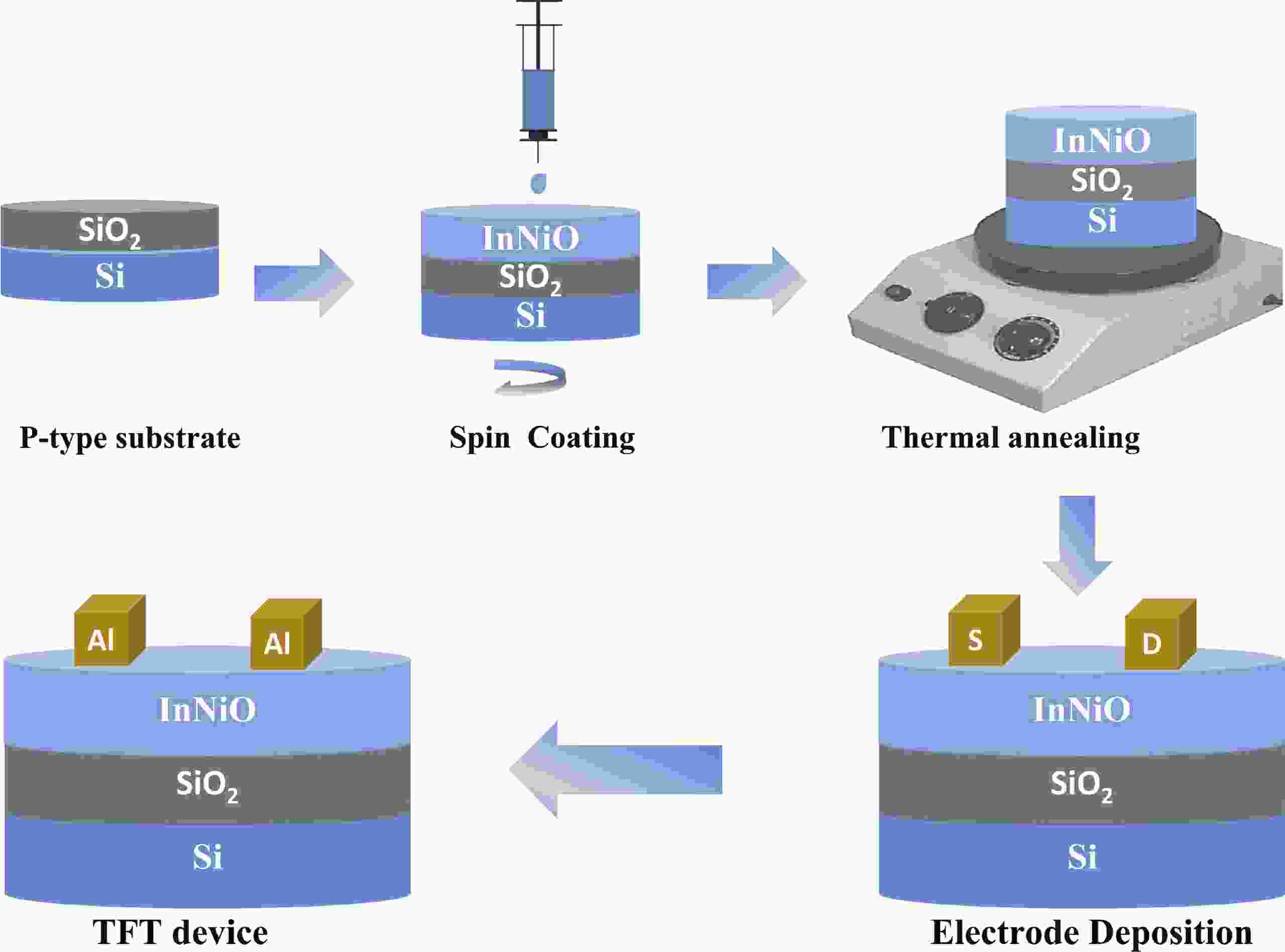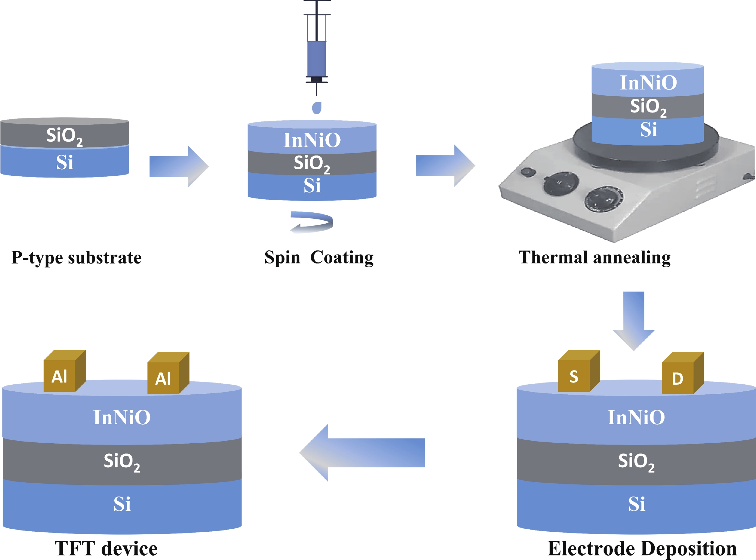 Doping in thin-film transistors (TFTs) plays a crucial role in tailoring material properties to enhance device performance, making them essential for advanced electronic applications. This study explores the synthesis and characterization of TFTs fabricated using nickel (Ni)-doped indium oxide (In2O3) via a wet-chemical approach. The presented work investigates the effect of "Ni" incorporation in In2O3 on the structural and electrical transport properties of In2O3, revealing that higher "Ni" content decreases the oxygen vacancies, leading to a reduction in leakage current and a forward shift in threshold potential (Vth). Experimental findings reveal that NiInO-based TFTs (with Ni = 0.5%) showcase enhanced electrical performance, achieving mobility of 7.54 cm2/(V∙s), an impressive ON/OFF current ratio of ~107, a Vth of 6.26 V, reduced interfacial trap states (Dit) of 8.23 × 1012 cm−2 and enhanced biased stress stability. The efficacy of "Ni" incorporation is attributed to the upgraded Lewis acidity, stable Ni−O bond strength, and small ionic radius of Ni. Negative bias illumination stability (NBIS) measurements further indicate that device stability diminishes with shorter light wavelengths, likely due to the activation of oxygen vacancies. These findings validate the solution-processed techniques' potential for future large-scale, low-cost, energy-efficient, and high-performance electronics.