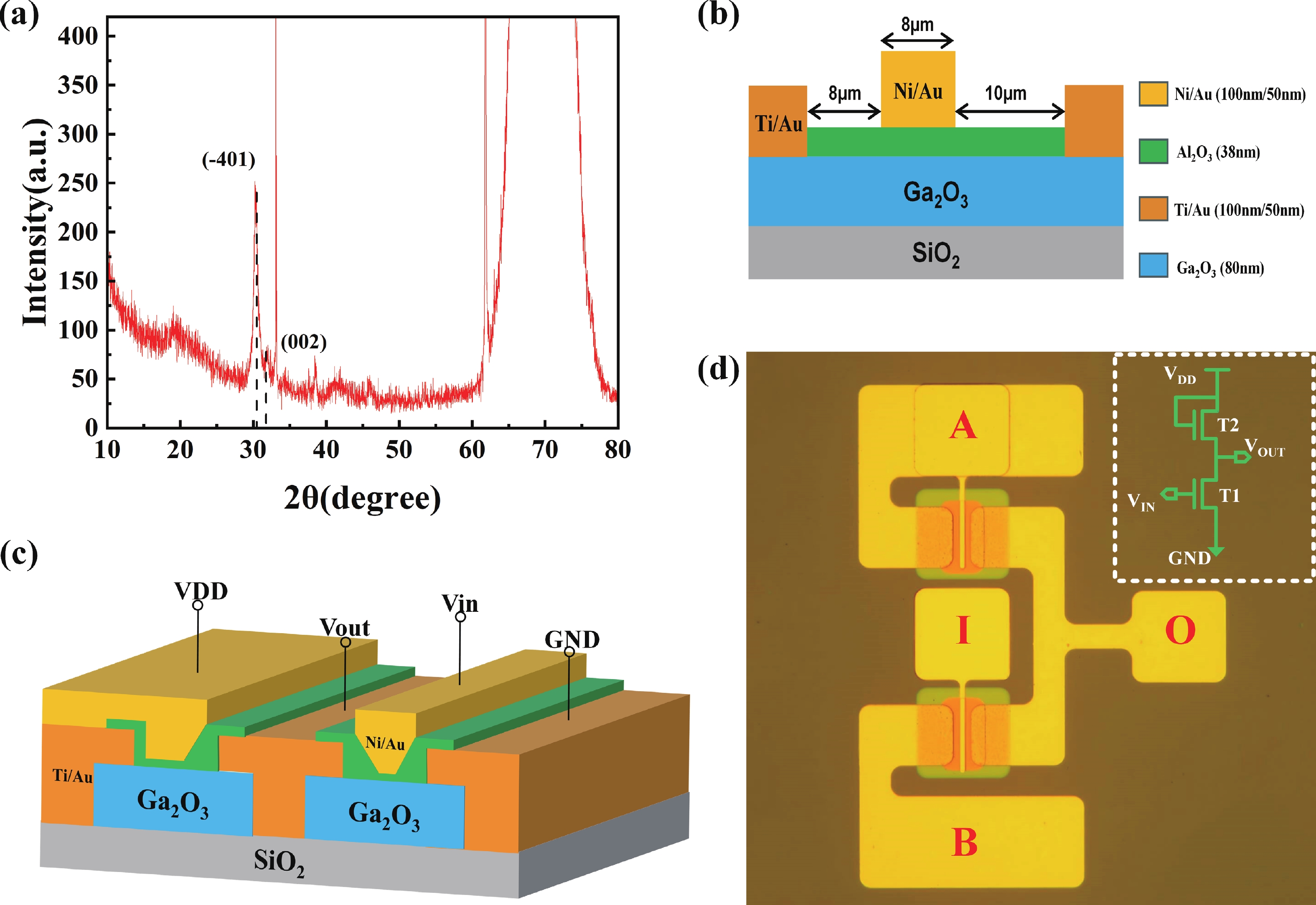 β-Ga2O3 MOS inverter should play a crucial role in β-Ga2O3 electronic circuits. Enhancement-mode (E-mode) MOSFET was fabricated based on β-Ga2O3 film grown by atomic layer deposition technology, and the β-Ga2O3 inverter was further monolithically integrated on this basis. The β-Ga2O3 nMOSFET exhibits excellent electrical characteristics with an on/off current ratio reaching 105. The logic inverter shows outstanding voltage inversion characteristics under low-frequency from 1 to 400 Hz operation. As the frequency continues to increase to 10 K, the reverse characteristic becomes worse due to parasitic capacitance induced by processes, and the difference between the highest and lowest values of VOUT has an exponential decay relationship with the frequency. This paper provides the practice for the development of β-Ga2O3-based circuits.