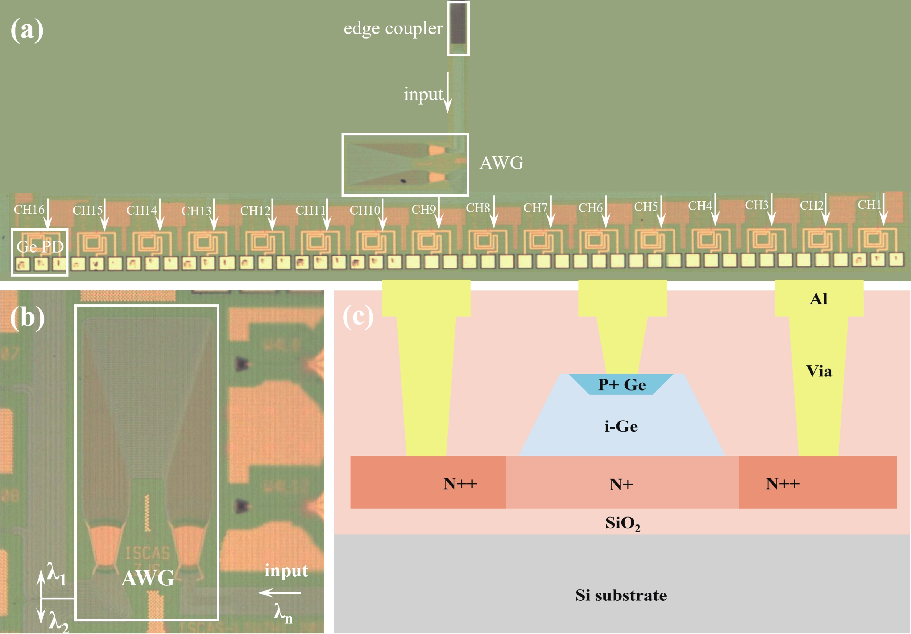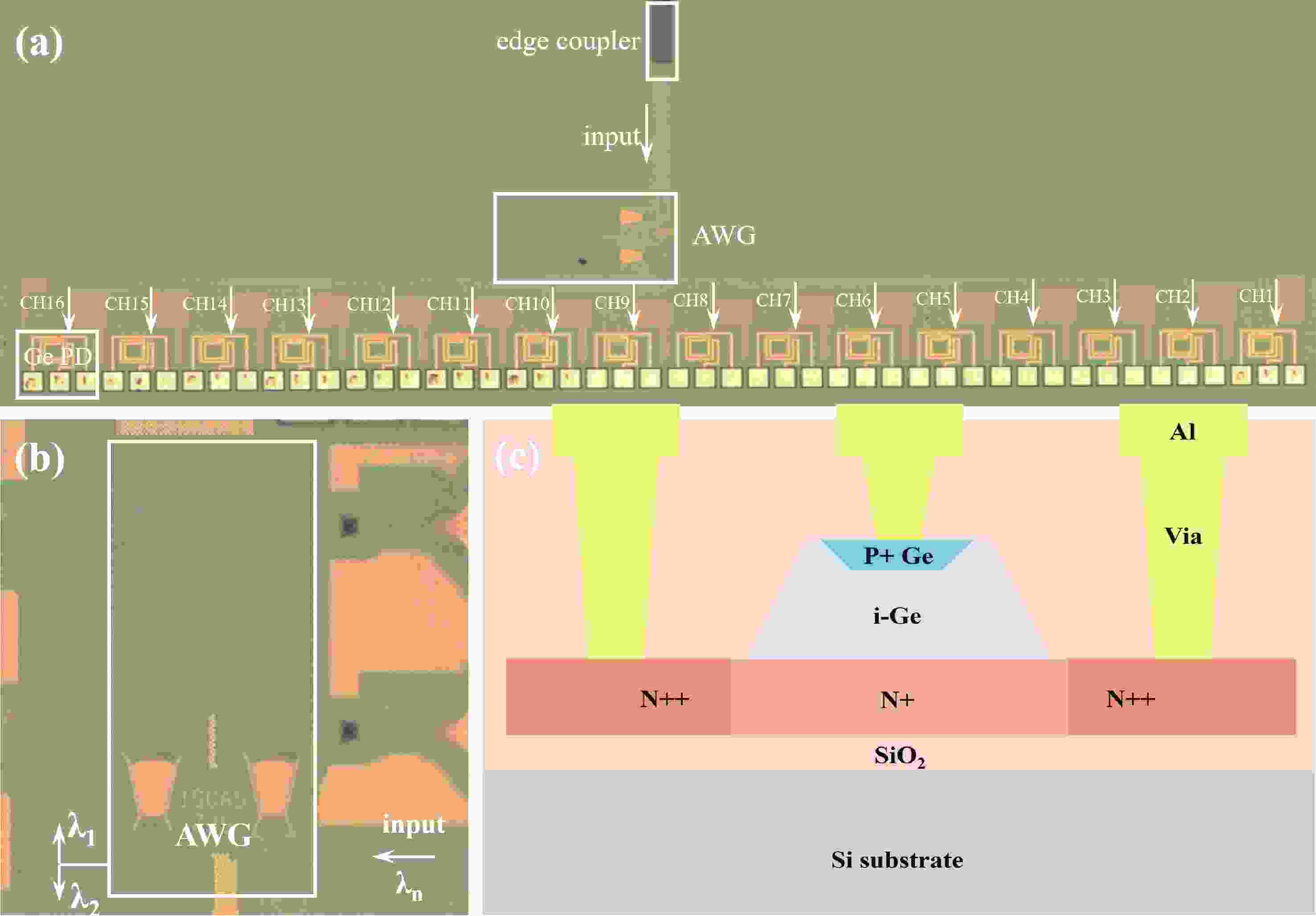 Wavelength division multiplexing technology has been pivotal in addressing the demand for high-capacity optical communication with silicon photonics providing a promising platform. This work presents a 16-channel wavelength division multiplexing silicon photonics receiver chip composed of an arrayed waveguide grating and Ge-on-Si photodetectors. Integrated inductors are introduced to enhance the high-speed performance of photodetectors, enabling data rates up to 112 Gbps with high responsivity and low dark current. The operating wavelength range of the arrayed wavelength grating is adjusted according to the response of the Ge-on-Si photodetector. The optical insertion loss, cross talk and central wavelength of the array waveguide grating are 2.1 to 3.7 dB, −12 to −15 dB, and 1538 nm, respectively. The proposed receiver chip offers a solution to meet the challenges of modern data transmission requirements.
