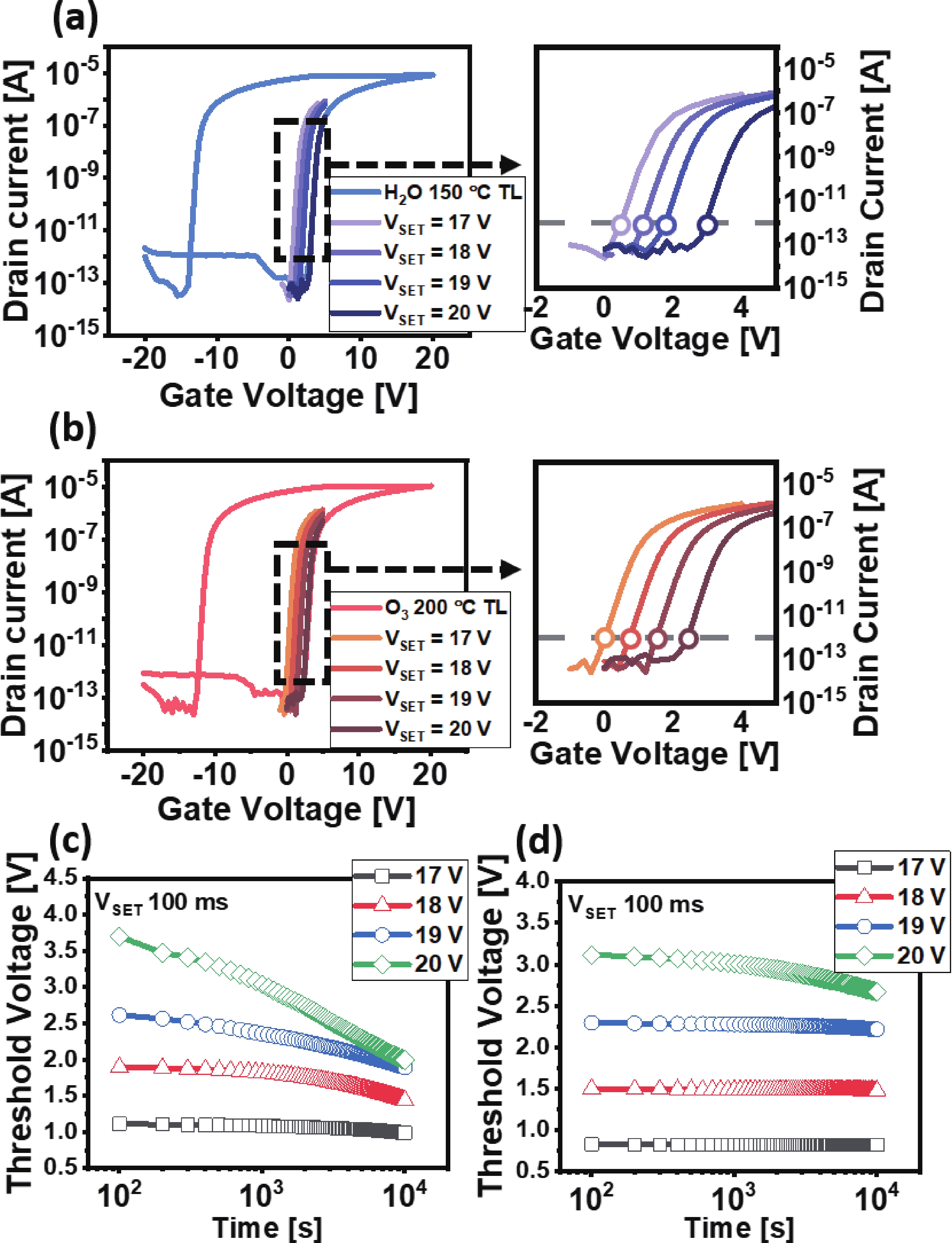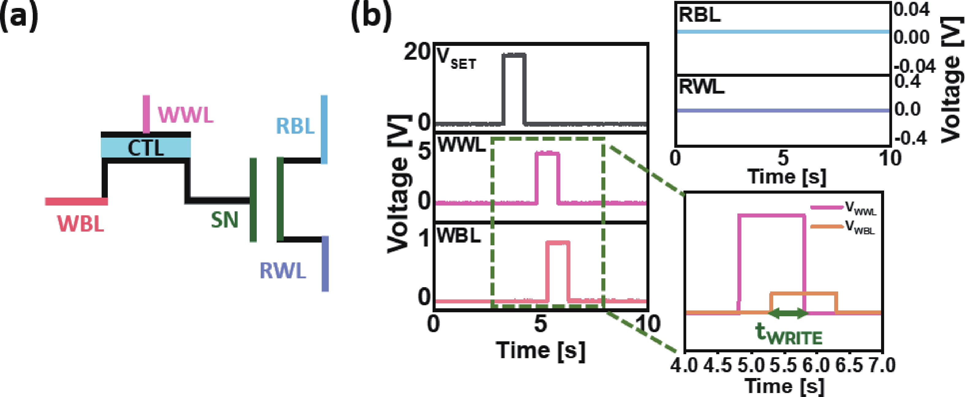 The fabrication of a dynamic threshold-2T0C (DT-2T0C) DRAM cell incorporating a ZnO charge-trap layer in the write transistor has been successfully achieved, addressing the negative hold voltage (VHOLD) issue of conventional 2T0C DRAM cells using oxide channel layers. The proposed device facilitates dynamic modulation of turn-on voltage (VON) through an additional SET operation, allowing VON to shift above 0 V. The retention time in SET operation was extended to 104 s by optimizing the tunneling layer deposition conditions. The device characterization revealed a significant correlation between VON and both the WRITE speed and the retention properties of the DT-2T0C, verifying the trade-off between WRITE time and retention time. A long retention time over 1000 s was achieved, even under VHOLD of 0 V.