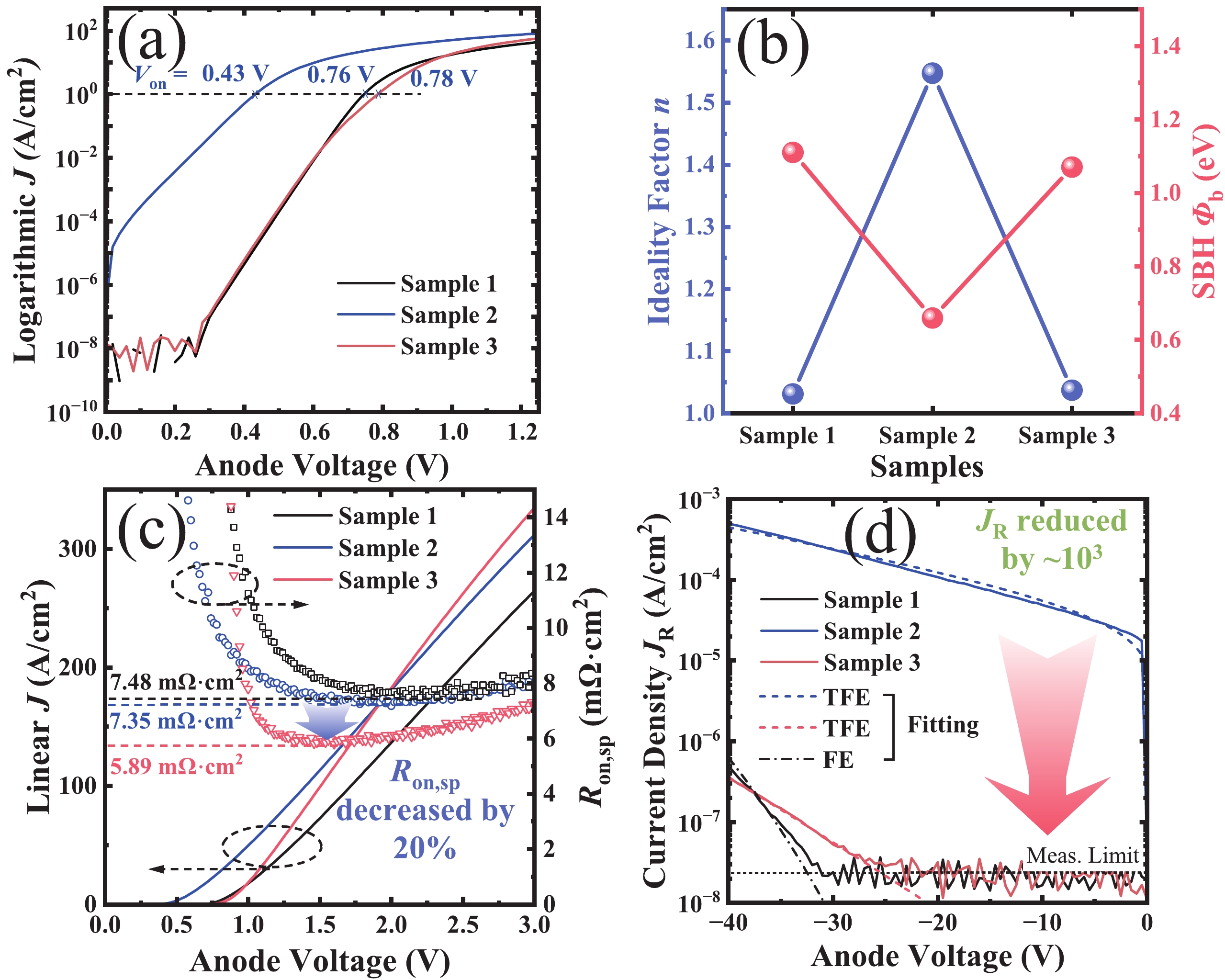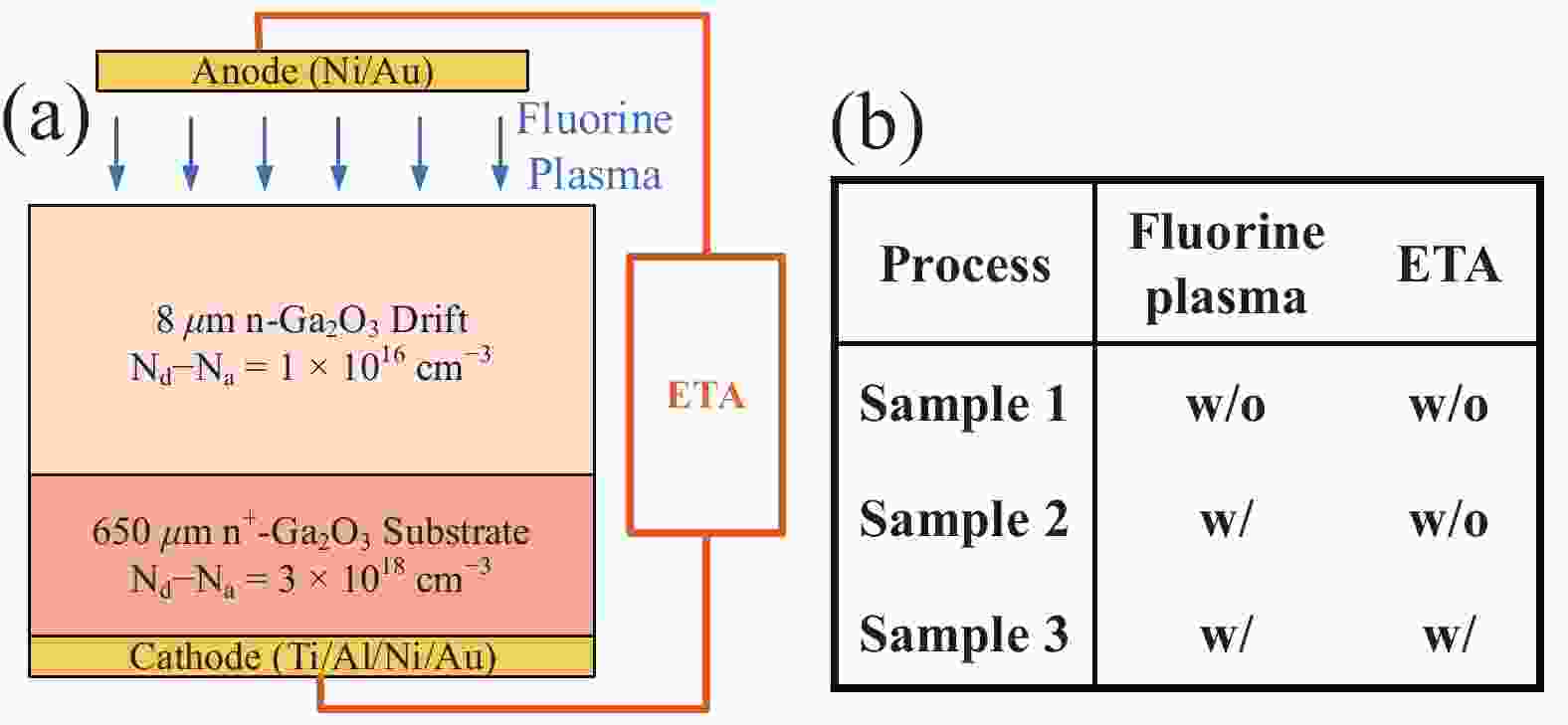The interfacial properties of Schottky contacts crucially affect the performance of power devices. While a few studies have explored the impact of fluorine on Schottky contacts, a comprehensive theoretical explanation supported by experimental evidence remains lacking. This work investigates the effects of fluorine incorporation and electrothermal annealing (ETA) on the current transport process at Ni/β-Ga2O3 Schottky contacts. X-ray photoelectron spectroscopy and first-principles calculations confirm the presence of fluorine substitutions for oxygen and oxygen vacancies and their lowering effect on the Schottky barrier heights. Additionally, accurate electrothermal hybrid TCAD simulations validates the extremely short-duration high temperatures (683 K) induced by ETA, which facilitates lattice rearrangement and reduces interface trap states. The interface trap states are quantitatively resolved through frequency-dependent conductance technique, showing the trap density (DT) reduction from (0.88−2.48) × 1011 cm−2·eV−1 to (0.46−2.09) × 1011 cm−2·eV−1. This investigation offers critical insights into the β-Ga2O3 contacts with the collaborative treatment and solids the promotion of high-performance β-Ga2O3 power devices.