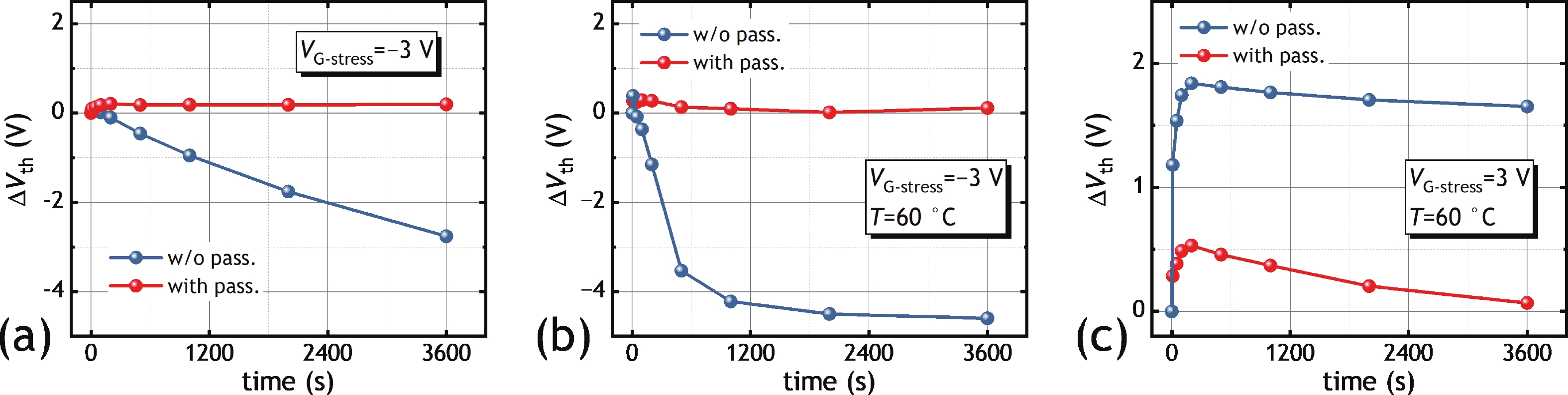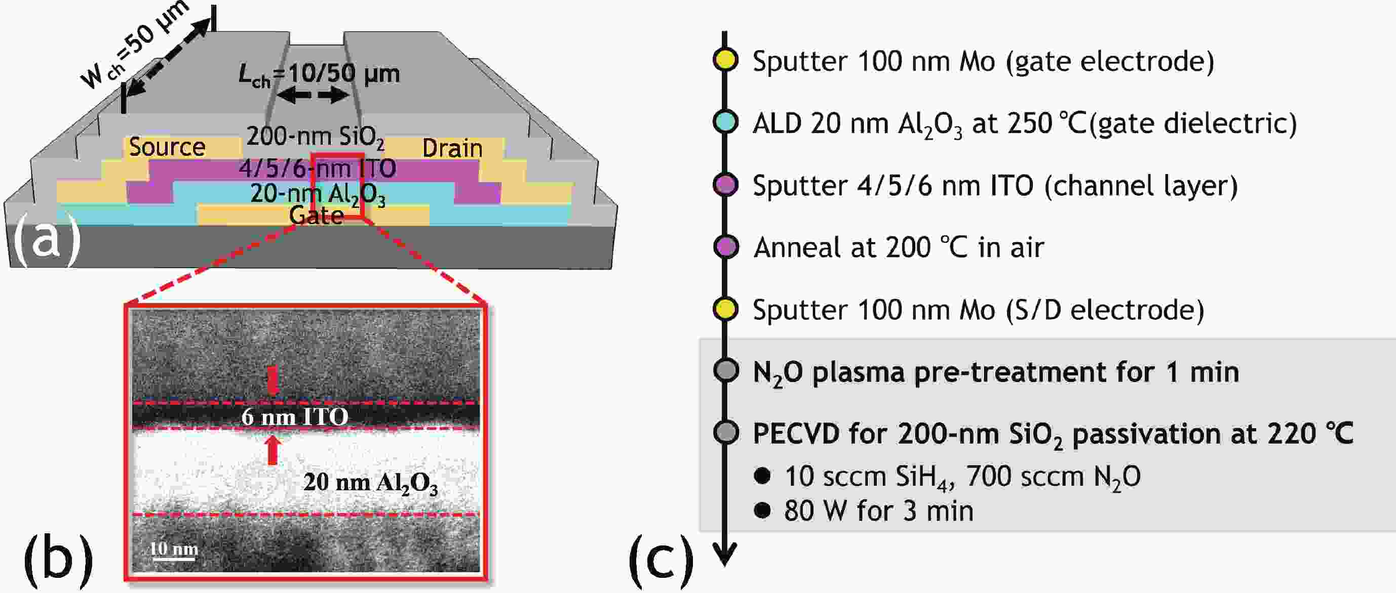 In this work, we demonstrated the InSnO (ITO) TFTs passivated with SiO2 via the PECVD process compatible with large-area production for the first time. The passivated ITO TFTs with various channel thicknesses (tch = 4, 5, 6 nm) exhibit excellent electrical performance and superior uniformity. The reliability properties of ITO TFTs were evaluated in detail under positive bias stress (PBS) conditions before and after passivation. Compared to the devices without passivation, the passivated devices have only 50% threshold voltage degradation (ΔVth) and 50% newly generated traps due to excellent isolation of the ambient atmosphere. The negligible performance degradation of ITO TFTs with passivation during negative bias stress (NBS) and negative bias temperature stress (NBTS) verifies the outstanding immunity to the water vapor of the SiO2 passivation layer. Overall, the ITO TFT with the tch of 6 nm and with SiO2 passivation exhibits the best performance in terms of electrical properties, uniformity, and reliability, which is promising in large-area production.