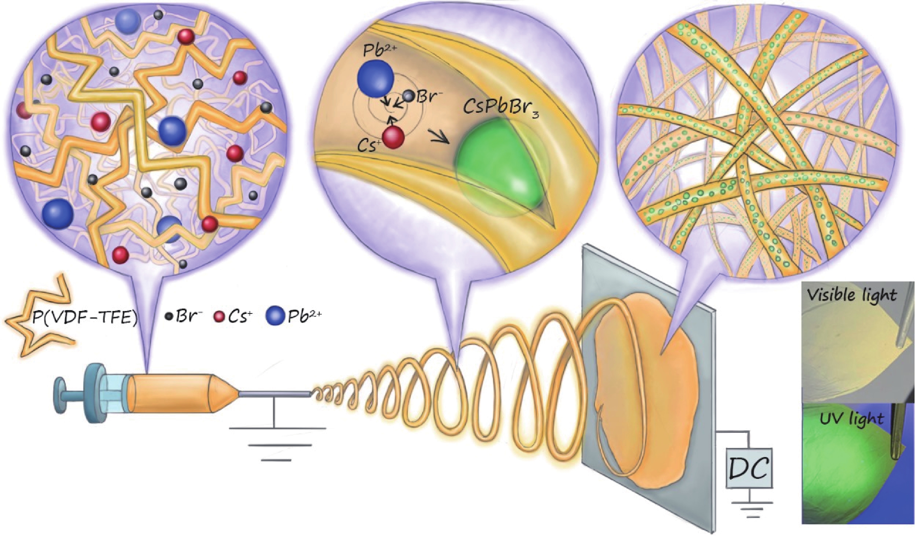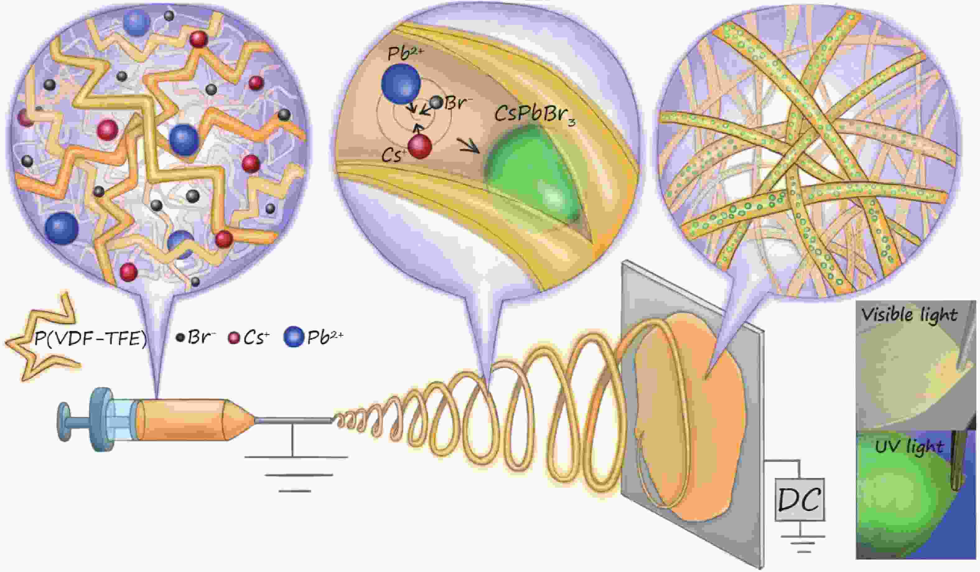 Flexible materials with perovskite quantum dots (PQDs) are widely used in the field of photonics and opto-electronics due to their unique properties. Development of new materials based on these nanoparticles, incorporated into flexible and lightweight nonwoven fabrics, demonstrated high photoconductivity and efficient light energy conversion. In this work, we propose a method for creating a stable luminescent nonwoven material using electrospinning, in which inorganic salt precursors are used without the need for additional stabilizers. Equimolar solutions of cesium and lead (Ⅱ) bromide were mixed with a fluoroplast, resulting in a series of samples. Luminescent materials were obtained containing PQDs with a composition of CsPbBr3, with emission peaks ranging from 507 to 517 nm under 365-nm excitation. We have experimentally established and theoretically confirmed that the peak position is related to the size of the particles formed in the fiber during electrospinning and depends on processing time. Developed materials exhibited stable luminescent properties for up to 2.5 years, making them a promising candidate for the development of new flexible optoelectronic devices based on PQDs.