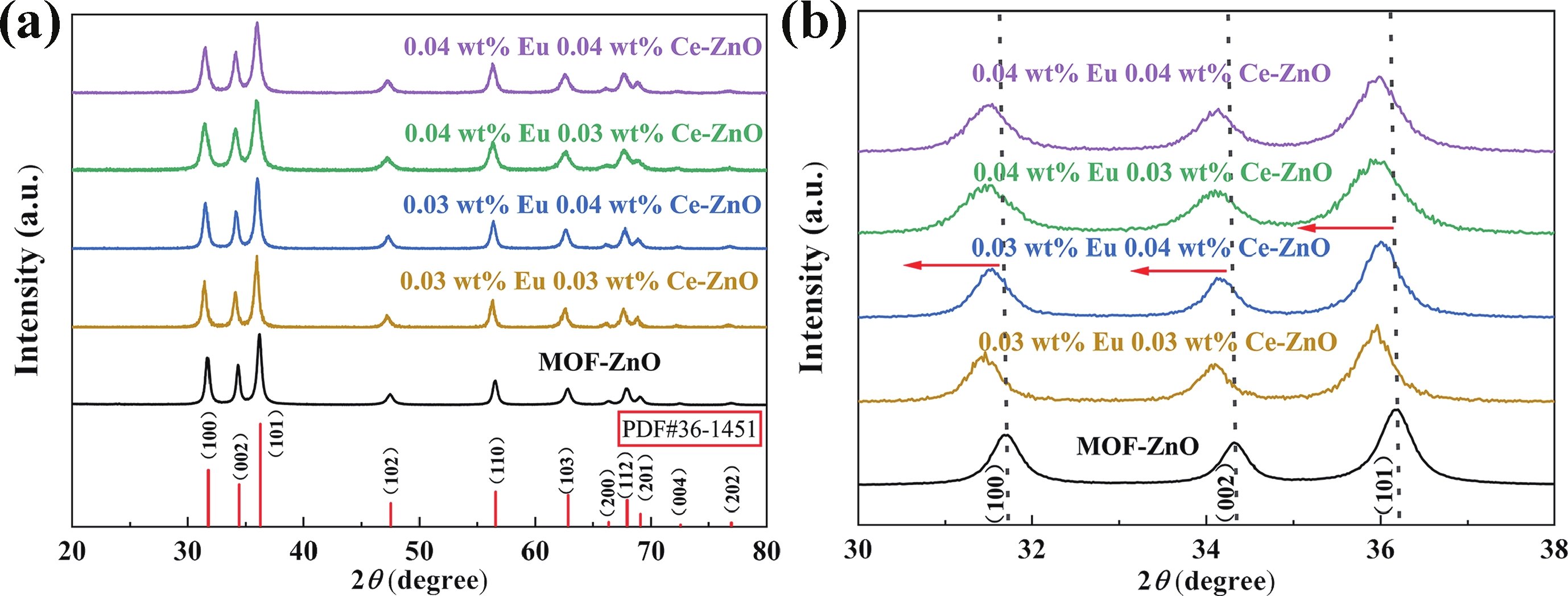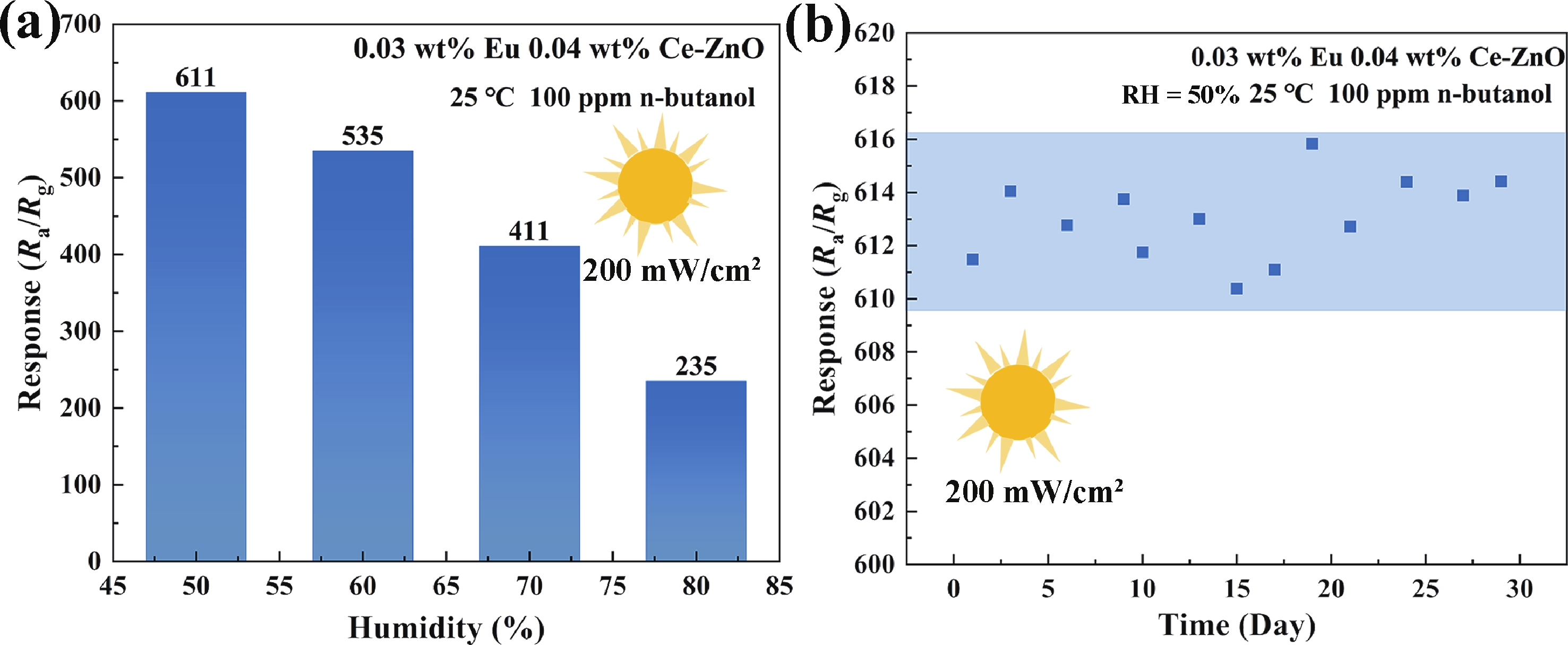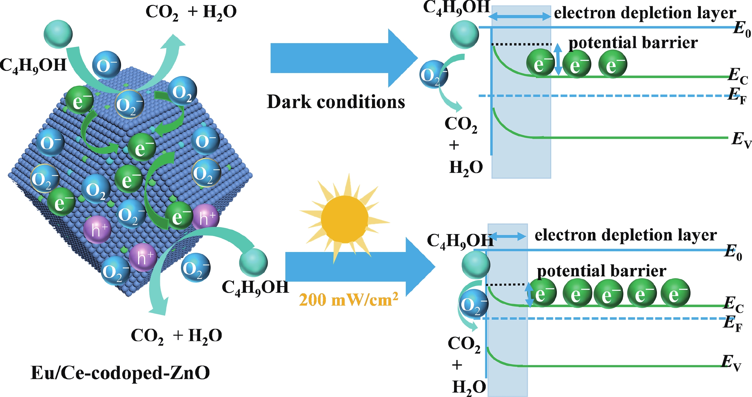 Prolonged exposure to n-butanol, a common hazardous volatile organic compound (VOC) in the environment, can lead to a broad range of adverse health effects. Therefore, detecting n-butanol safely and efficiently at low concentrations becomes critical for both environmental monitoring and human health. In this study, a novel Eu/Ce-codoped MOF-ZnO gas sensor was developed for the sensitive detection of n-butanol gas under ultraviolet activation at ambient temperature. A series of Eu/Ce-ZnO nanomaterials were synthesized via a simple co-precipitation route, by carefully designing the varied mass ratios of Eu and Ce incorporated into pristine ZnO derived from MOF precursors. The gas testing results revealed that introducing an appropriate amount of Eu and Ce would enlarge the specific surface area and enrich the oxygen vacancy content compared to pristine MOF-ZnO. Upon UV irradiation, the 0.03 wt% Eu 0.04 wt% Ce-ZnO sensor achieved a superior response of 611 for 100 ppm n-butanol at room temperature, 15.28 times higher than that of pristine MOF-ZnO (40). Furthermore, the sensor presented rapid response/recovery times (15 s/28 s) and excellent selectivity. The above contributions pave the way for the promising development of highly sensitive, ultraviolet-enhanced gas sensors for ambient temperature detection of VOCs.