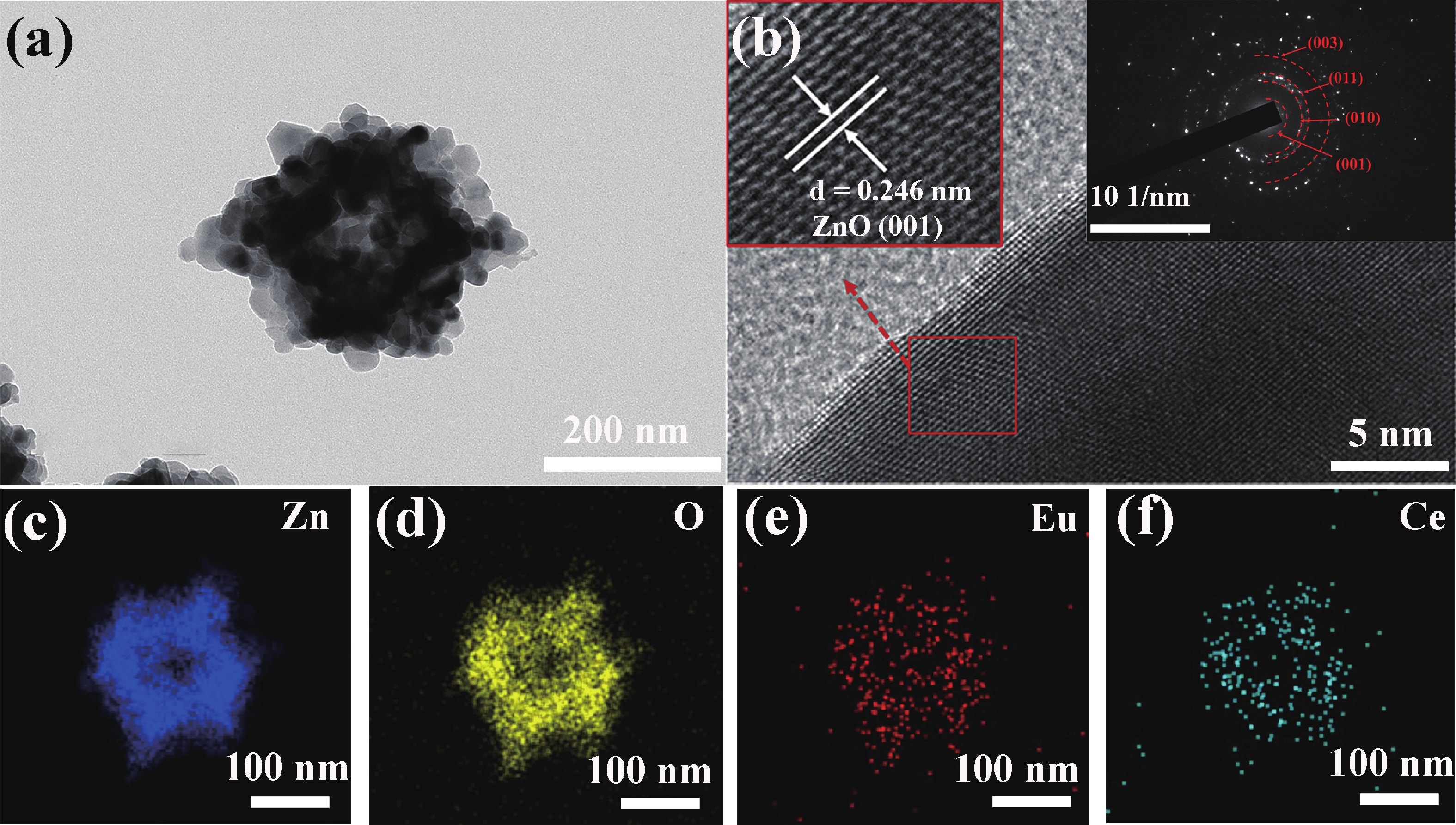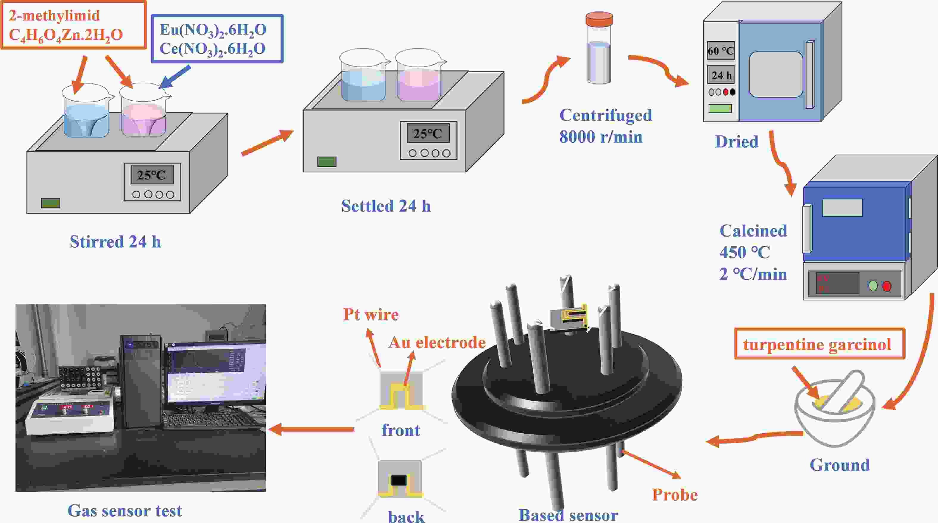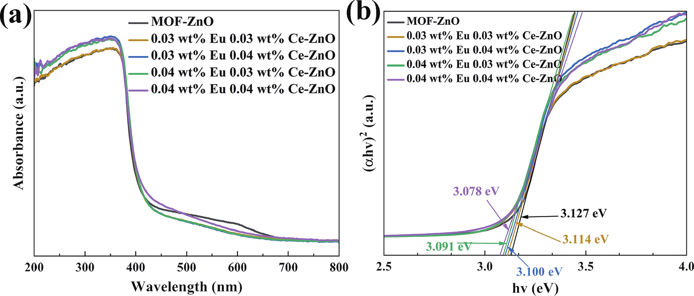 Prolonged exposure to n-butanol, a common hazardous volatile organic compound (VOC) in the environment, can lead to a broad range of adverse health effects. Therefore, detecting n-butanol safely and efficiently at low concentrations becomes critical for both environmental monitoring and human health. In this study, a novel Eu/Ce-codoped MOF-ZnO gas sensor was developed for the sensitive detection of n-butanol gas under ultraviolet activation at ambient temperature. A series of Eu/Ce-ZnO nanomaterials were synthesized via a simple co-precipitation route, by carefully designing the varied mass ratios of Eu and Ce incorporated into pristine ZnO derived from MOF precursors. The gas testing results revealed that introducing an appropriate amount of Eu and Ce would enlarge the specific surface area and enrich the oxygen vacancy content compared to pristine MOF-ZnO. Upon UV irradiation, the 0.03 wt% Eu 0.04 wt% Ce-ZnO sensor achieved a superior response of 611 for 100 ppm n-butanol at room temperature, 15.28 times higher than that of pristine MOF-ZnO (40). Furthermore, the sensor presented rapid response/recovery times (15 s/28 s) and excellent selectivity. The above contributions pave the way for the promising development of highly sensitive, ultraviolet-enhanced gas sensors for ambient temperature detection of VOCs.