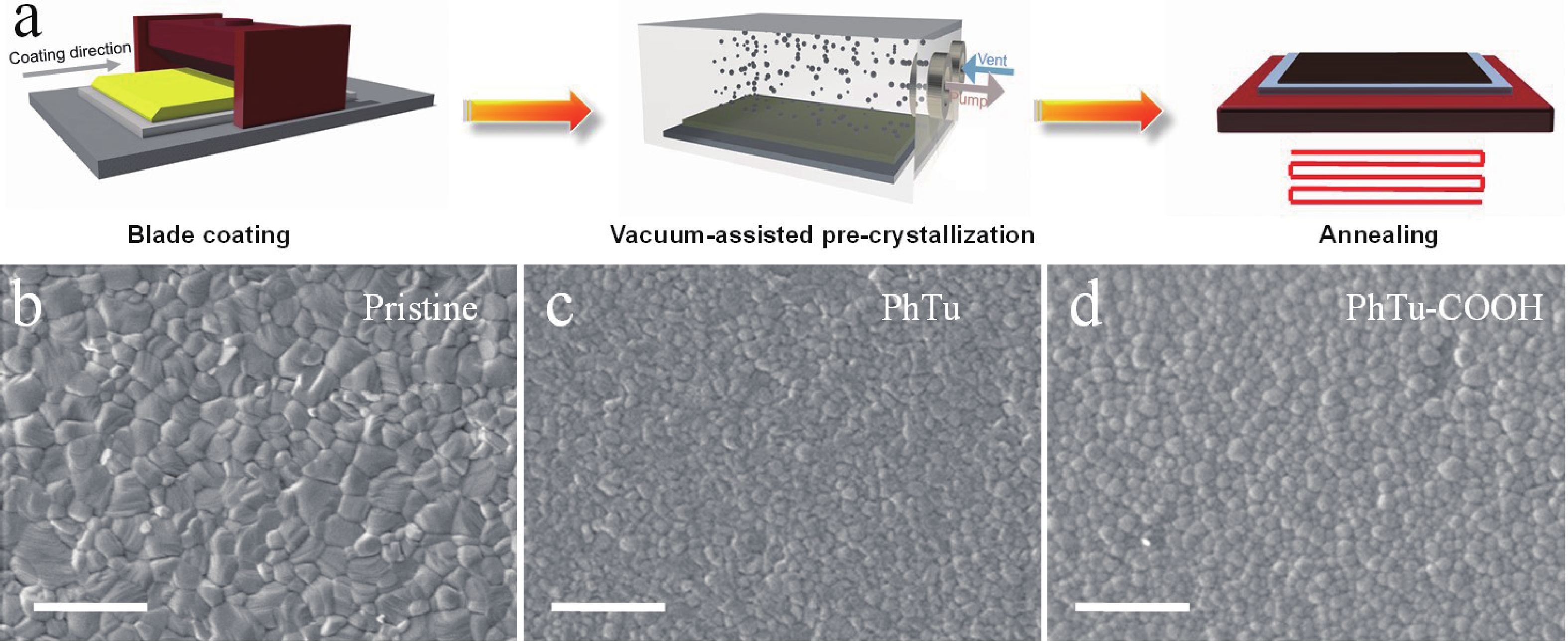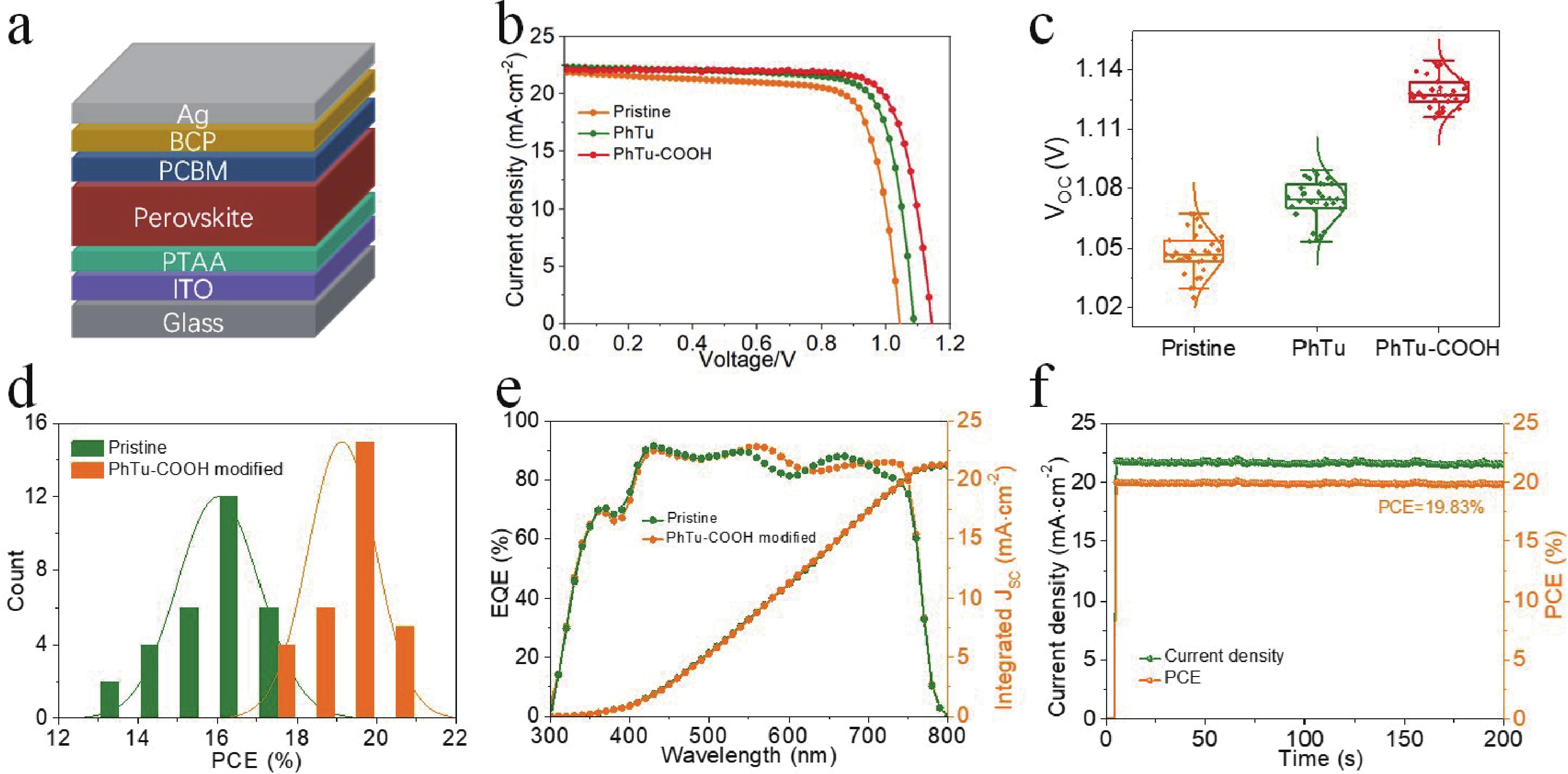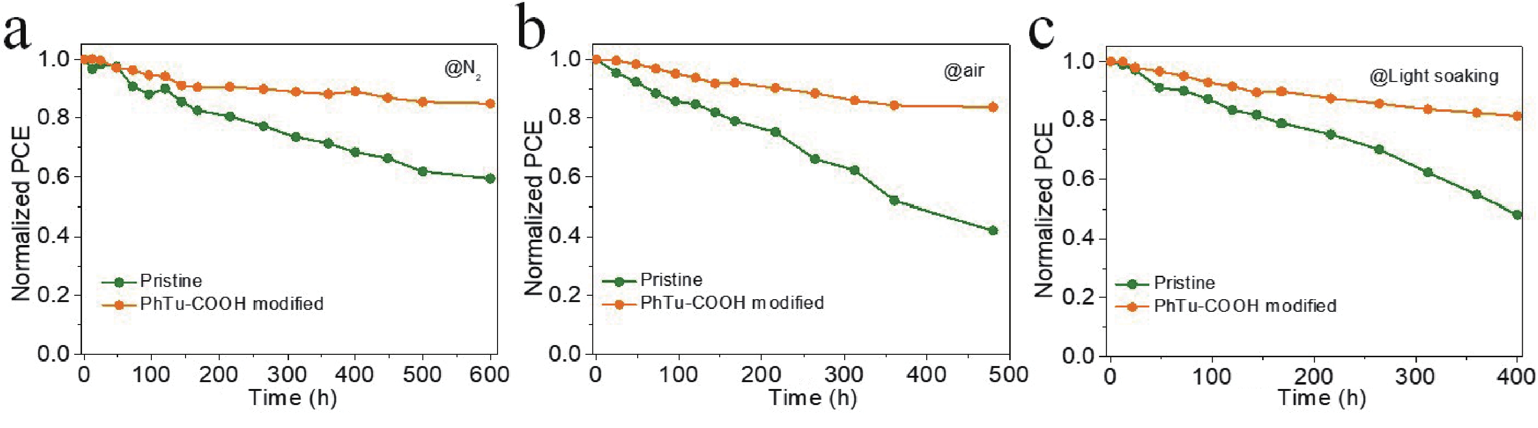 Although the certified power conversion efficiency (PCE) of single-junction perovskite solar cells (PSCs) has achieved a high level of 27%, approaching the single-crystalline silicon solar cells, the device stability remains an urgent issue to be resolved for the commercialization. Defect passivation emerged as a viable approach to enhance the operational stability of the solar devices. Herein, phenylthiourea (PhTu) derivatives are selected as effective passivation agents to enhance the optoelectronic properties of printed methylammonium lead iodide (MAPbI3) films. It is demonstrated that incorporating a small amount of 1-(4-carboxyphenyl)-2-thiourea (PhTu-COOH) significantly reduces the trap-state density and leads to longer carrier lifetime of the perovskite films. As a result, the inverted solar device made of PhTu-COOH-modified MAPbI3 perovskite film shows remarkably improved efficiency (from 17.29% to 20.22%) and obviously increased open-circuit voltage (VOC) (from 1.043 to 1.143 V), as compared with the pristine device. Moreover, the PhTu-COOH-modified PSCs exhibit enhanced operational stability due to the significantly reduced trap-state density. Finally, the optimized solar module fabricated with an active area of 11.28 cm2 delivers a high PCE of 17.07% with negligible VOC loss, demonstrating the feasibility of the blade-coating method for large-area perovskite film deposition.