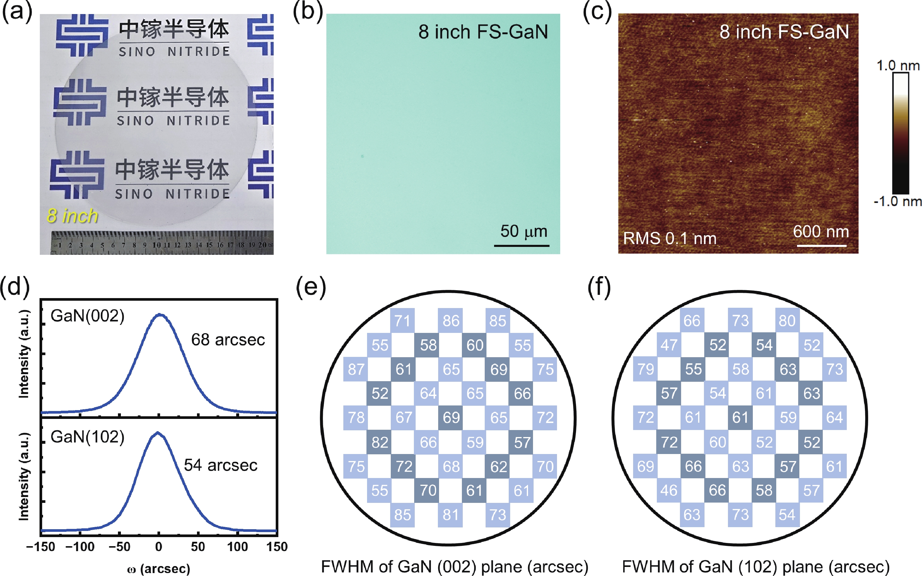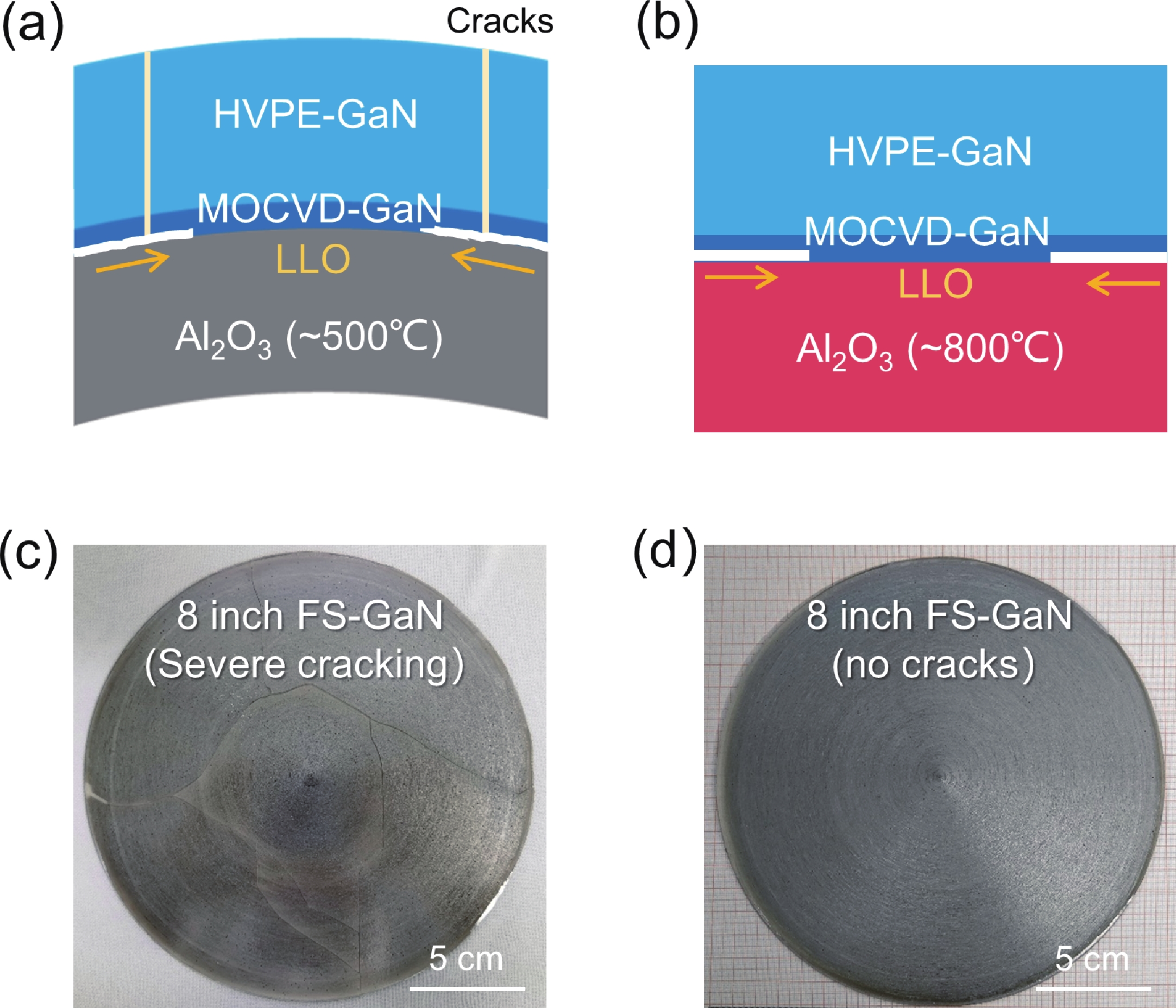 The absence of large-size gallium nitride (GaN) substrates with low dislocation density remains a primary bottleneck for advancing GaN-based devices. Here, we demonstrate the achievement of 8-inch freestanding GaN substrates grown by hydride vapor phase epitaxy. Critical to this achievement is the improvement in gas-flow uniformity, which ensures exceptional thickness homogeneity and enables the crack-free growth of GaN. After laser lift-off (LLO) separation, the freestanding GaN substrate exhibits superior crystal quality, evidenced by full width at half maximum values of 68 and 54 arcsec for X-ray diffraction rocking curves of (002) and (102) planes, alongside a low dislocation density of 1.6 × 106 cm−2. This approach establishes a robust pathway for the production of large-size GaN substrates, which are essential for advancing next-generation power electronics and high-efficiency photonics.