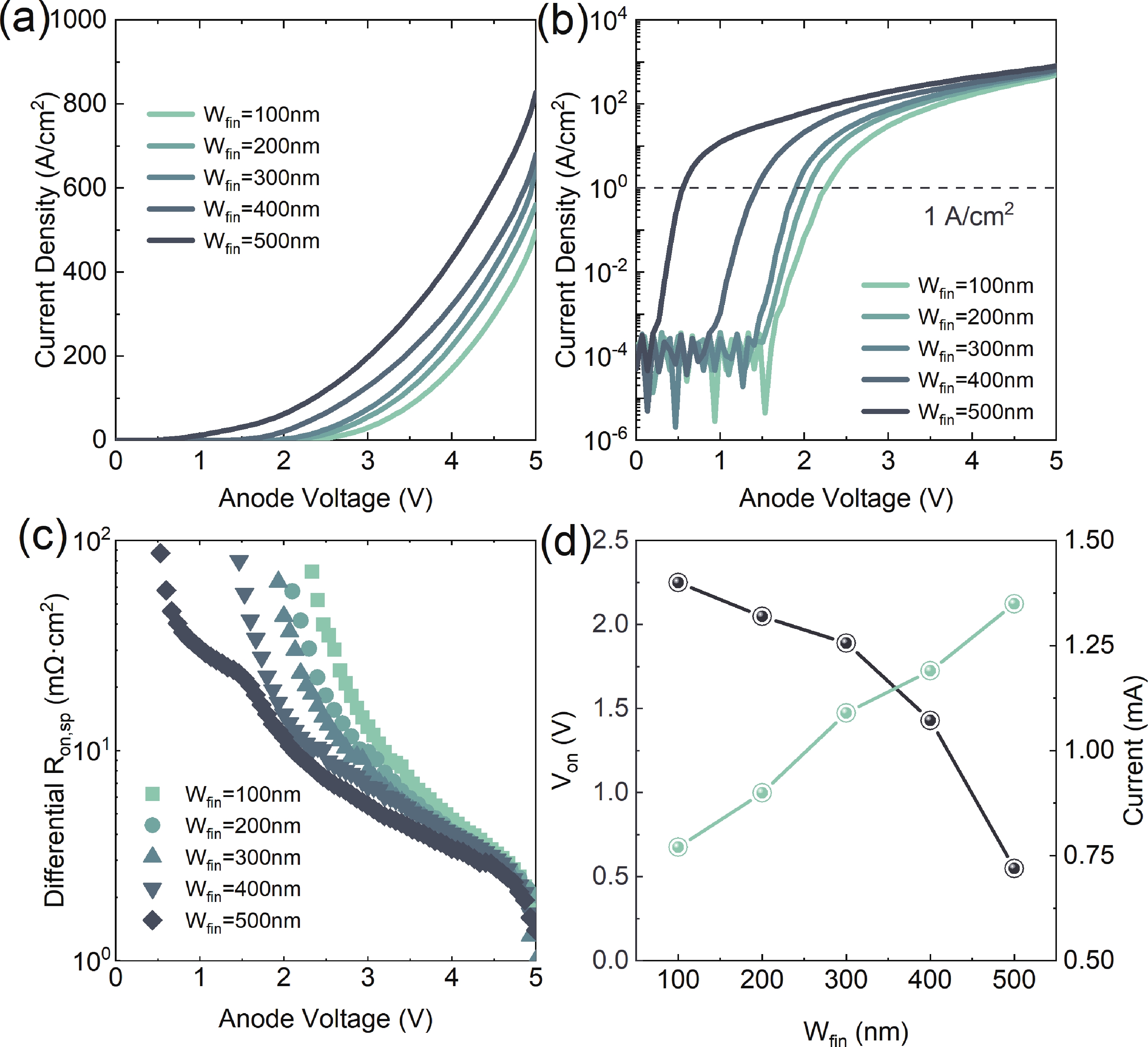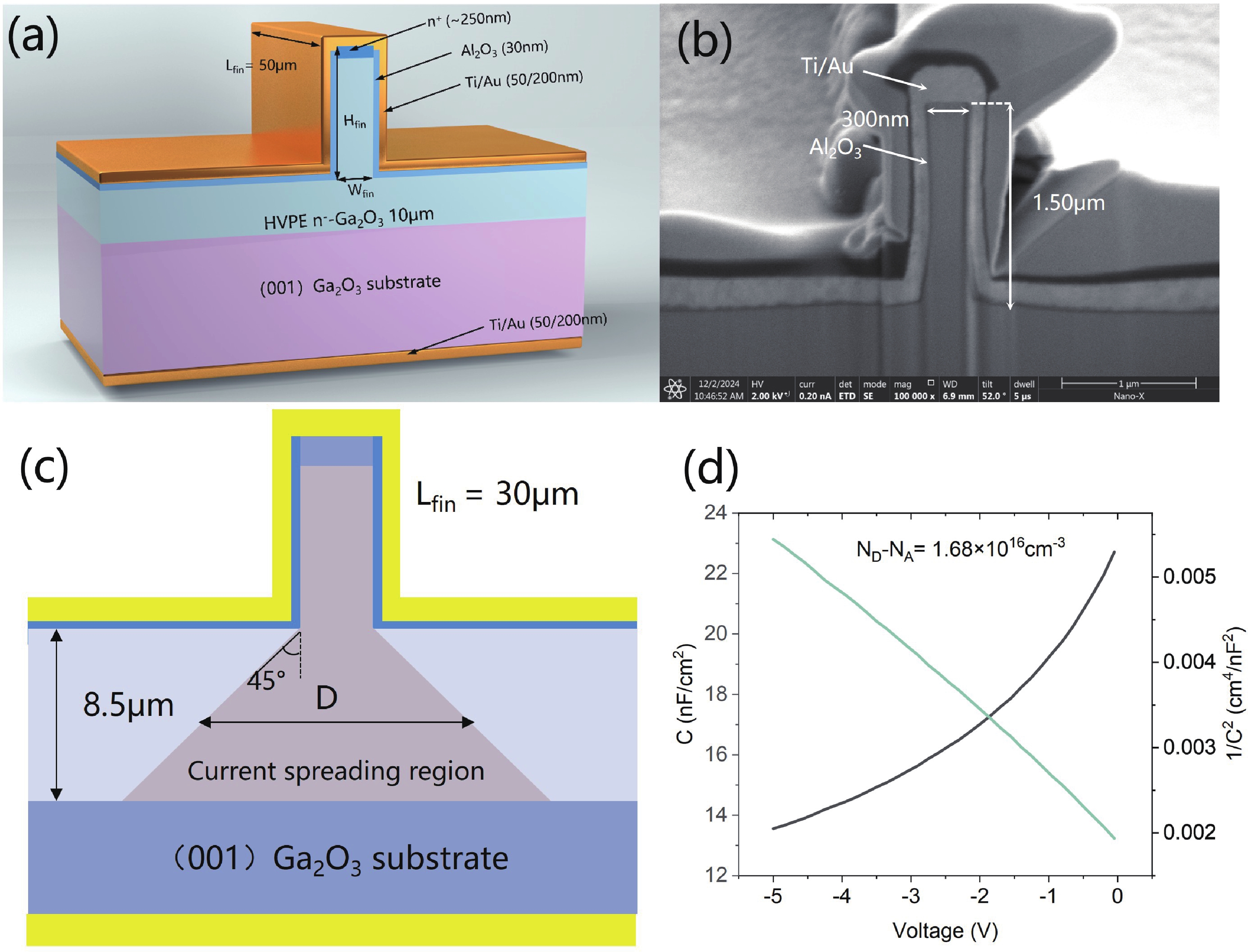 This study presents a β-Ga2O3 diode featuring a Fin-channel structure and an anode ohmic contact. The device turn-off is facilitated by the depletion effect induced by the work function difference between the sidewall metal and β-Ga2O3. As the forward bias increases, electron accumulation occurs on the Fin-channel sidewalls, reducing the on-resistance and improving the forward characteristics. Moreover, the device exhibits the reduced surface field (RESURF) effect, similar to trench schottky barrier diodes (SBDs), which shifts the electric field at the fin corners and enhances the breakdown voltage. For a device with a 100 nm fin width (Wfin), we achieved a breakdown voltage (BV) of 1137 V, a specific on-resistance (Ron,sp) of 1.8 mΩ·cm2, and a power figure of merit (PFOM) of 0.72 GW/cm2. This work expands the fabrication approach for β-Ga2O3-based devices, advancing their potential for high-performance applications.