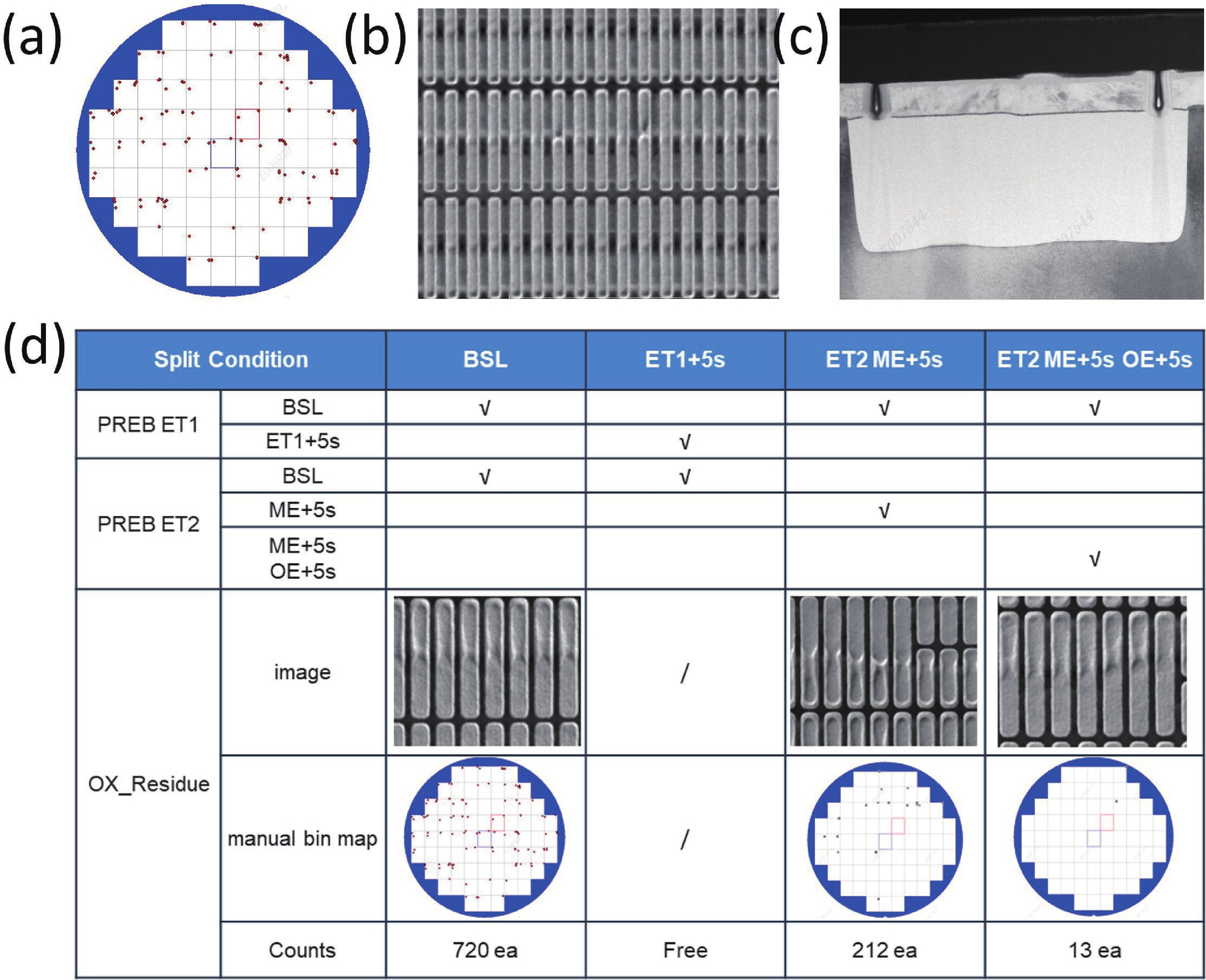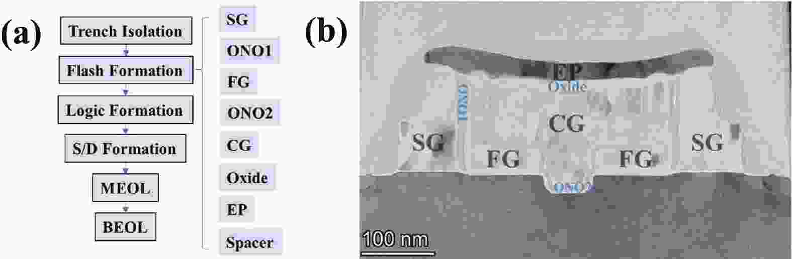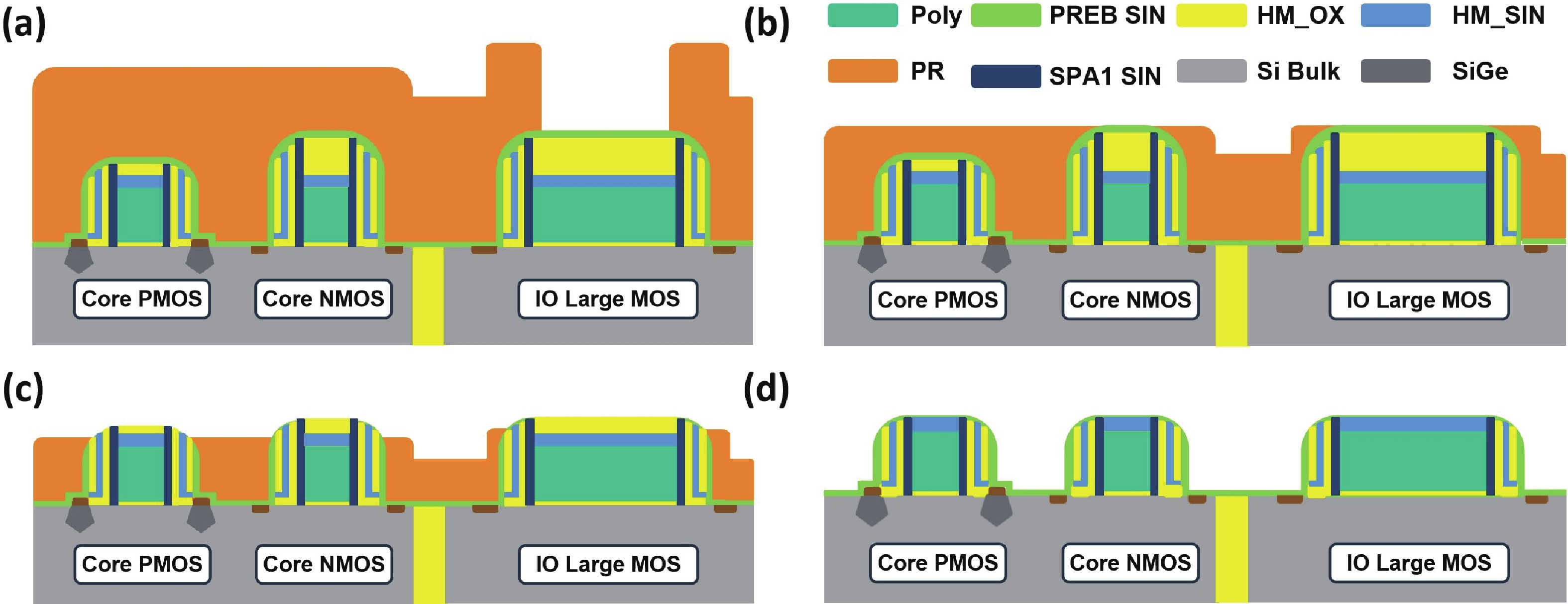 The introduction of high-k/metal gate (HK/MG) technology enables independent tuning of N-type metal−oxide−semiconductor (NMOS) and P-type metal−oxide−semiconductor (PMOS) threshold voltages, facilitating advanced nodes and improving overall chip performance. However, severe pattern loading effects during PMOS device fabrication pose challenges in dummy poly removal. This work reports the optimization of the photoresist etch back (PREB) process, providing a wider process window for subsequent AL CMP. By tuning the PR coating uniformity to 1.6% and applying four-zone electrostatic chuck (ESC) temperature control, the wafer-level uniformities of PR, SiN, and SiO2 were reduced to 6.3%, 2.3%, and 5.1%, respectively. An optimized over etch (OE) recipe with a high selectivity of PR : SiN : SiO2 ≈ 1 : 1 : 6 effectively balanced gate height loading between N- and PMOS regions. Furthermore, precise EB1 time tuning enabled defect removal, while advanced KLA inspection ensured early detection of critical failure modes. Collectively, these measures establish a robust and stable PREB process for advanced logic device fabrication.