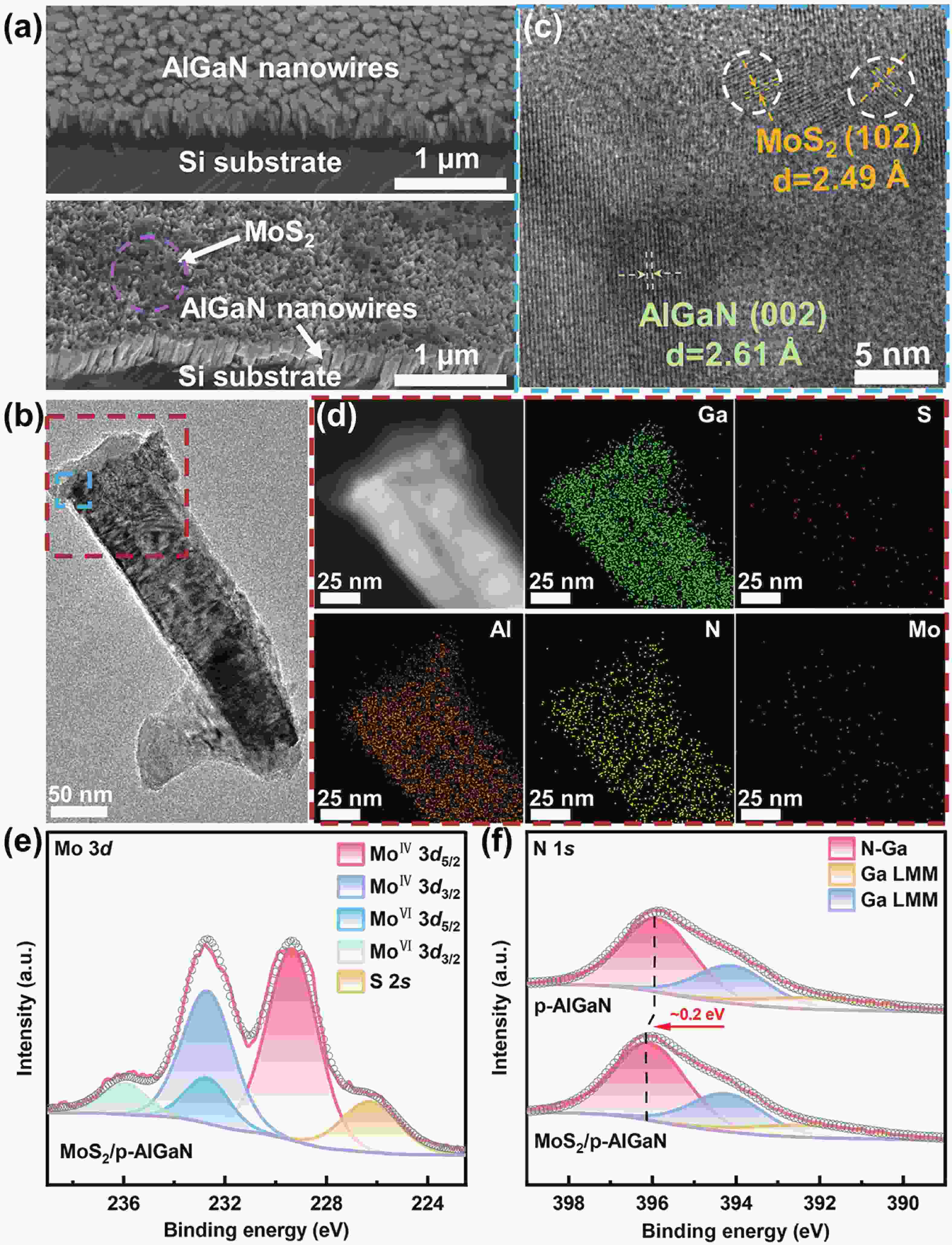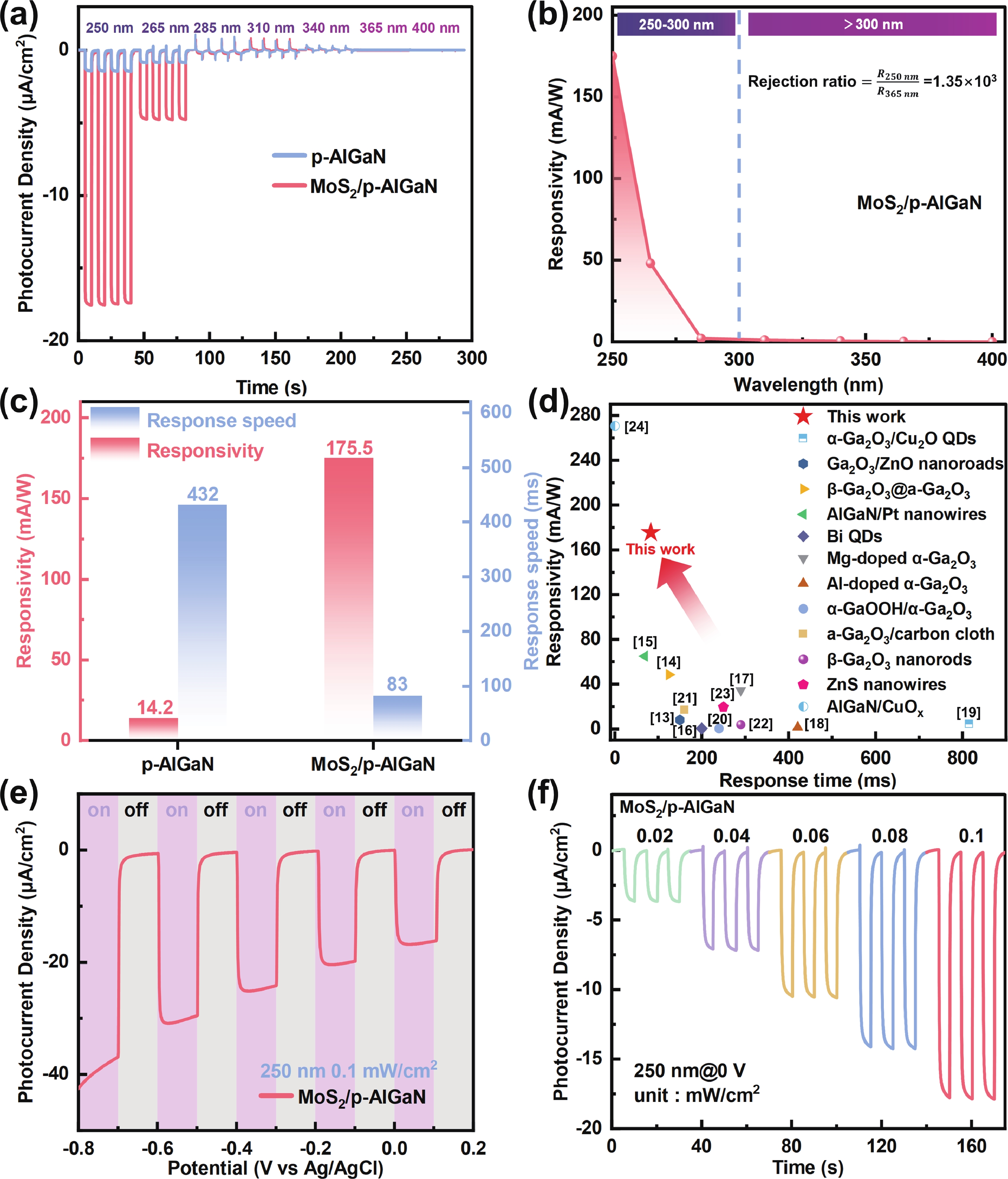 Solar-blind ultraviolet photodetectors (UV PDs), capable of detecting UV radiation without interference from sunlight, have attracted significant interest. Herein, we propose a 0D/1D heterostructure for UV PDs, which was fabricated by spin-coating MoS2 quantum dots onto p-AlGaN nanowires. The device achieves a high responsivity of 175.5 mA/W and a fast response speed of 83 ms at 250 nm illumination under self-powered mode, which improved nearly 1235% and 521% after MoS2 decoration, respectively. These improvements can be attributed to the type-Ⅱ heterostructure formed between p-AlGaN and MoS2, which facilitates enhanced charge separation and carrier transport. Later, we demonstrate the implementation of this device in optical communication, achieving high-accuracy transmission of "GaN" ASCII code signals. Such a 0D/1D heterostructure provides an effective strategy for high-performance solar-blind UV PD.