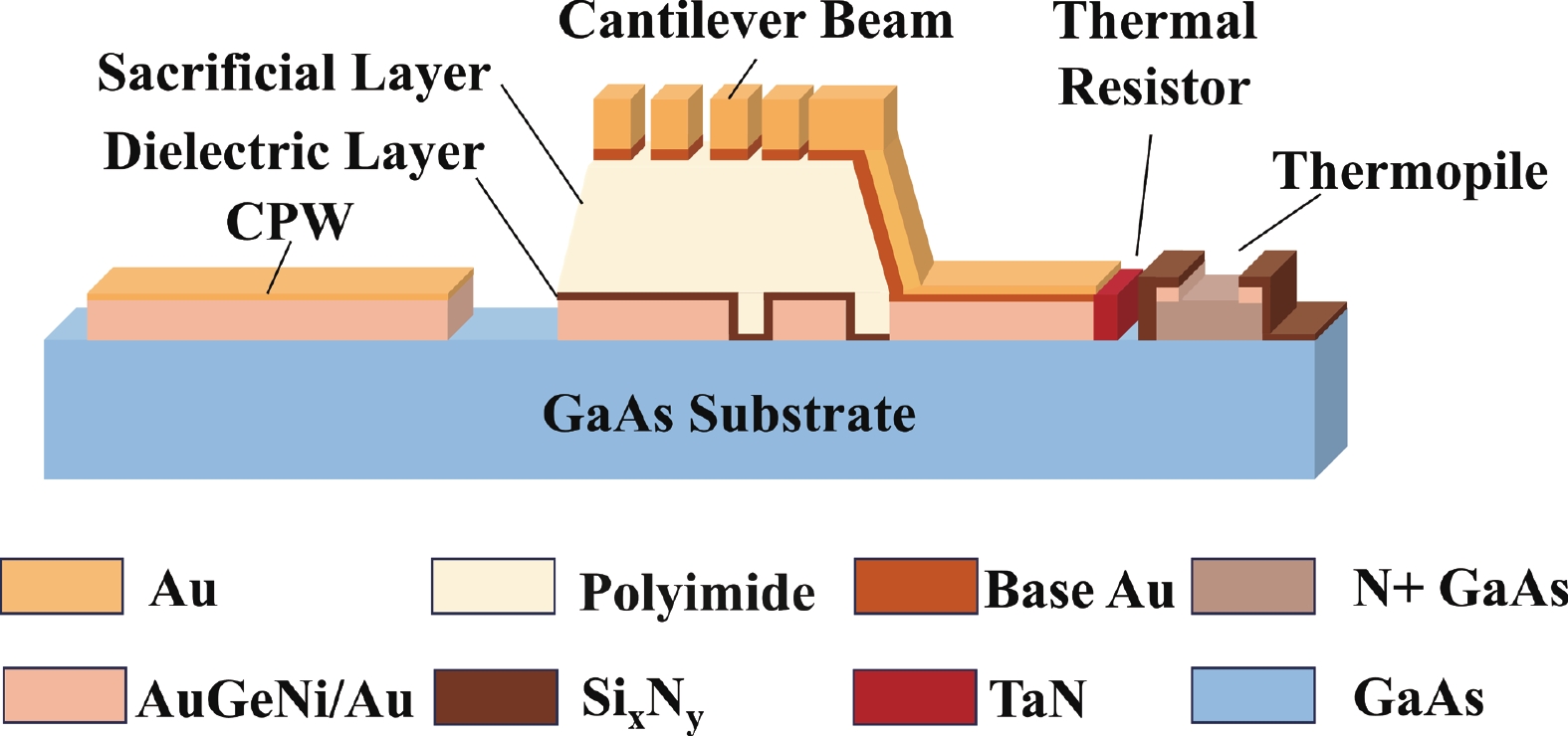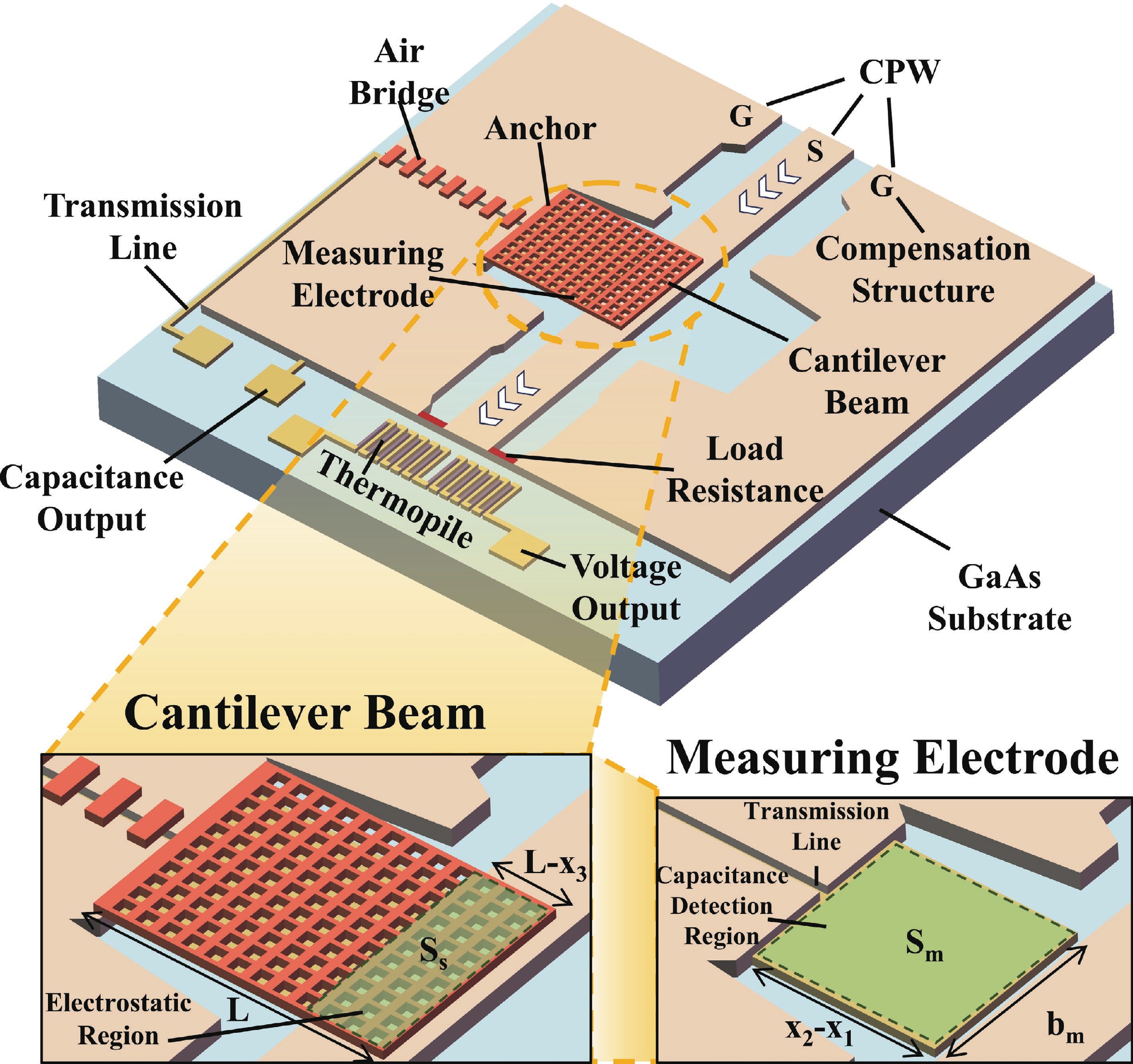To improve the theoretical prediction accuracy of static mechanical quantities in MEMS cantilever beams for microwave power detection chips, a distributed static model is proposed based on the deflection equation. An analytical framework is established through the precise characterization of cantilever beam bending. The framework can accurately extract key electromechanical parameters, and the correlation between these parameters and geometric changes is systematically studied. Results show that the pull-in voltage increases with the gap but decreases with the length. The predicted pull-in voltage indicates a relative error of only 6.5% between the distributed static model and the simulation, which is significantly lower than that of the other two models. The overload power and sensitivity are also analyzed to facilitate performance trade-offs in chip design. The measured return loss varies between −66.46 and −10.56 dB over the 8−12 GHz frequency band, exhibiting a characteristic V-shaped trend. Moreover, the measured sensitivity of 66.5 fF/W closely matches the theoretical value of 69.3 fF/W, showing a relative error of 5.6%. These findings confirm that the distributed model outperforms the other two in terms of both accuracy and physical realism, thereby providing important reference for the design of microwave power detection chips.