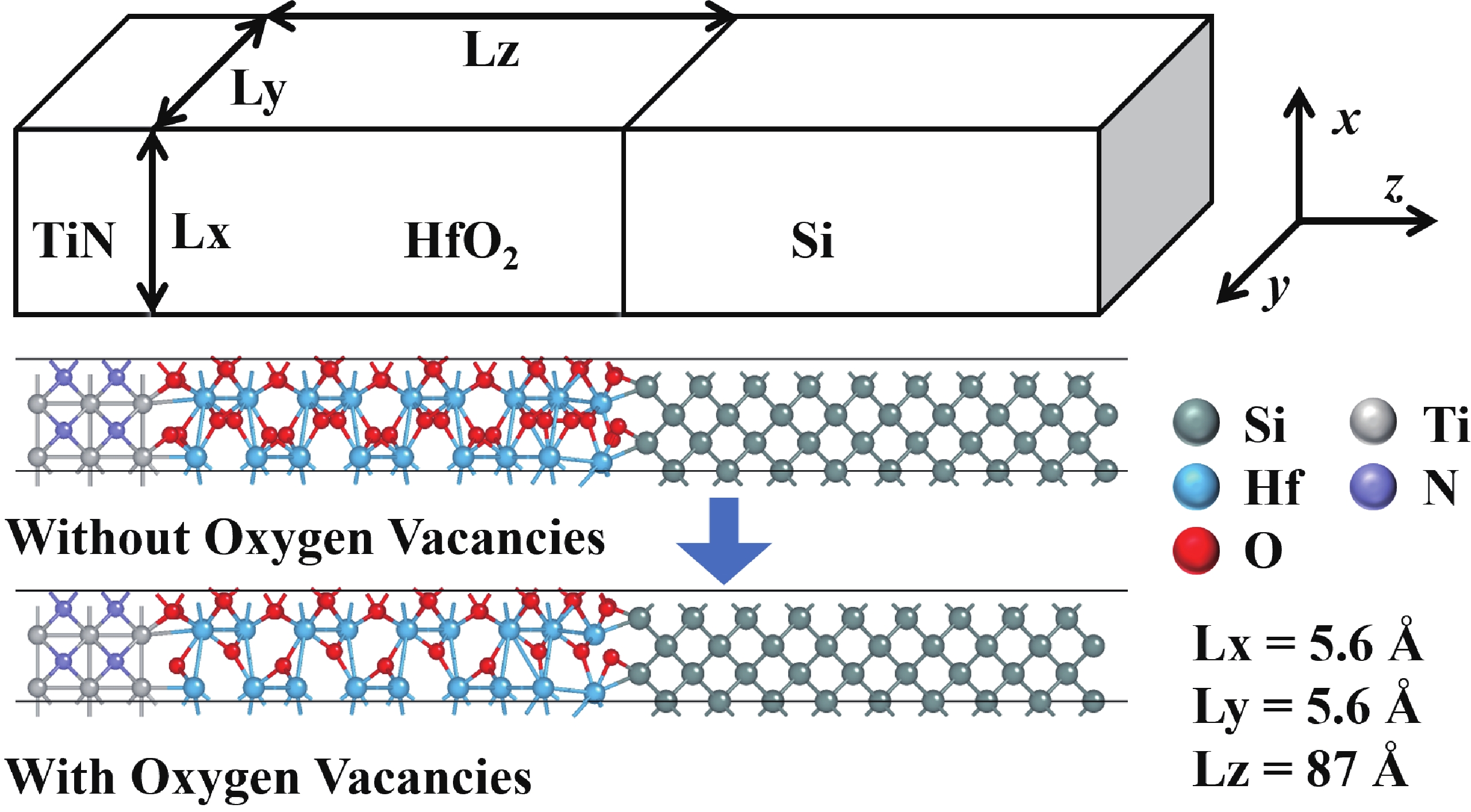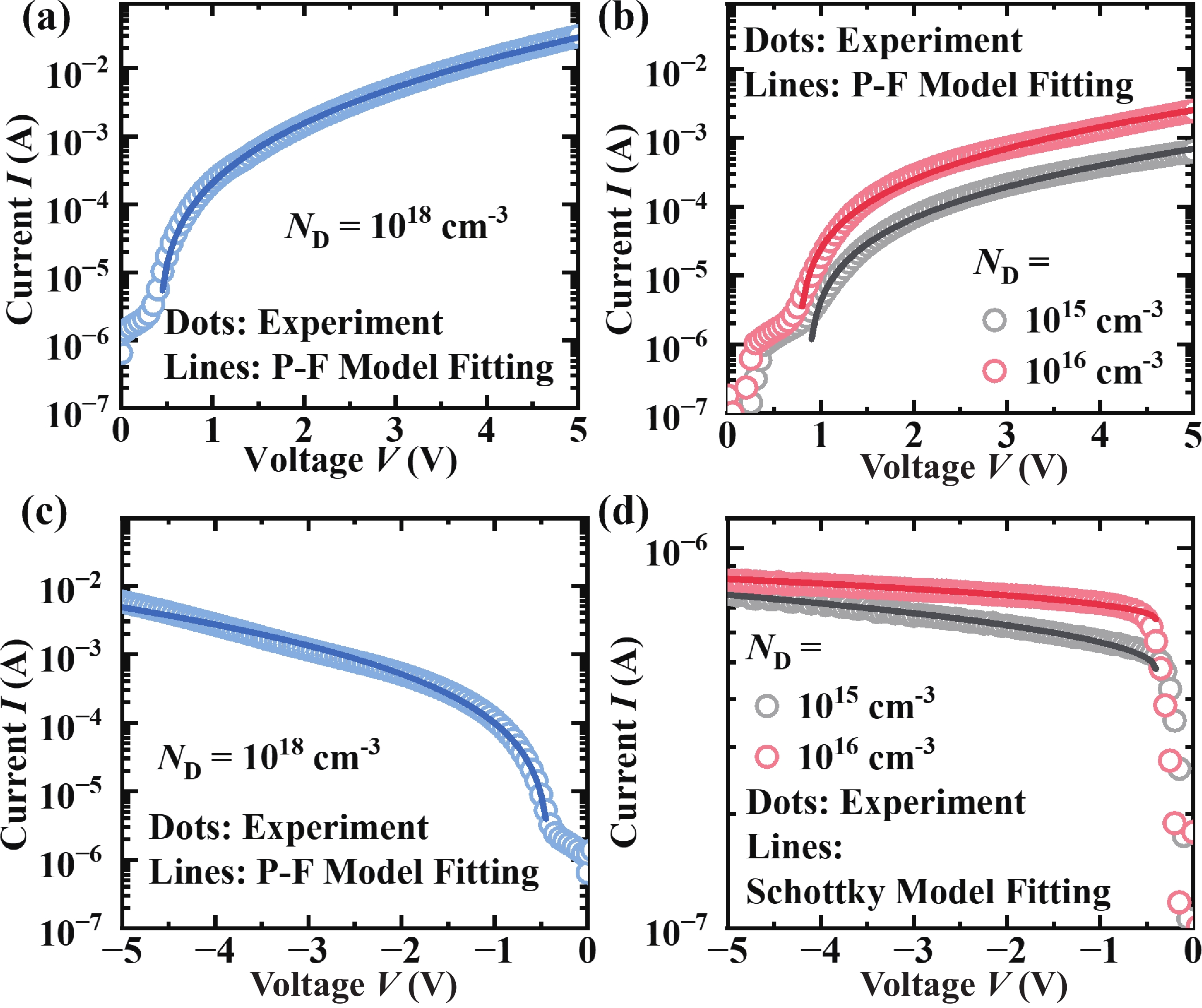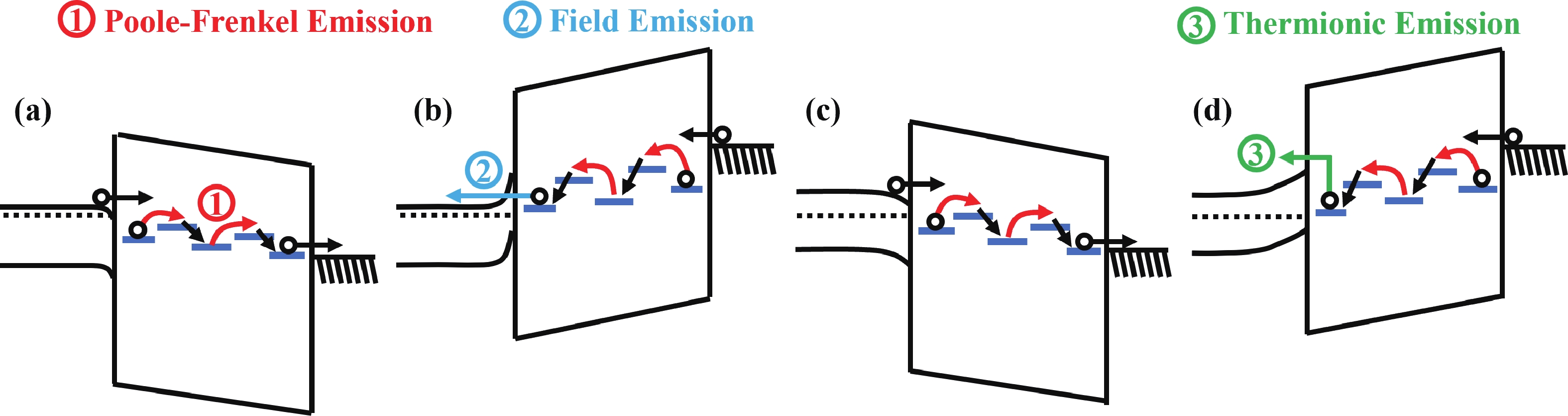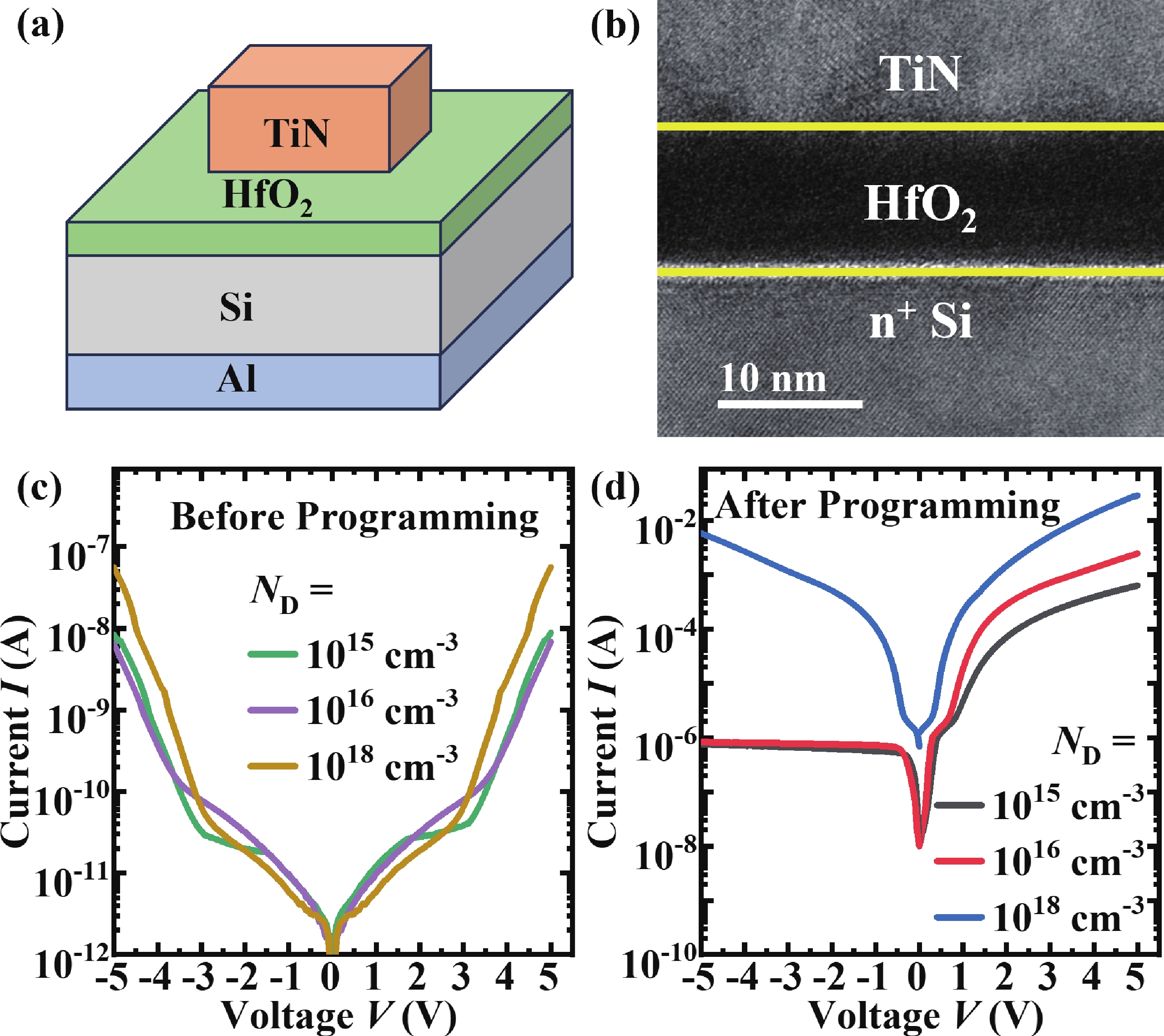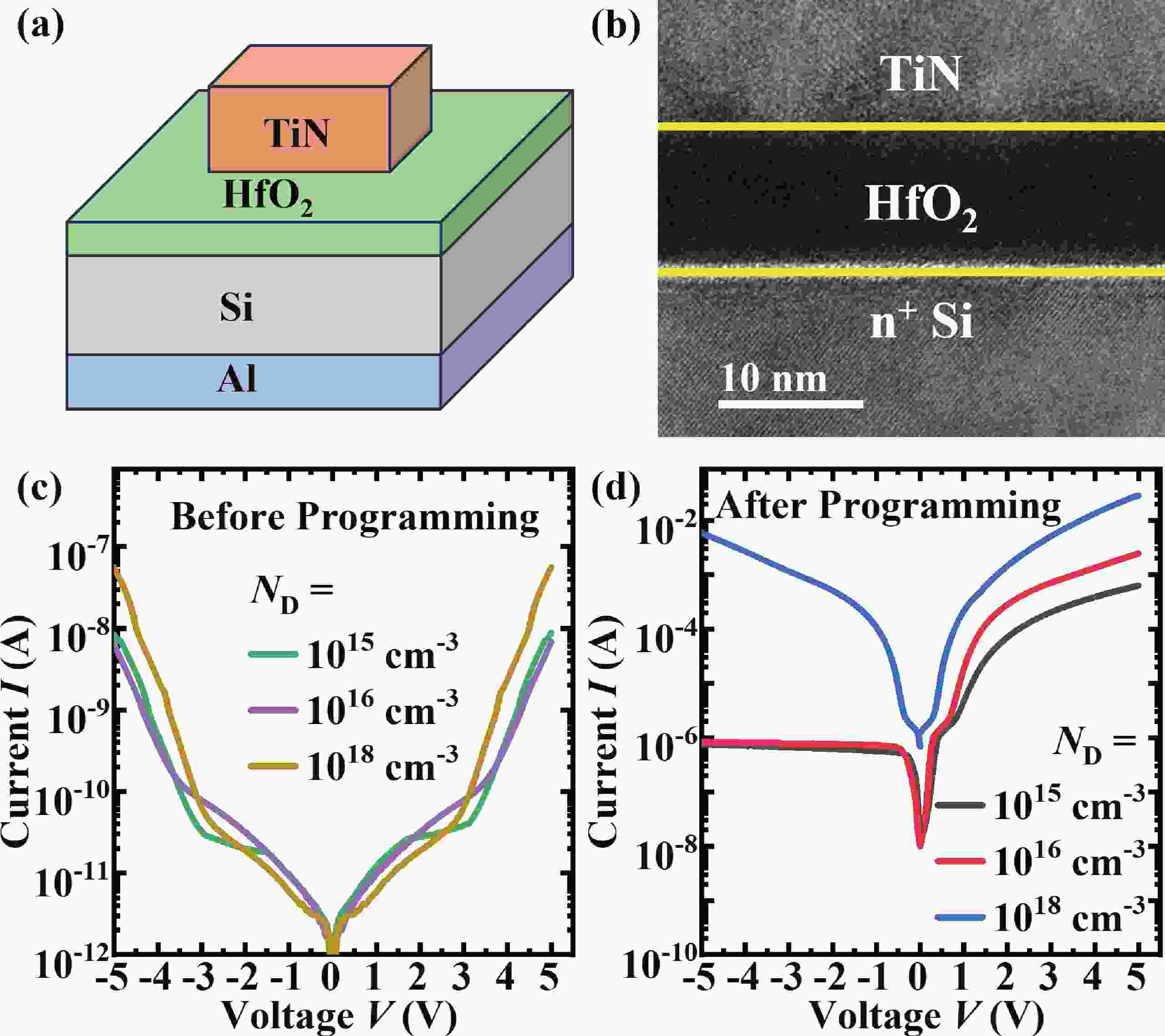 In this work, the oxide-based programmable diodes (PDs) with structure of TiN/HfO2/Si/Al are fabricated, and its electron transport mechanisms are investigated. Electrical measurements results depicted that the conduction and rectification performance of oxide-based PDs are mainly controlled by the interface between oxygen vacancies (VOs) consisted filament and semiconductor electrode. The local density of state in filament and band-bending of the PDs are calculated by first-principal simulation. The electron transport in oxide PDs is dominated by Poole−Frenkel emission under forward bias, while under negative bias, the PDs behave like a reverse Schottky-diode. These mechanisms research is necessary for device optimization and circuit design of oxide-based PDs.