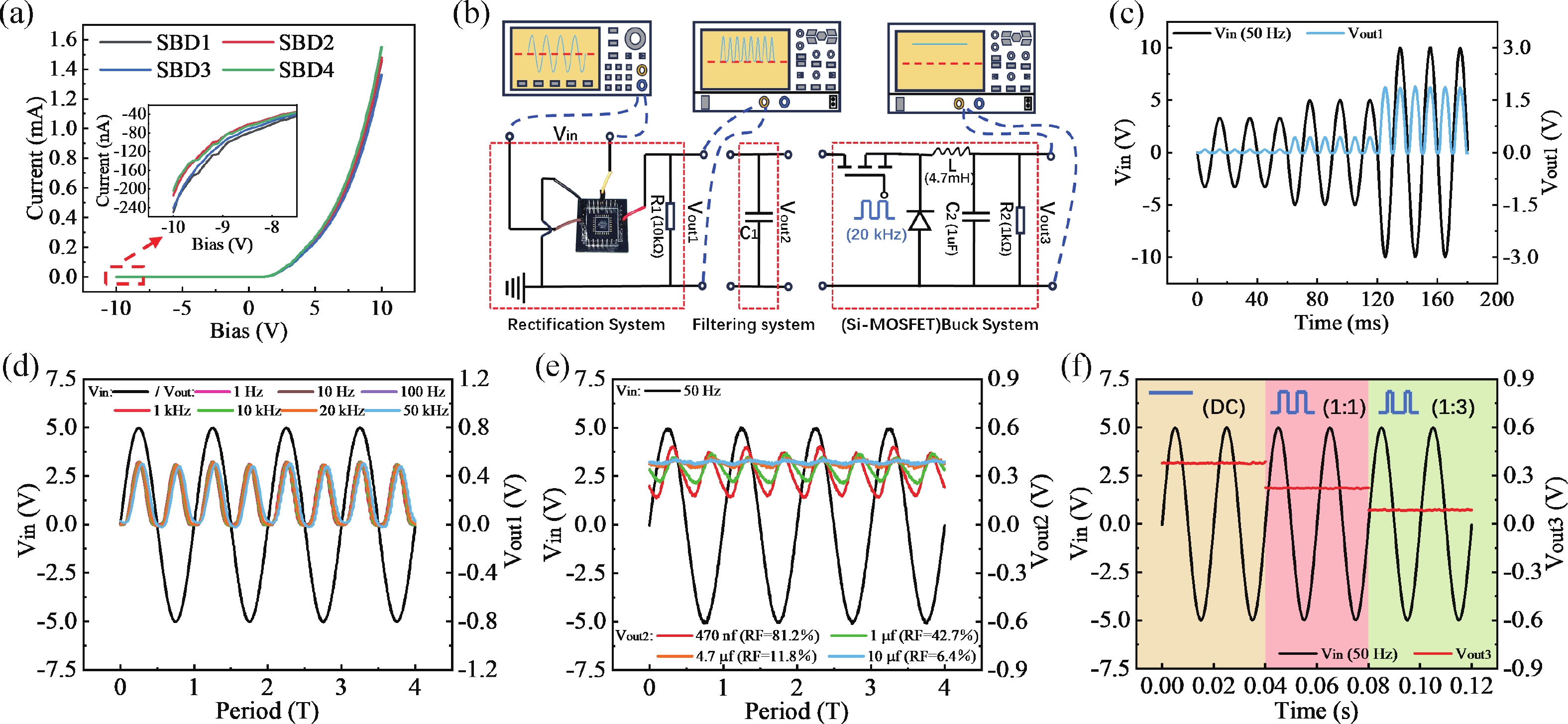 This paper demonstrated a monolithically integrated 200 nm-ultrathin amorphous-Ga2O3 vertical SBD-based bridge rectifier and its hybrid buck conversion system with a Si-MOSFET. The fabricated vertical Ga2O3 SBD exhibits excellent characteristics and a high breakdown electric field strength of 1.35 MV/cm. The bridge rectifier circuit maintains stable operation at high frequencies of 50 kHz. And the hybrid buck system composed of the Ga2O3 bridge rectifier and Si-MOSFET achieves adjustable step-down voltage output under the conditions of a 20 kHz switching frequency of Si-MOSFET and 50 Hz Vin. This work validates the practical value of Ga2O3 rectifiers in high-frequency conversion systems.