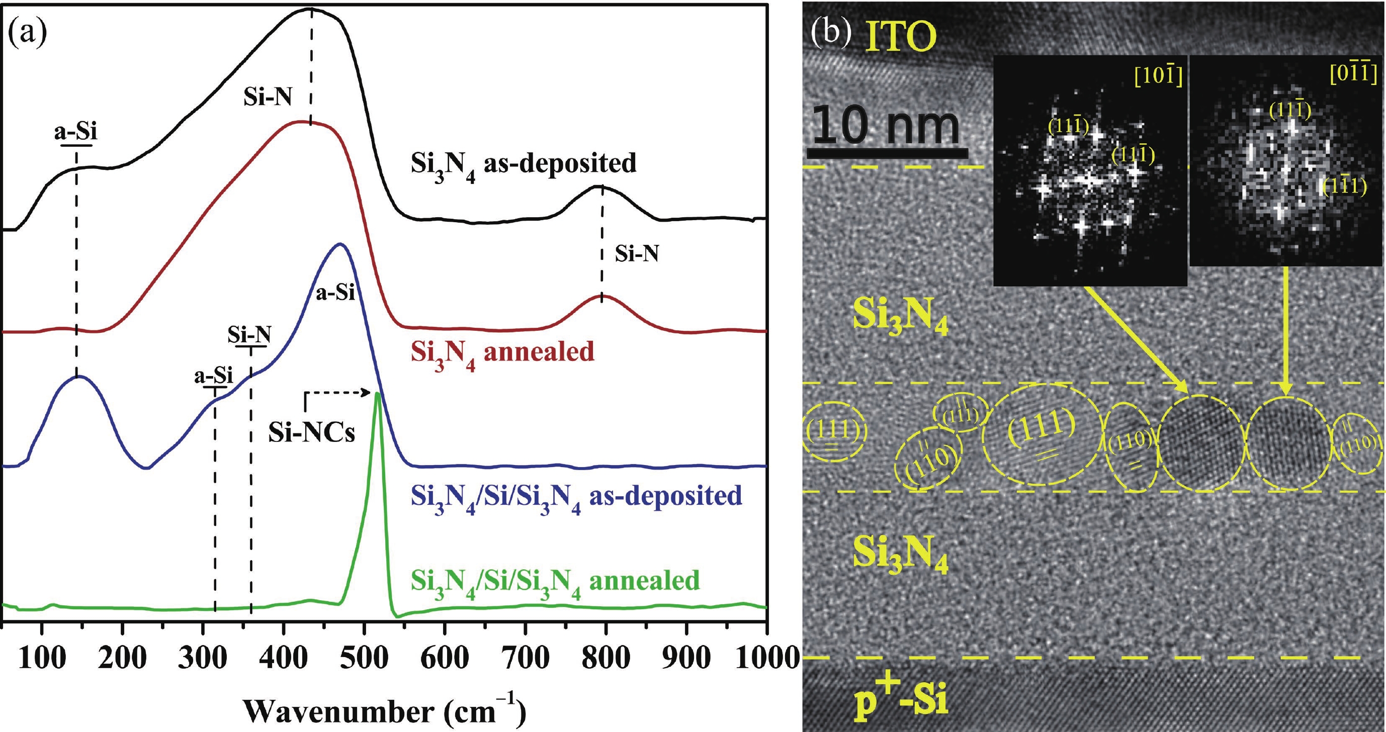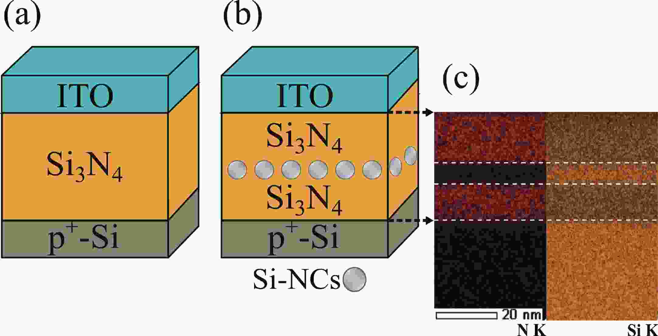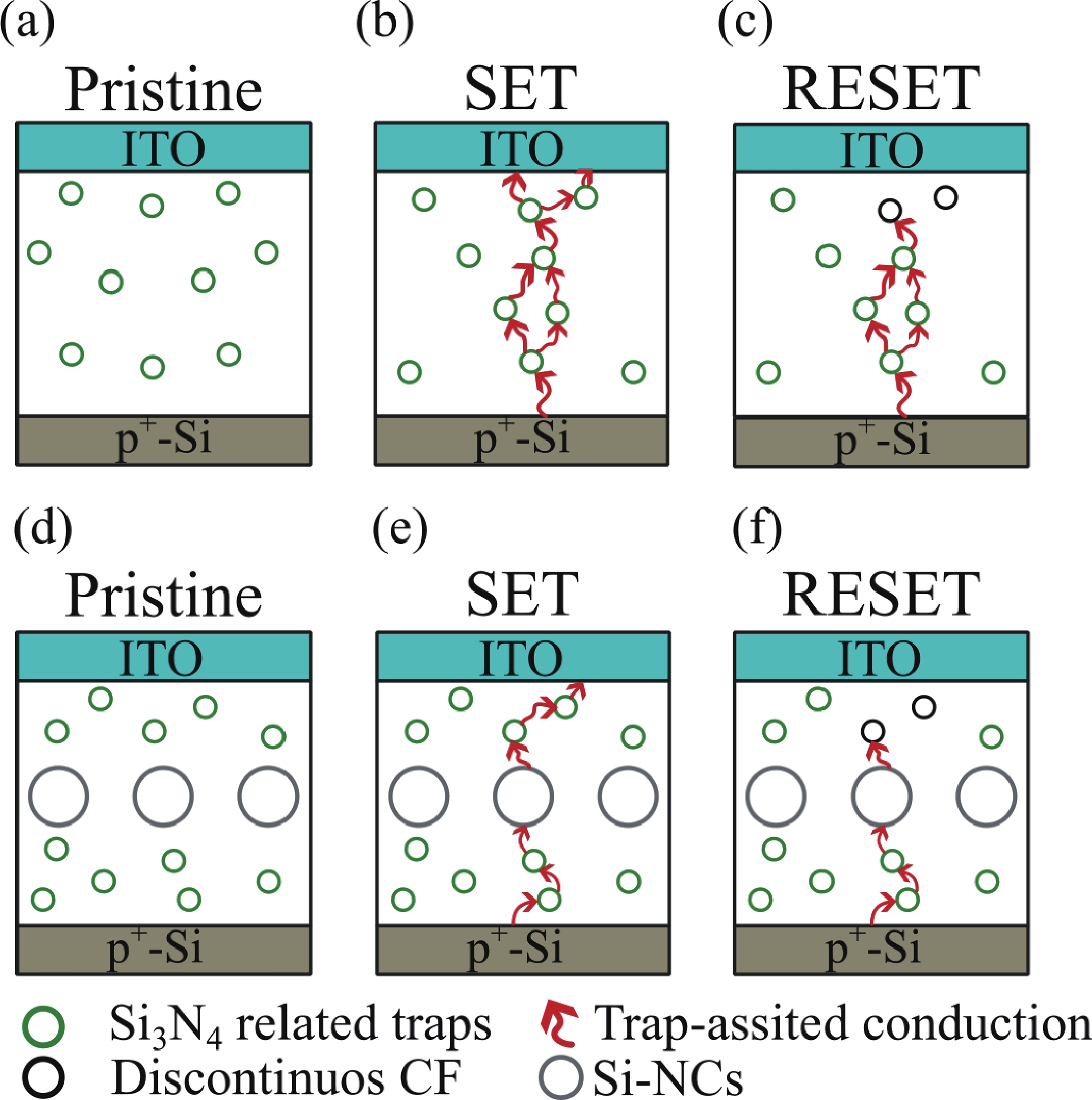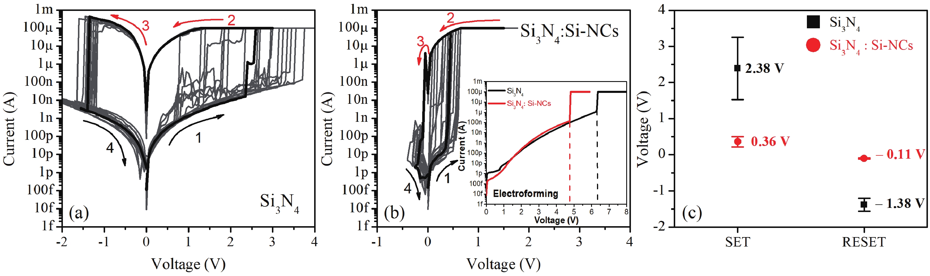 This work focuses on the study of the resistive switching (RS) properties of metal−insulator−semiconductor (MIS)-like structures based on silicon nitride (Si3N4) and Si3N4 with embedded silicon nanocrystals (Si-NCs) as the switching layer for the development of memristor devices. The formation of Si-NCs in the Si3N4 matrix, along with its chemical composition, was confirmed by Raman, transmission electron microscope (TEM), and energy-dispersive X-ray spectroscopy (EDS) analyses. The introduction of Si-NCs within the Si3N4 improved the performance of the devices. For Si3N4-based memristor devices, SET and RESET voltages of 2.38 and −1.38 V were obtained, respectively, while these values were reduced to 0.36 V (SET) and −0.11 V (RESET) for Si3N4:Si-NCs-based RS devices. Both RS devices exhibit at least 180 RS cycles, but with an increased ON/OFF ratio from 103 (Si3N4) to 106 when Si-NCs are embedded. The retention time analysis shows that the low resistance state (LRS) and the high resistance state (HRS) are stable for up to 104 s. The analysis of the conduction mechanism indicates that HRS is driven by the space-charge-limited conduction (SCLC), and the LRS by an Ohmic conduction mechanism. A model of the RS mechanism was proposed to understand the role of Si-NCs in the dielectric matrix.