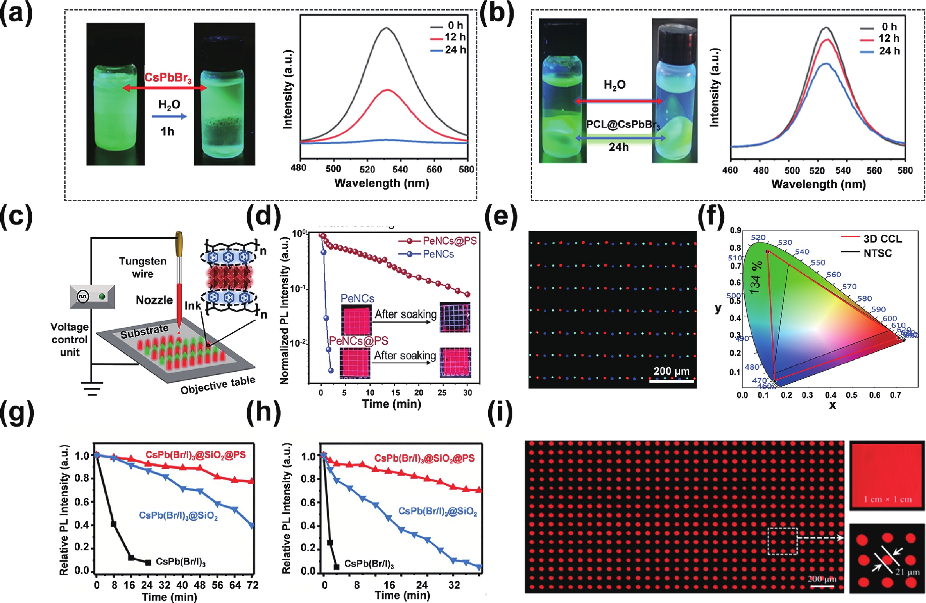 Electrohydrodynamic (EHD) inkjet printing has emerged as a powerful micro-/nanofabrication technique for high-resolution perovskite quantum dot (PeQD) color-conversion layers, offering precise control over pixel morphology, dimensions, and composition. This review systematically examines the mechanisms of cone-jet and electrostatic-attraction modes in EHD printing, highlighting recent advances in PeQD ink design, solvent and ligand engineering, and printing parameter optimization. Perovskite precursor and colloidal inks are discussed in detail, emphasizing strategies to enhance droplet ejection stability, suppress coffee-ring effects, and achieve uniform, high-luminescence pixels. Ligand exchange, dual-ligand passivation, and core−shell or polymer encapsulation are shown to effectively mitigate ion migration, surface defects, and environmental degradation, thereby improving photoluminescence efficiency and stability. Multi-channel and multi-nozzle EHD printing systems enable dynamic halide composition control and parallel RGB pixel deposition, facilitating ultrahigh-resolution patterning down to submicron feature sizes. Finally, the review highlights future directions, including synergistic PeQD material synthesis, advanced ink formulation, scalable high-throughput printing, and integration of PeQD color-conversion pixels into full-color micro-LED displays with minimal crosstalk and robust operational stability. These developments collectively demonstrate the immense potential of EHD inkjet printing for next-generation high-performance display technologies.