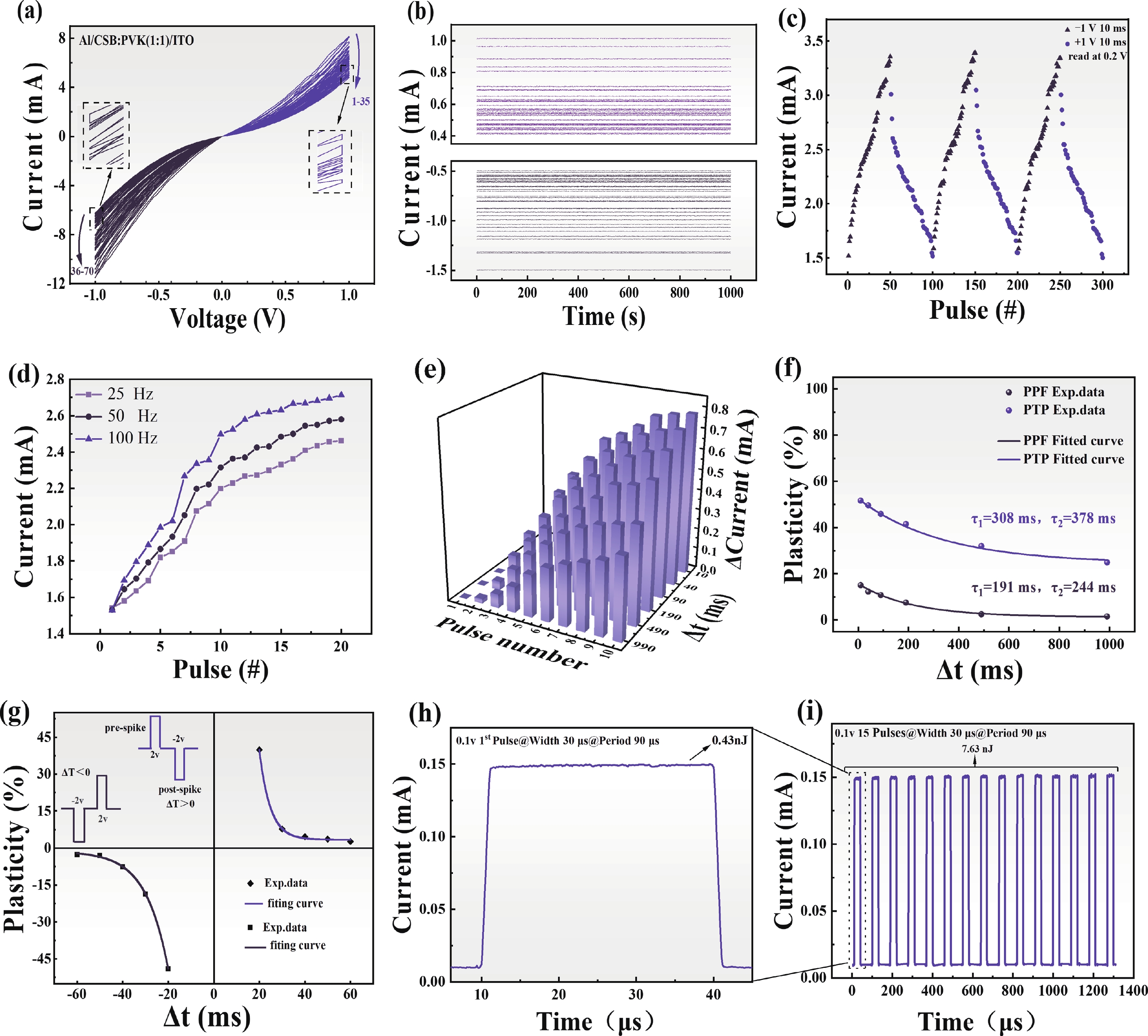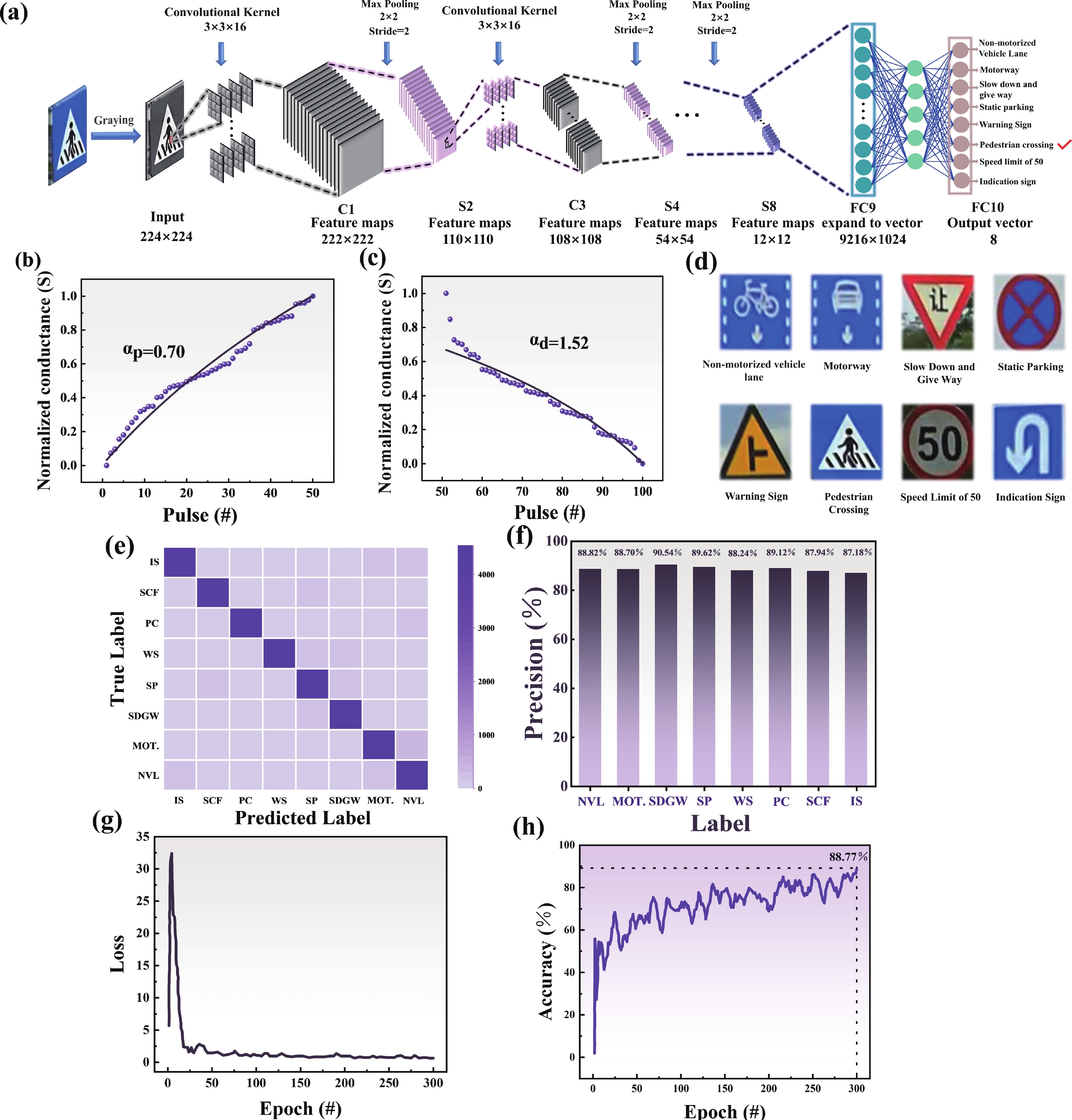 The development of new n-type semiconductors is crucial for the further advancement of electronic and optoelectronic devices. Steamed buns, anciently known as "man tou", mainly made of wheat flour and are one of the staple foods for Chinese people. After being subjected to high-temperature treatment, the steamed buns transformed into carbonized steamed buns (CSB) with porous nanostructures, which exhibit a Hall mobility of up to 1.62 cm2/(V·s), far greater than C60(1.5 × 10−3−2.5 × 10−2 cm2/(V·s)), PCBM (2.0 × 10−7 cm2/(V·s)) and many polymer semiconductors (~10−6−10−2 cm2/(V·s)). A CSB-based bulk heterojunction memristor with a configuration of ITO/the CSB: PVK blends/Al is successfully fabricated. The device shows outstanding history dependent memristive switching performance, with 35 distinguishable conductance states, at a small sweep voltage range of ±1 V. An achieved production yield reaches up to 89%. Upon being subjected to consecutive positive or negative voltage sweeps, the current flowing through the device can be modulated continuously. When the 15 consecutive pulse voltages (pulse amplitude: 0.1 V; pulse width:10 μs, pulse period: 20 μs) were applied to the device, the observed total power consumption was about 7.63 nJ, suggesting a potential in low-energy neuromorphic computing applications. As expected, both the CSB and PVK do not exhibit any memristive effect under the same experimental condition. Utilizing the characteristic that the device can linearly adjust the weights, a simple convolutional neural network for traffic sign recognition was successfully constructed. After 300 rounds of training, the achieved recognition accuracy rate reached 88.77%. This work not only provides a new approach for developing low-cost and readily available organic semiconductors with high Hall mobility, but also offers a new idea for the subsequent development of high-performance artificial synapses and optoelectronic devices using carbonized steamed buns.