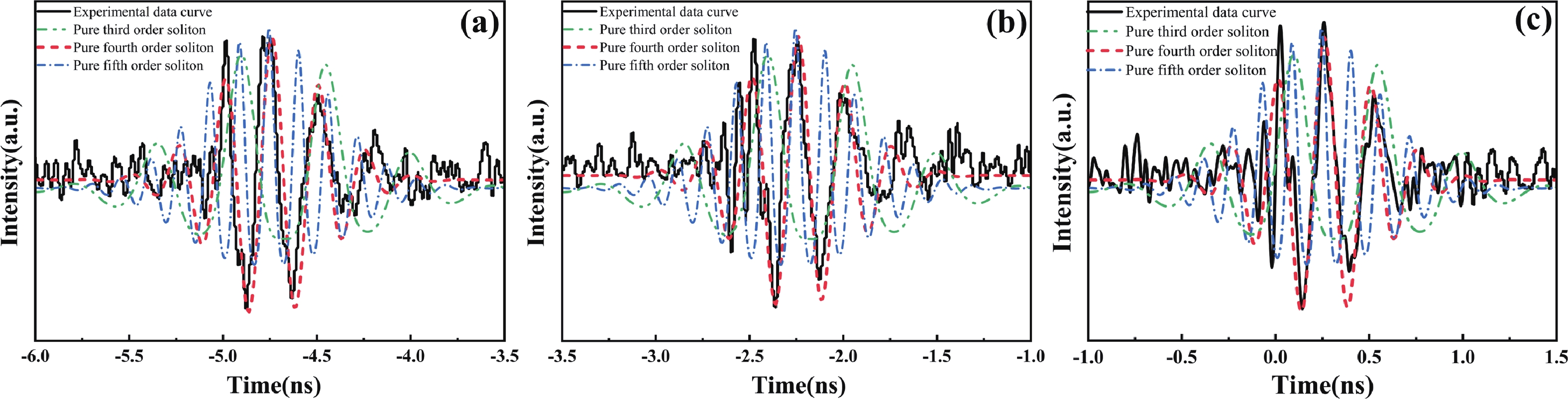 Fig. 11.  (Color online) Multi-peak soliton states during different time periods. (a) −6 to −3.5 ns, (b) −3.5 to −1 ns, (c) −1 to 1.5 ns, when T = 20 °C,Va = −0.4 V,Ig = 220 mA).