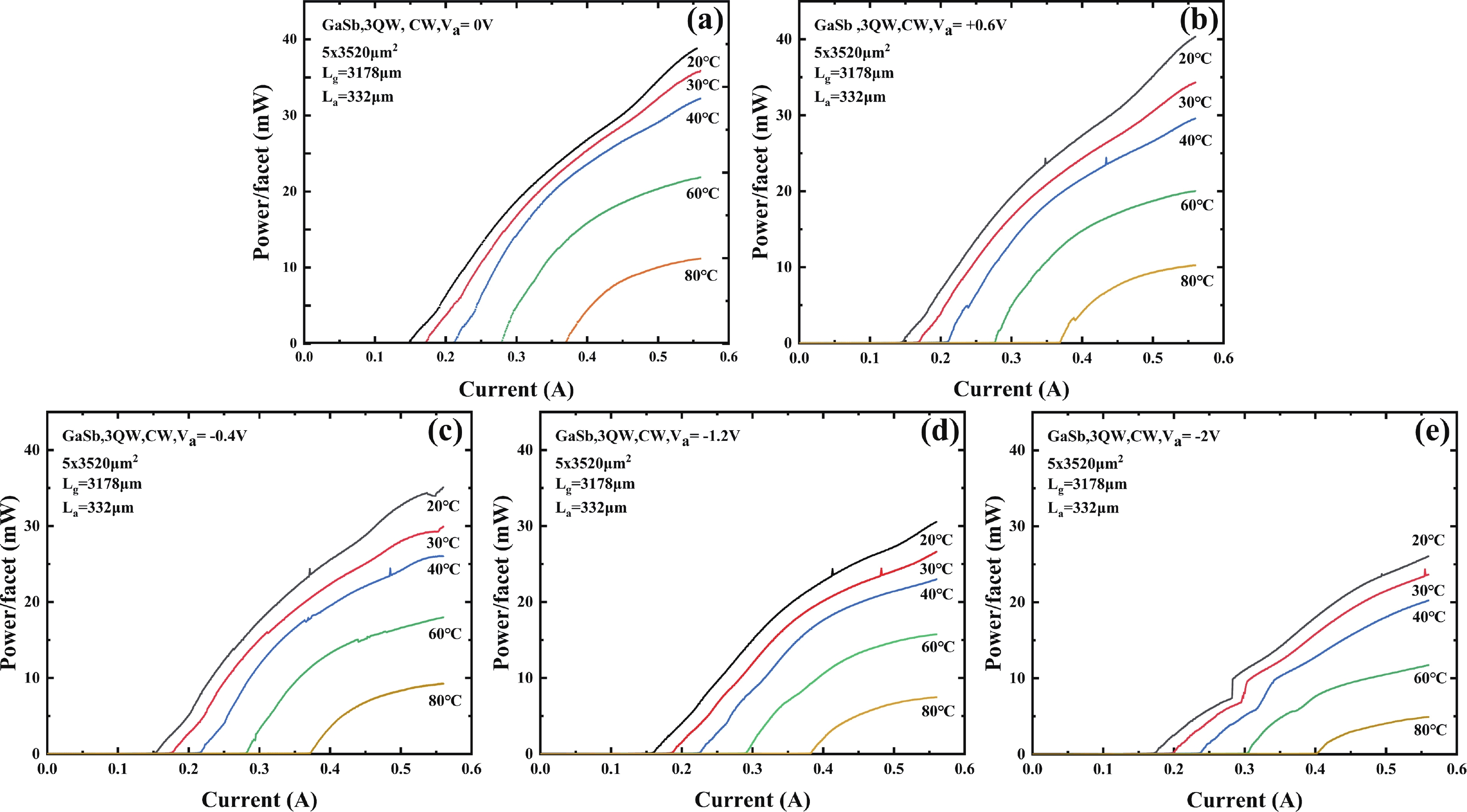 Fig. 3.  (Color online) P−I curves of integrated optical chip at different Va and temperatures (a) Va = 0 V, 20−80 °C; (b) Va = +0.6 V, 20−80 °C; (c) Va = −0.4 V, 20−80 °C; (d) Va = −1.2 V, 20−80 °C; (e)Va = −2 V, 20−80 °C.