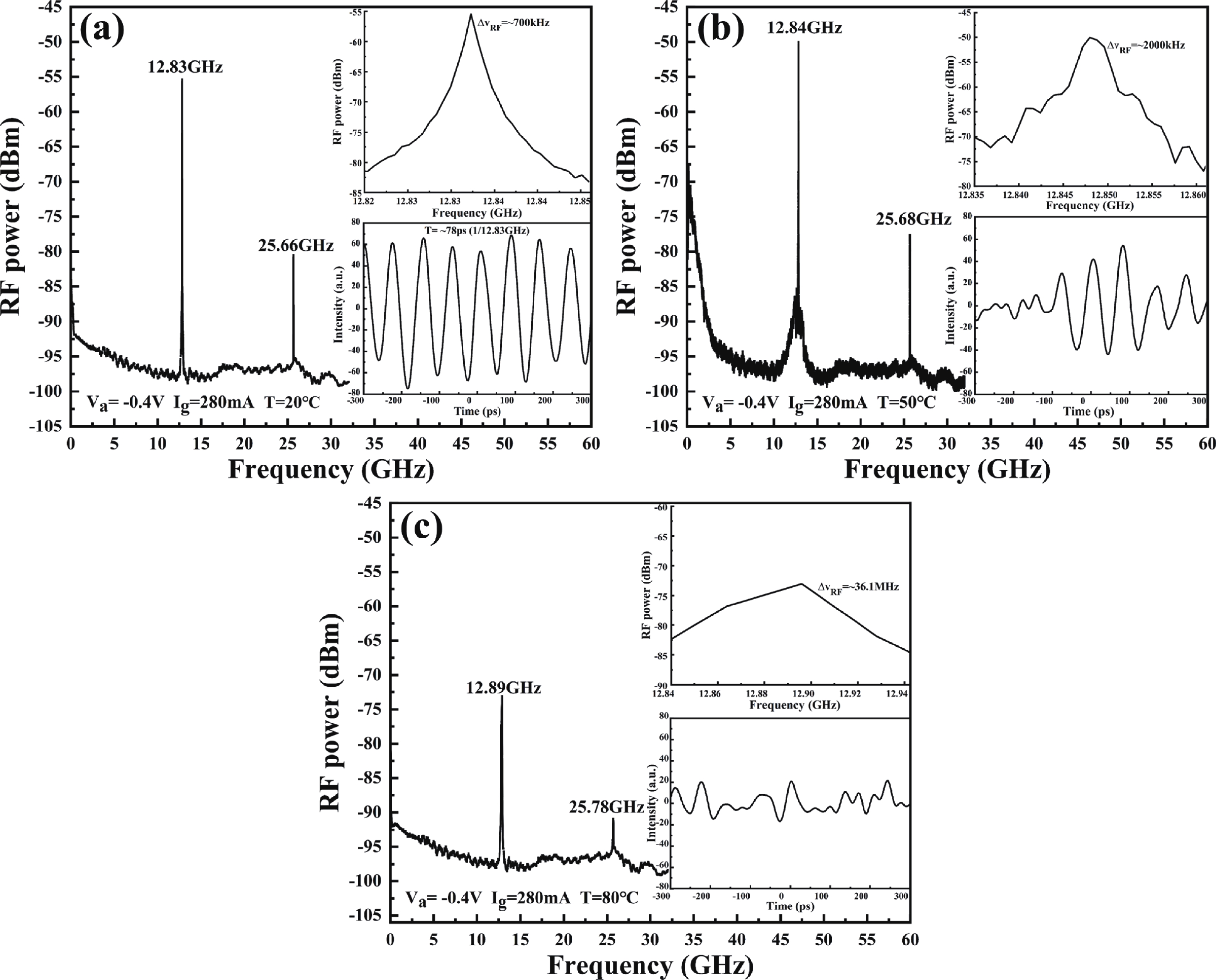 Fig. 5.  Frequency spectra at different temperatures ((a) 20 °C, (b) 50 °C, (c) 80 °C; the upper right inset is the fundamental frequency peak detail, and the lower right inset is the optical pulse sequence signals; RBW: 32 MHz, VBW: 32 MHz).