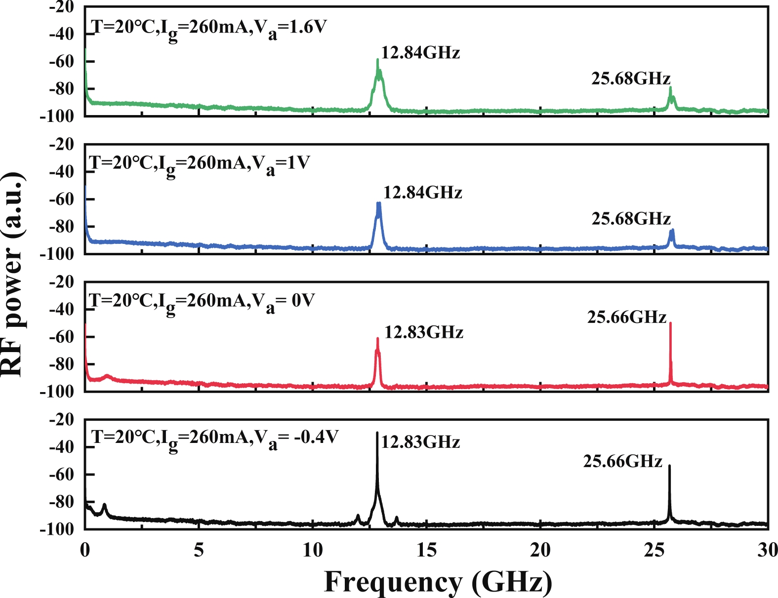 Fig. 7.  (Color online) Frequency spectra at different Va (T = 20 °C, Ig = 260 mA; RBW: 800 kHz, VBW: 800 kHz).