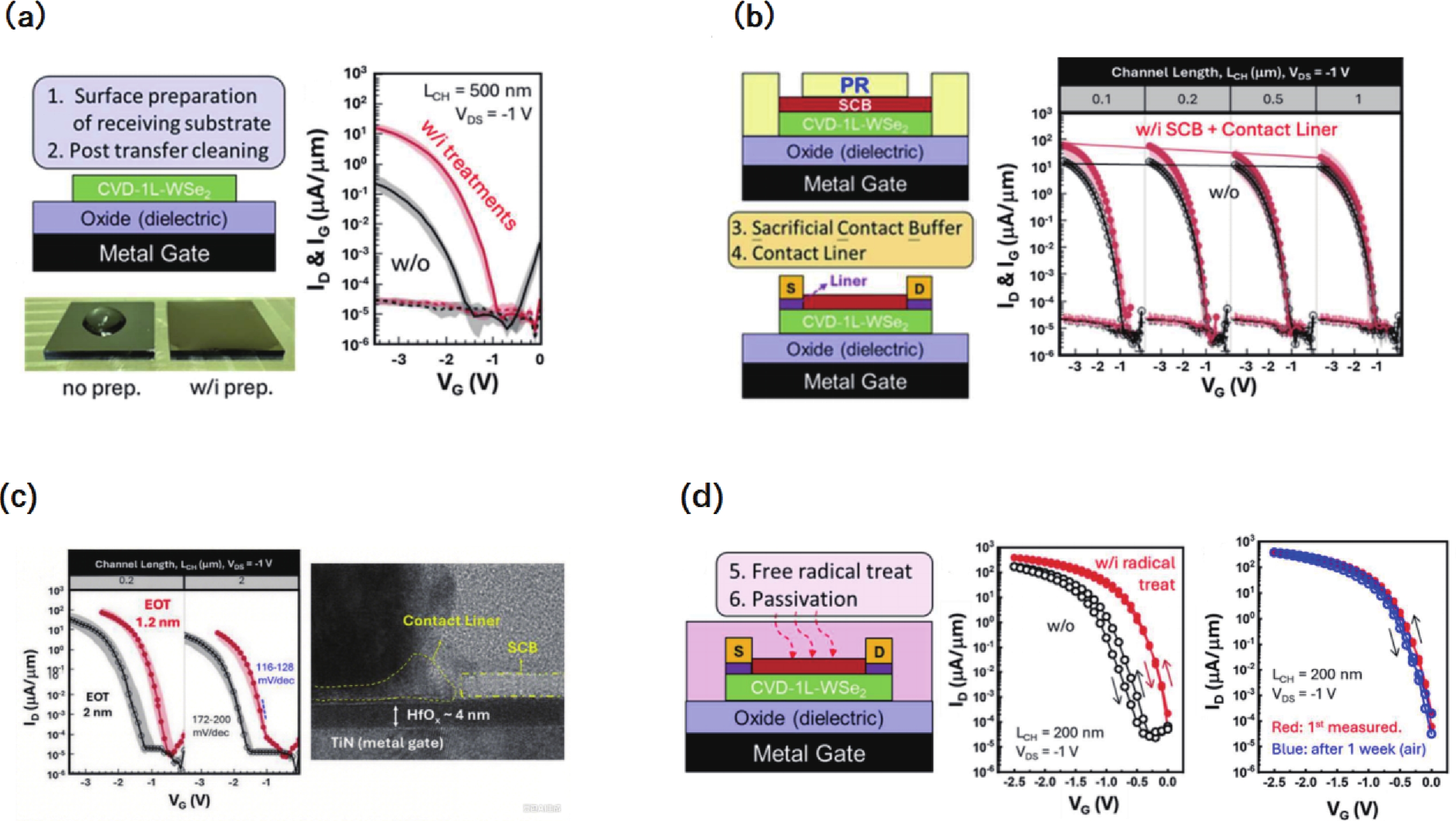 Fig. 1.  (Color online) (a) Diagram illustrating key steps in the $ {\mathrm{W}\mathrm{S}\mathrm{e}}_{2} $ transfer process, along with photographs of samples with different surface treatments, and the resulting transfer characteristics of $ {\mathrm{W}\mathrm{S}\mathrm{e}}_{2} $ p-FETs. (b) Process flow for reducing beam-induced damage in the contact region, and transfer characteristics of $ {\mathrm{W}\mathrm{S}\mathrm{e}}_{2} $ p-FETs with and without an SCB layer and contact liner. (c)Transfer characteristics of $ {\mathrm{W}\mathrm{S}\mathrm{e}}_{2} $ p-FETs with a scaled gate dielectric (4 nm $ {\mathrm{H}\mathrm{f}\mathrm{O}}_{{x}} $ alongside a high-resolution cross-sectional TEM image of the device structure. (d)Key steps in post-fabrication channel treatments, showing transfer curves of $ {\mathrm{W}\mathrm{S}\mathrm{e}}_{2} $ p-FETs with and without a free-radical treatment, and a comparison of device performance before and after one week of ambient aging[11].