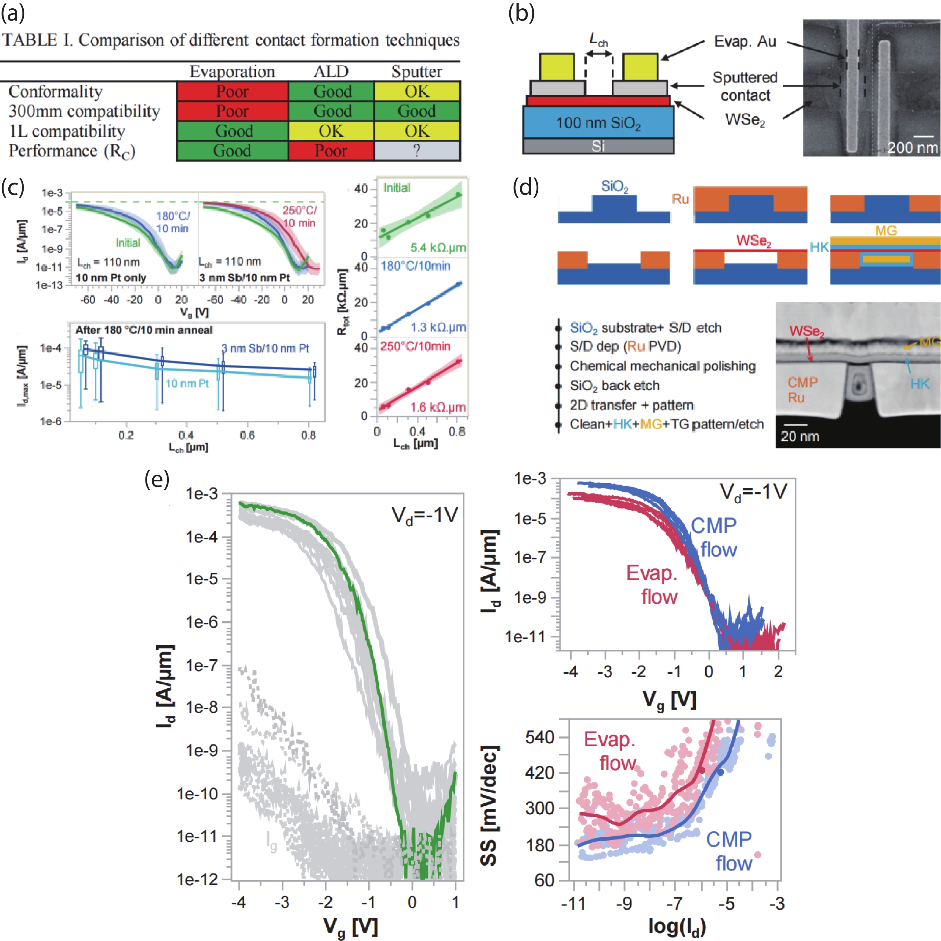 Fig. 2.  (Color online) (a) Comparison of techniques (evaporation, ALD, sputtering) for forming contacts to TMD transistors. (b) Cross-sectional schematic of a back-end-of-line (BEOL) compatible back-gated multilayer $ {\mathrm{W}\mathrm{S}\mathrm{e}}_{2} $ transistor, alongside an SEM image of the fabricated device. (c) Transfer curves (IdVg) for devices with $ {{L}}_{\mathrm{c}\mathrm{h}} $ = 110 nm, comparing Pt-only and Sb/Pt contacts at $ {{V}}_{\mathrm{d}} $ = –1 V under different annealing conditions. Also shown is total resistance ($ {{R}}_{\mathrm{t}\mathrm{o}\mathrm{t}} $) vs. channel length (10th percentile) extracted at $ {{V}}_{\mathrm{d}} $ = −50 mV with $ {{N}}_{\mathrm{i}\mathrm{n}\mathrm{v}}\approx $ 1 × 1013 cm−2. (d) Process flow for a monolayer WSe2 GAA FET, featuring CMP-planarized PVD Ru source/drain contacts, and a cross-sectional TEM image of a GAA $ {\mathrm{W}\mathrm{S}\mathrm{e}}_{2} $ transistor with $ {{L}}_{\mathrm{s}\mathrm{d}} $ = 20 nm. (e) Measured IdVg curves for devices with $ {{L}}_{\mathrm{s}\mathrm{d}} $ from 20 to 80 nm, highlighting the record SS = 132 mV/dec and $ I_{\rm{d,max}} $ of 613 $ \mu $A/μm. Also shown are comparisons of transfer characteristics and SS for GAA $ {\mathrm{W}\mathrm{S}\mathrm{e}}_{2} $ FETs using CMP-formed Ru contacts versus evaporated Ru contacts[12].