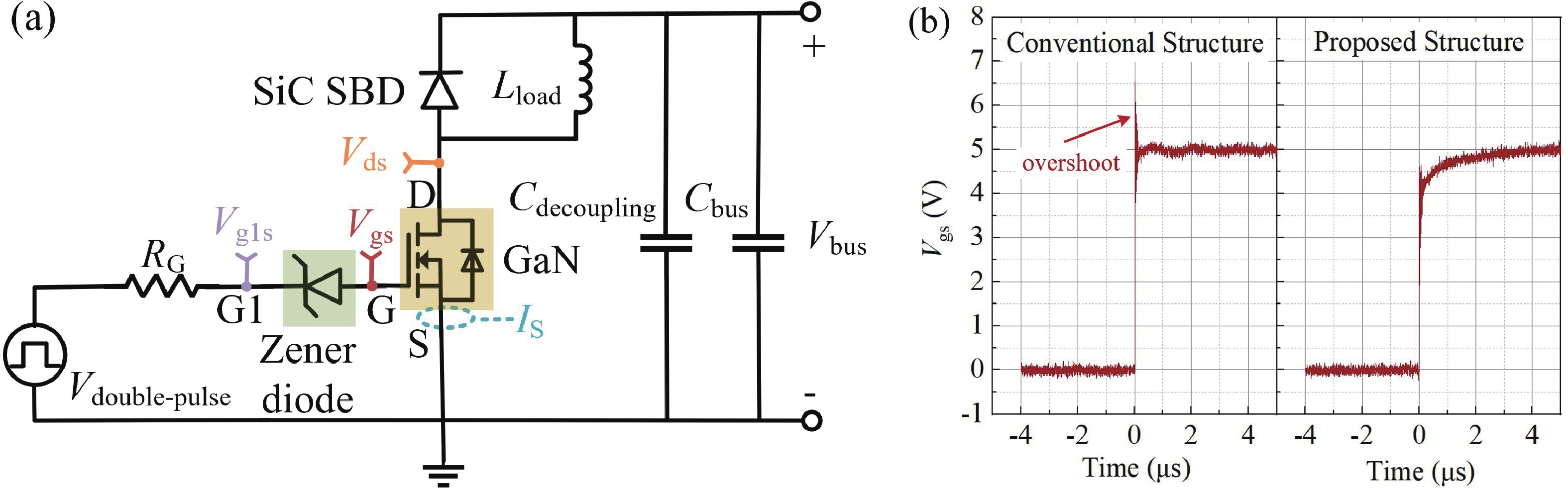 In this paper, a novel gate-series-diode structure for the Schottky-type p-GaN HEMTs is proposed, and the impact of the proposed structure on gate-source voltage oscillation is investigated when the device is turned on. The proposed structure is capable of effectively mitigating the gate-source voltage overshoot problem of GaN device, and has little effect on the switching characteristics. The gate voltage oscillations can be greatly stabilized at the steady-state turn-on voltage level when the turn-on voltage is 5 V. Compared with the conventional structure, the overshoots of the proposed structure reduce by 31.4%−71.4% and 40.6%−80.4% respectively under the two pulses, as drain-source voltage rises. The proposed structure is proved to be a potential method on improving gate reliability of the most GaN power devices. -