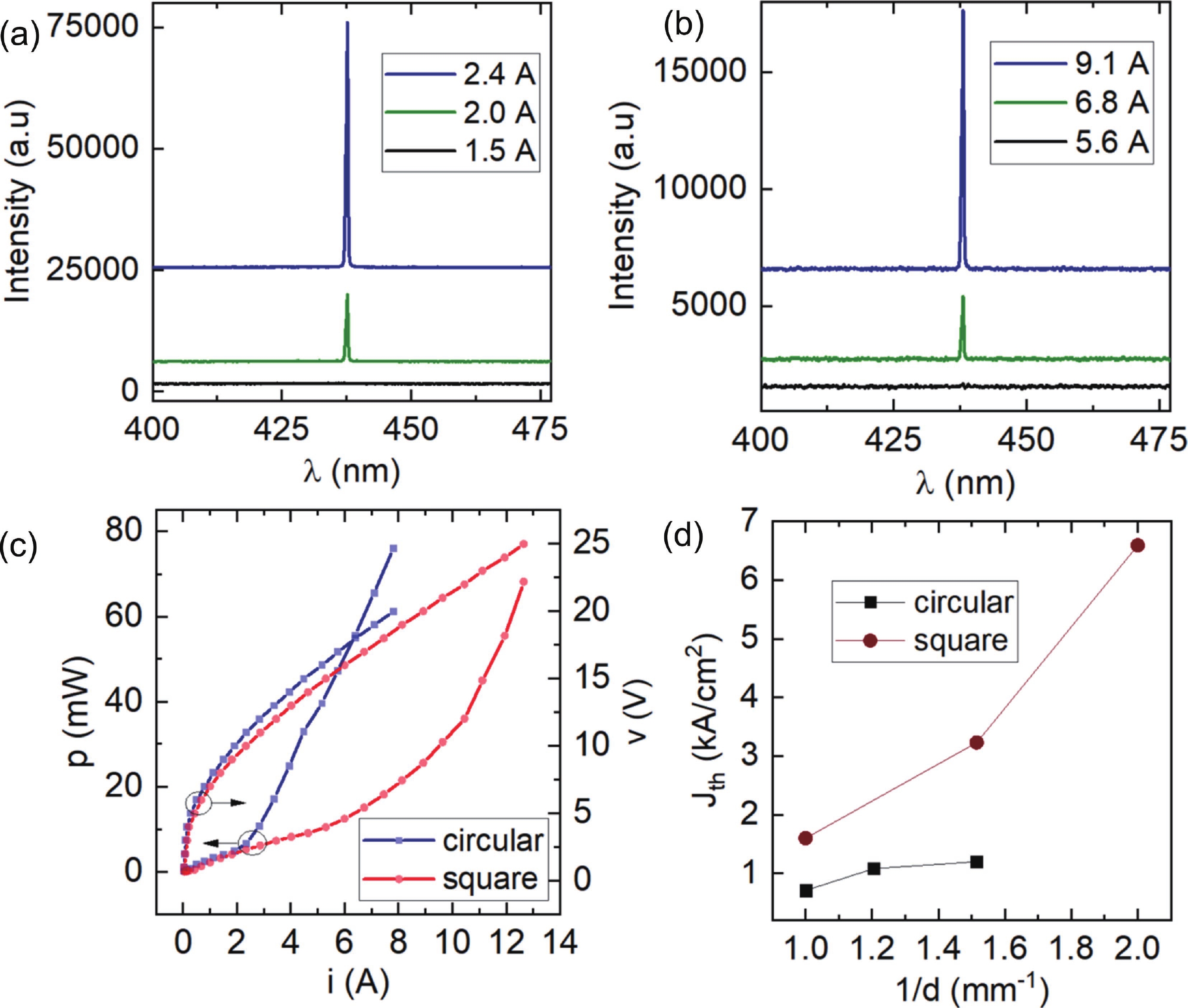 Fig. 2.  (Color online) Pulsed electrically injected measurement of the laser diodes. (a) Spectra of CGSEL and (b) PCSEL at different injection currents. (c) PIV curves. (d) Threshold current density vs size of photonic crystal area.