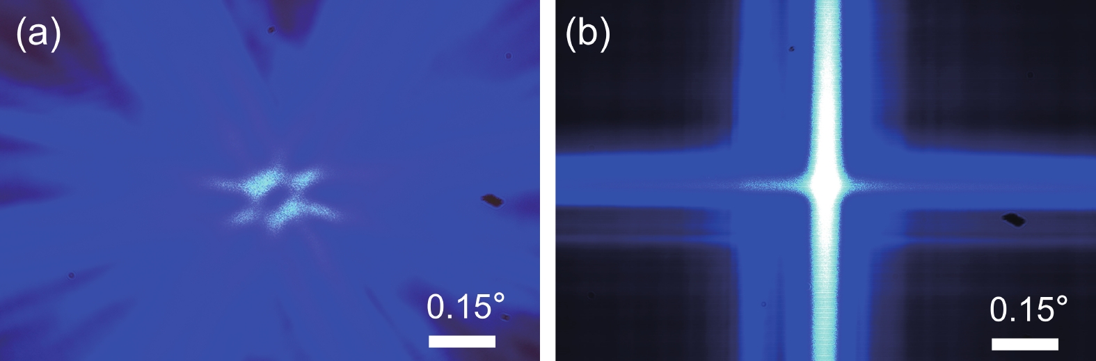 Fig. 3.  (Color online) Far-field pattern of (a) CGSEL and (b) PCSEL under pulse current injection.