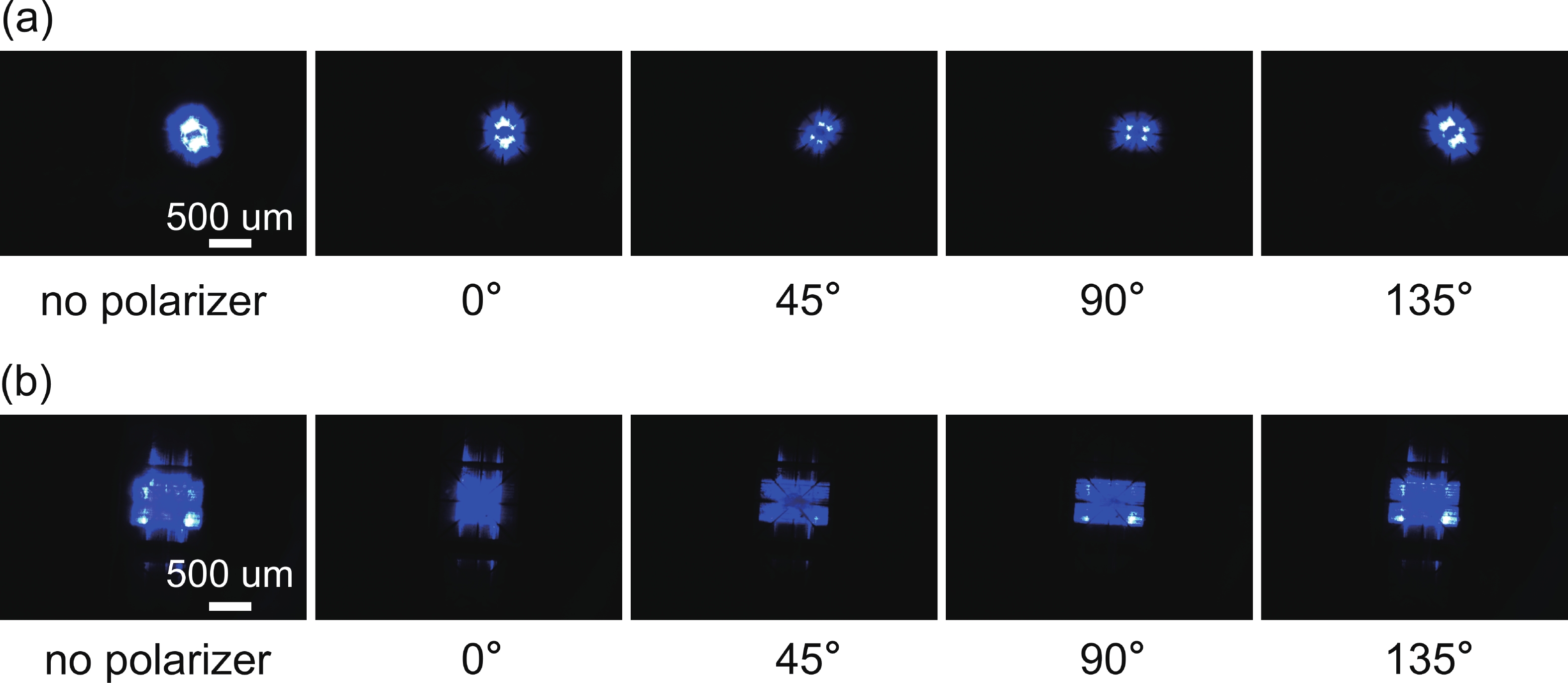Fig. 4.  (Color online) Polarization dependent near field image of (a) CGSEL and (b) PCSEL under pulse current injection.