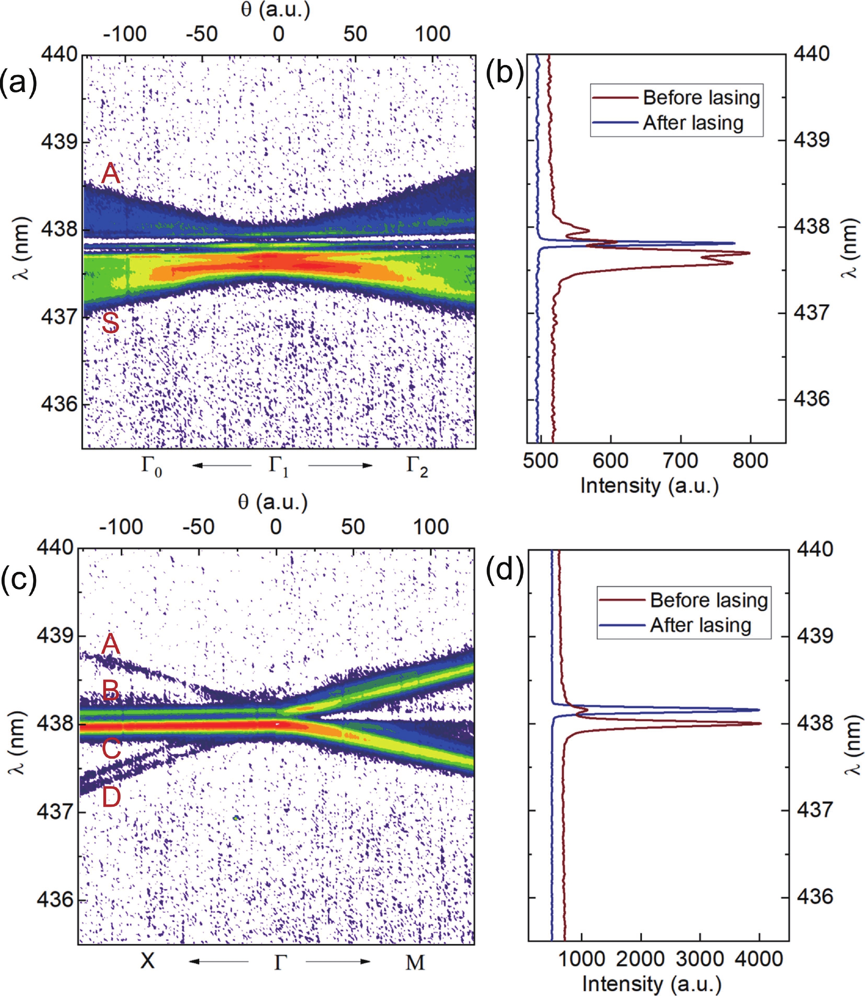 Fig. 5.  (Color online) Energy band structure before lasing and spectrum at gamma point measured under pulse electrical injection. (a),(b) CGSEL and (c),(d) PCSEL. The color bars are deliberately omitted. Band are labeled. In (a) A, S represent anti-symmetric, symmetric band, respective. In (c), A, B, C, and D conventionally denote four energy bands according to symmetry.