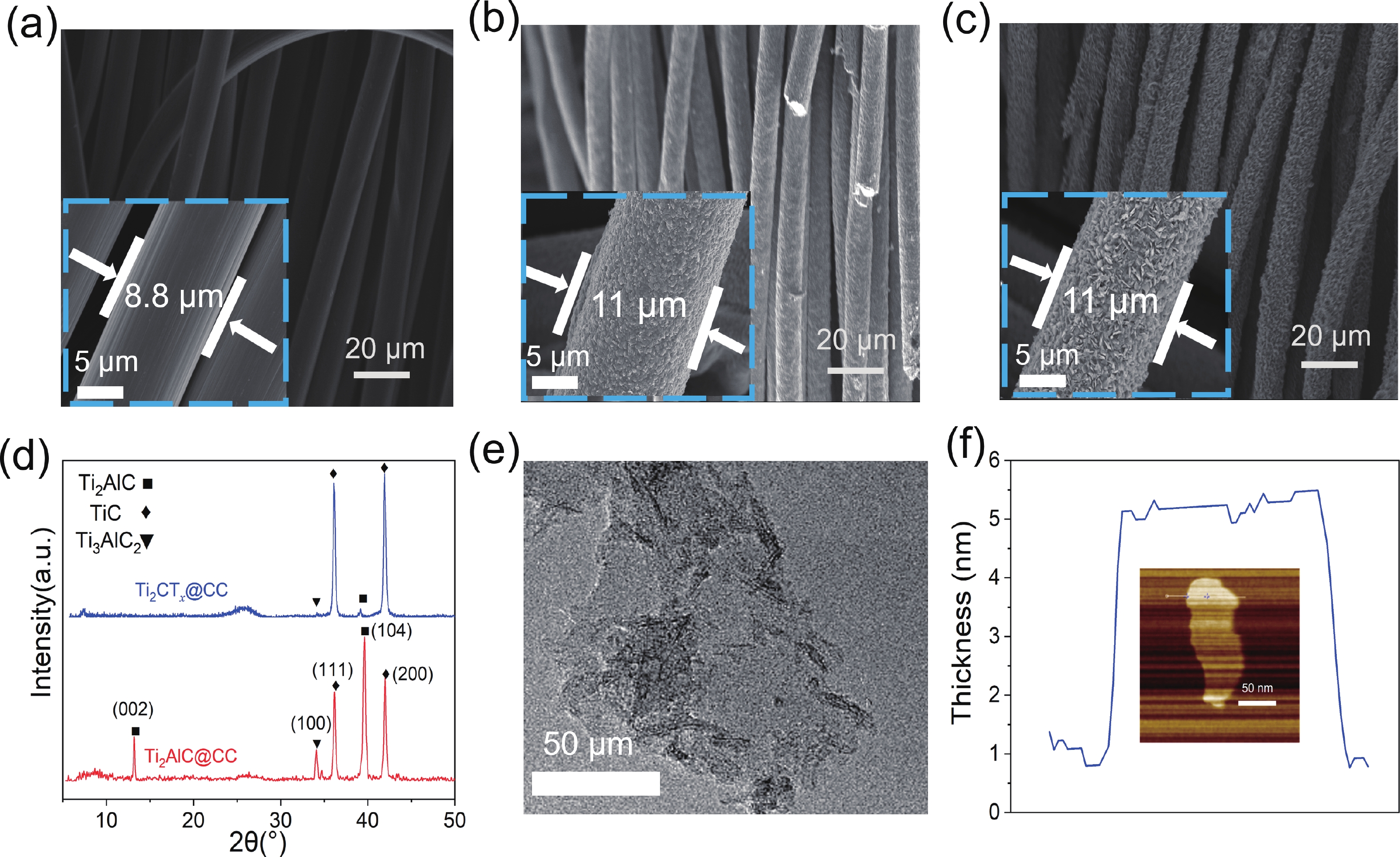 Fig. 2.  (Color online) Characterizations of the synthesized samples. SEM images of (a) pure carbon cloth (b) Ti2AlC@CC (c) Ti2CTx@CC. (d) XRD patterns of Ti2AlC@CC and Ti2CTx@CC. (e) TEM image of Ti2CTx nanosheet. (f) AFM image of Ti2CTx nanosheet.