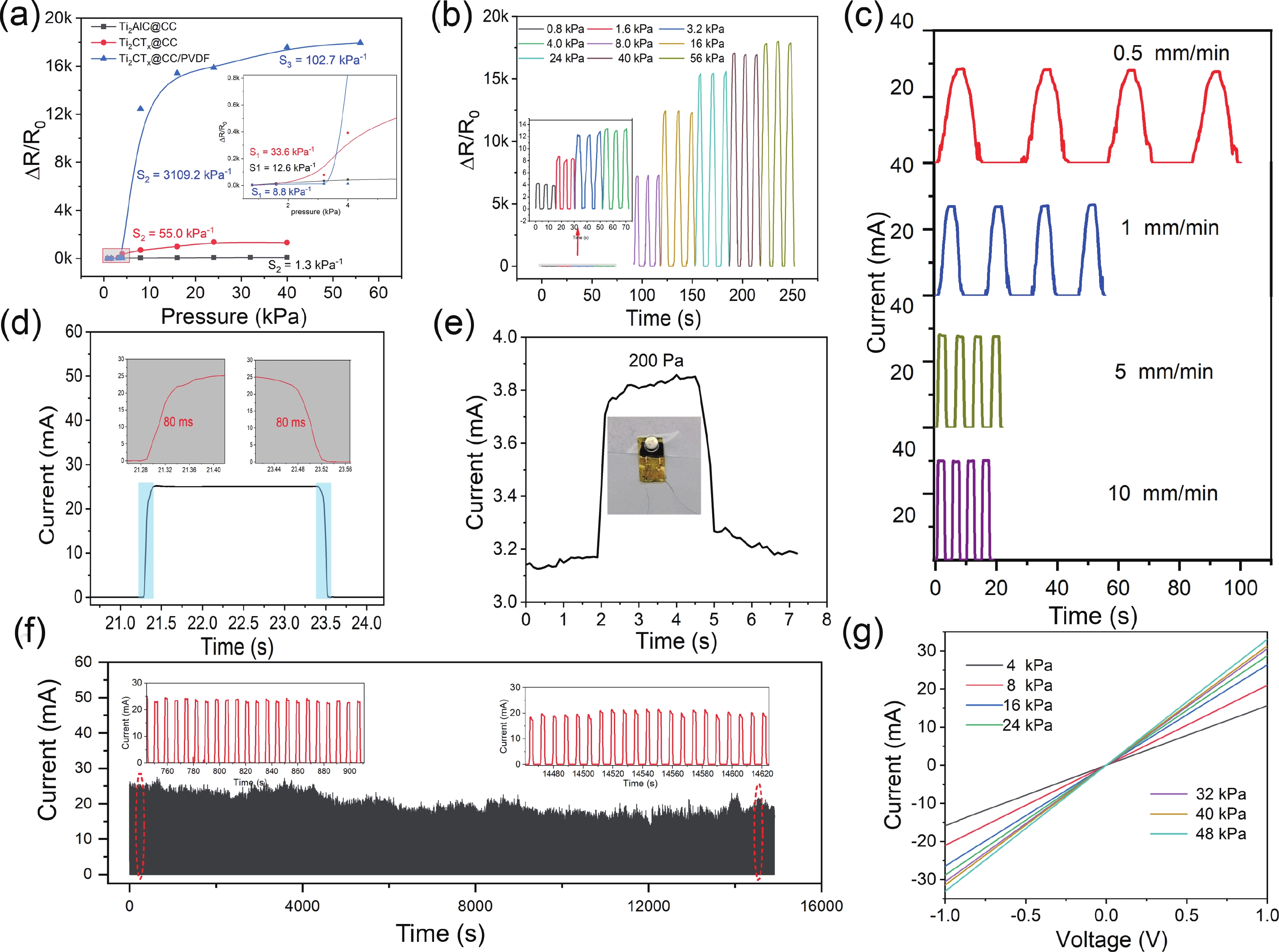 Fig. 3.  (Color online) Sensing performance of the Ti2CTx @CC based flexible pressure sensor. (a) Relative resistance variations versus the pressure applied to the different structures of pressure sensors based on (i) Ti2AlC@CC, (ii) Ti2CTx@CC, and (iii) Ti2CTx@CC/PVDF. (b) Real-time relative resistance variations during cyclic loading/unloading at different pressure levels. (c) Current response under different rates under a 800 Pa pressure. (d) Response and recovery time under a 1 kPa pressure. (e) Current response under a slight pressure of 200 Pa. (f) Stability performance of the pressure sensor with a high pressure of 40 kPa over 8000 cycles. (g) Current–voltage (I–V) curves of the sensor under varying pressures ranging from 4 kPa to 48 kPa.