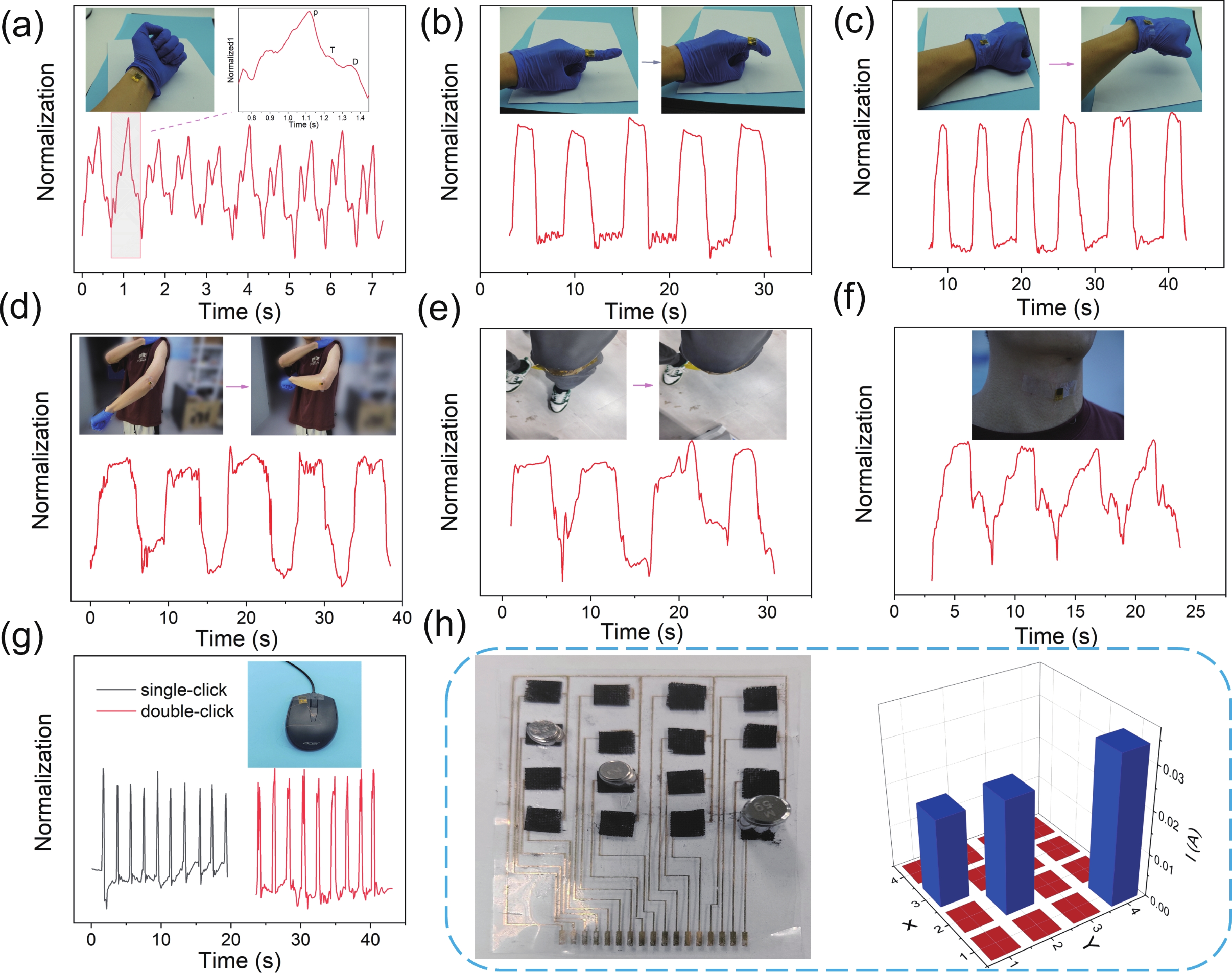 Fig. 5.  (Color online) Real-time monitoring of the flexible pressure sensor towards various physiological signals in the human body and minor pressure. (a) Pulse pulsation. (b) Finger bending. (c) Wrist bending. (d) Elbow bending. (e) Knee bending. (f) Throat swallowing. (g) Clicking the mouse. (h) Photograph of different weights applied on the 4 × 4 pressure sensor array and the corresponding spatial pressure distribution.