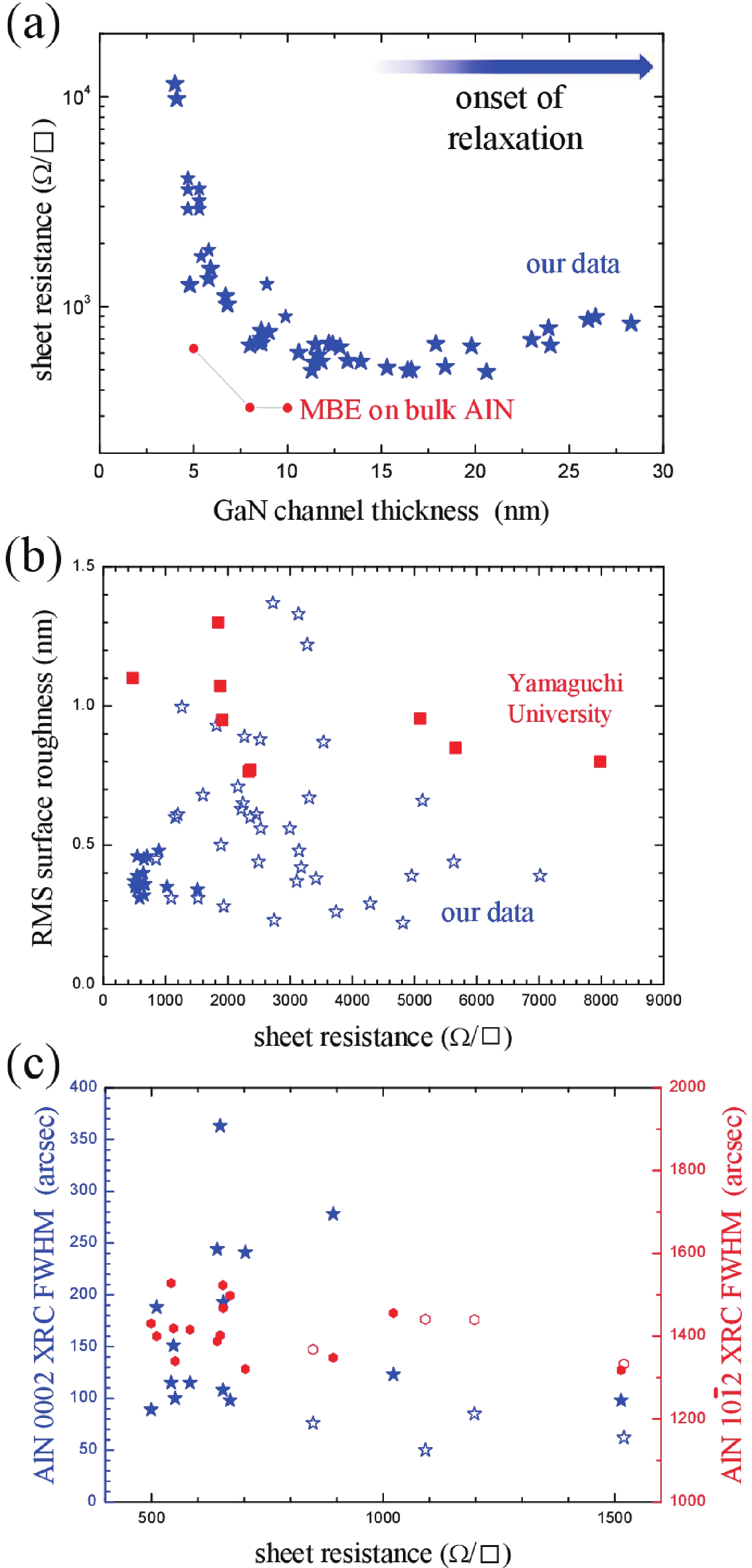 Fig. 2.  (Color online) (a) Sheet resistance as a function of GaN channel thickness and additional data points from samples grown by MBE on bulk AlN by Cornell University (red)[5]. (b) RMS surface roughness as a function of sheet resistance for our samples (blue) and data from Yamaguchi University (red)[6, 7, 15]. (c) XRC FWHM of the 0002 and 1012 reflections as a function of sheet resistance. The open symbols represent our samples from earlier series grown under different growth conditions.
