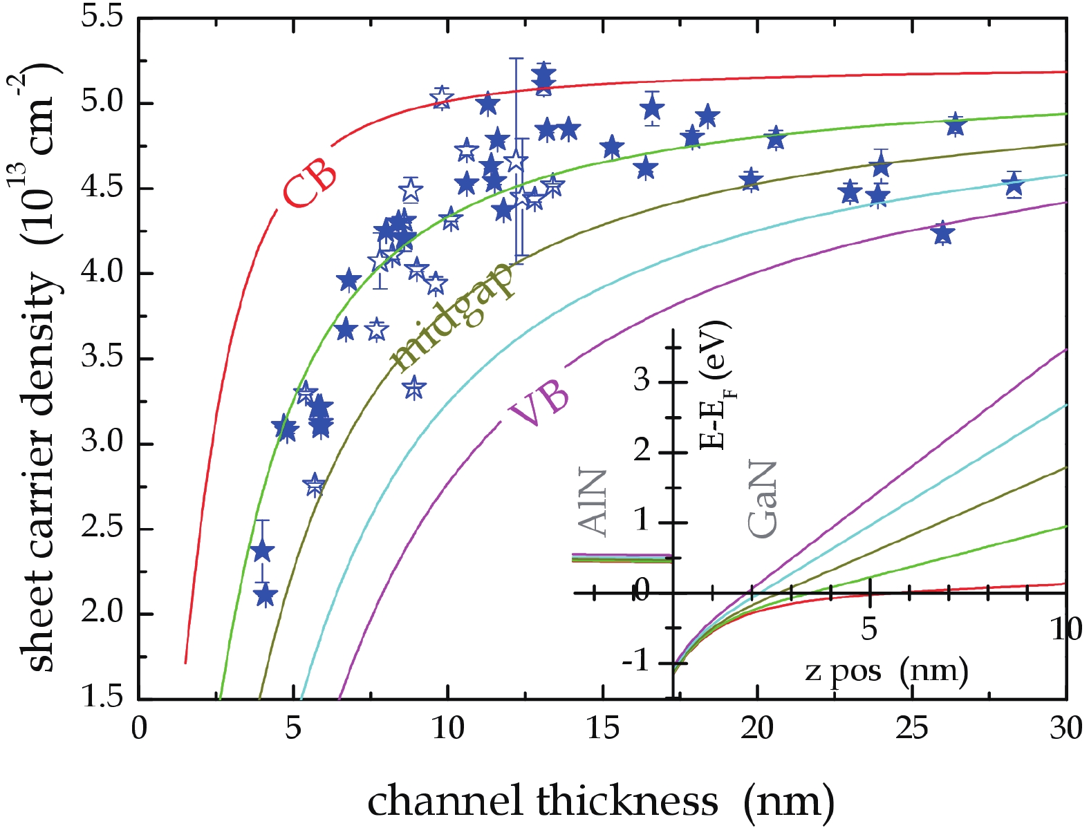Fig. 3.  (Color online) Dependence of the carrier density on the channel thickness for all of our 2DEG structures and from calculations using different surface Fermi level pinning as fitting parameter. The open symbols correspond to samples from an earlier series with different growth conditions. The inset shows the CB diagram for five different pinning levels calculated for a 10 nm thick GaN channel: at GaN surface, EF was set at CB, 0.8 eV below CB, midgap, 0.8 eV above VB, and at VB.