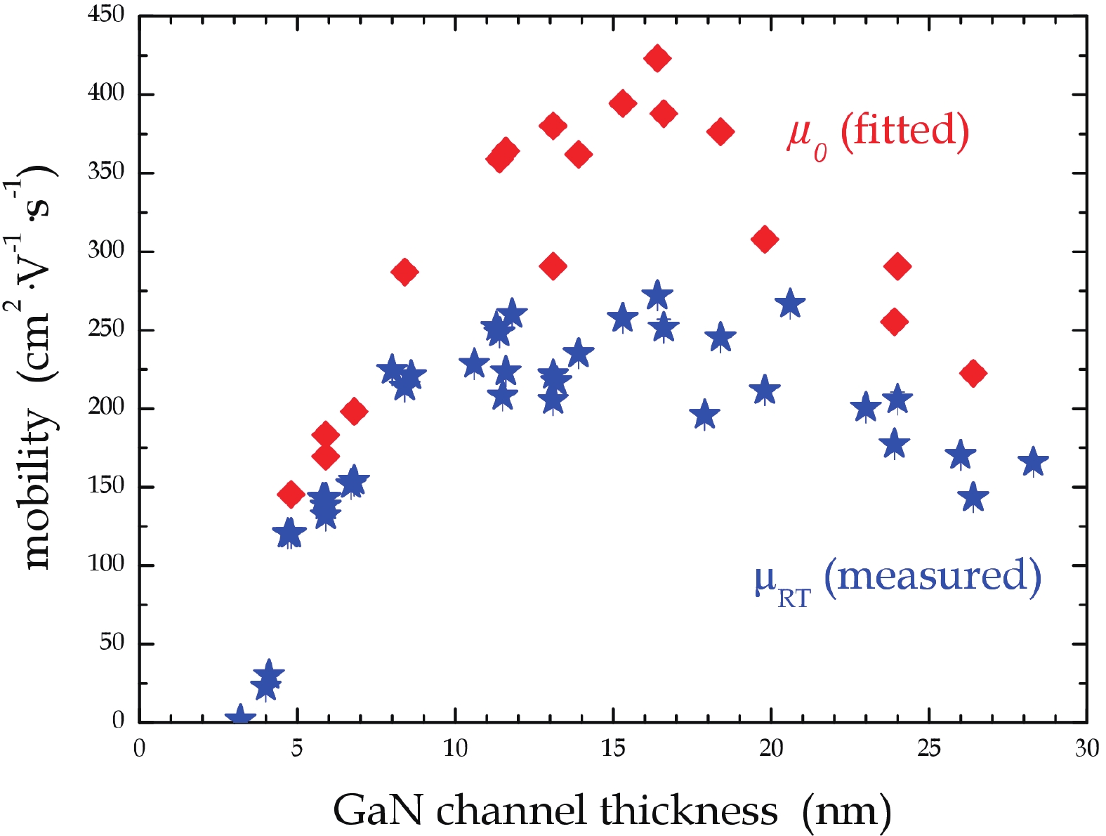 Fig. 4.  (Color online) Dependence of the Hall mobility on the GaN channel thickness for all of our 2DEG structures at room temperature (294 K) and $ \mu_{0} $ extracted from Eq. (7).