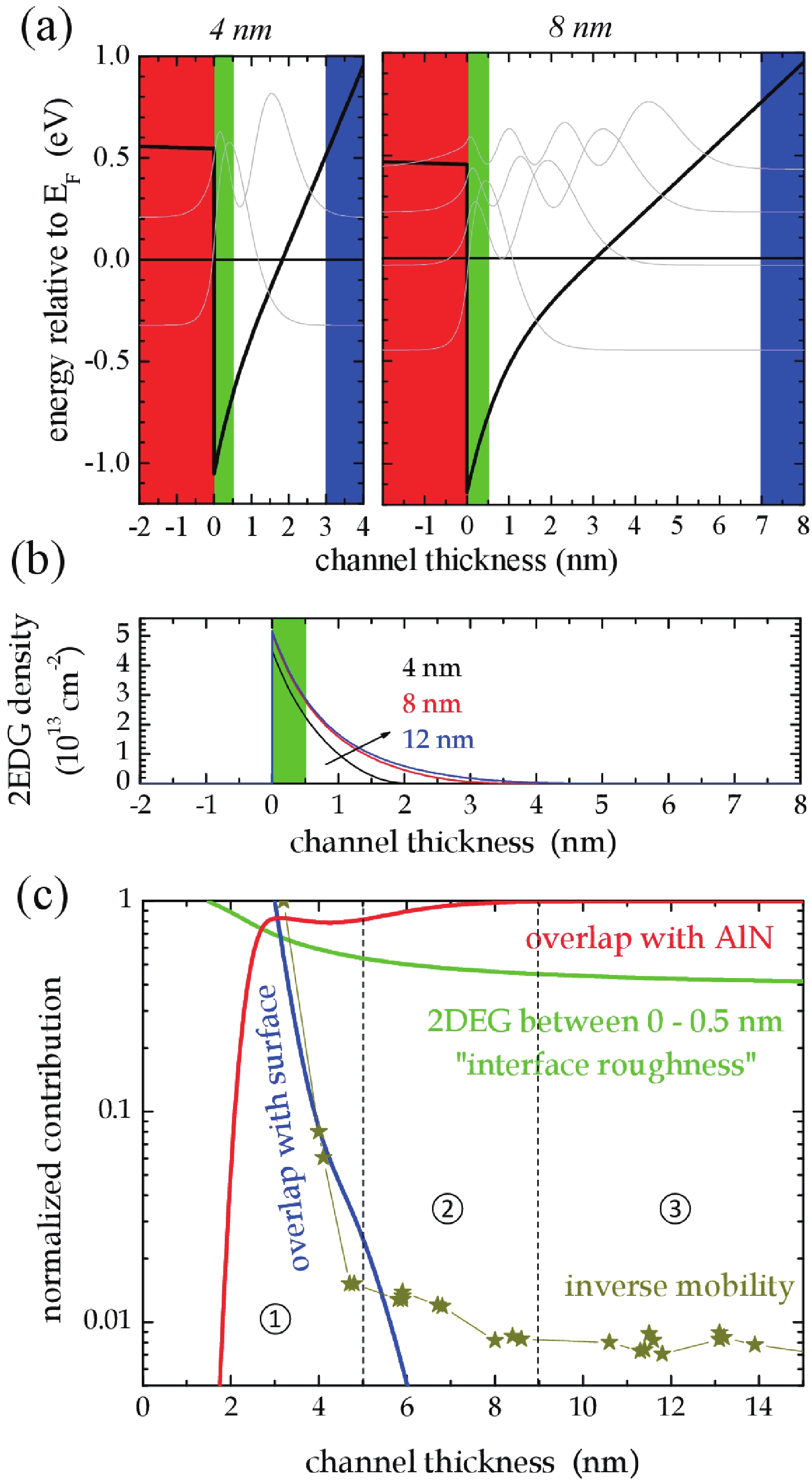 Fig. 5.  (Color online) (a) Conduction band edge and confined states inside the channel width of 4 nm and 8 nm. The wavefunctions were integrated over the red area to quantify the overlap with AlN and over the blue area to quantify the overlap with the surface, and subsequently multiplied by the state's occupancy at 300 K. (b) Spatial distribution of the 2DEG for channel width of 4, 8, and 12 nm. Here, the 2DEG is integrated over the green area. (c) Reciprocal mobility ($ \mu^{-1} $) at 294 K (brown), together with the calculated overlap of the states with the AlN (red), the overlap of the states with the surface (blue) - all normalized - and the fraction of the 2DEG located within the first 0.5 nm, i.e. the fraction most strongly affected by interface roughness.