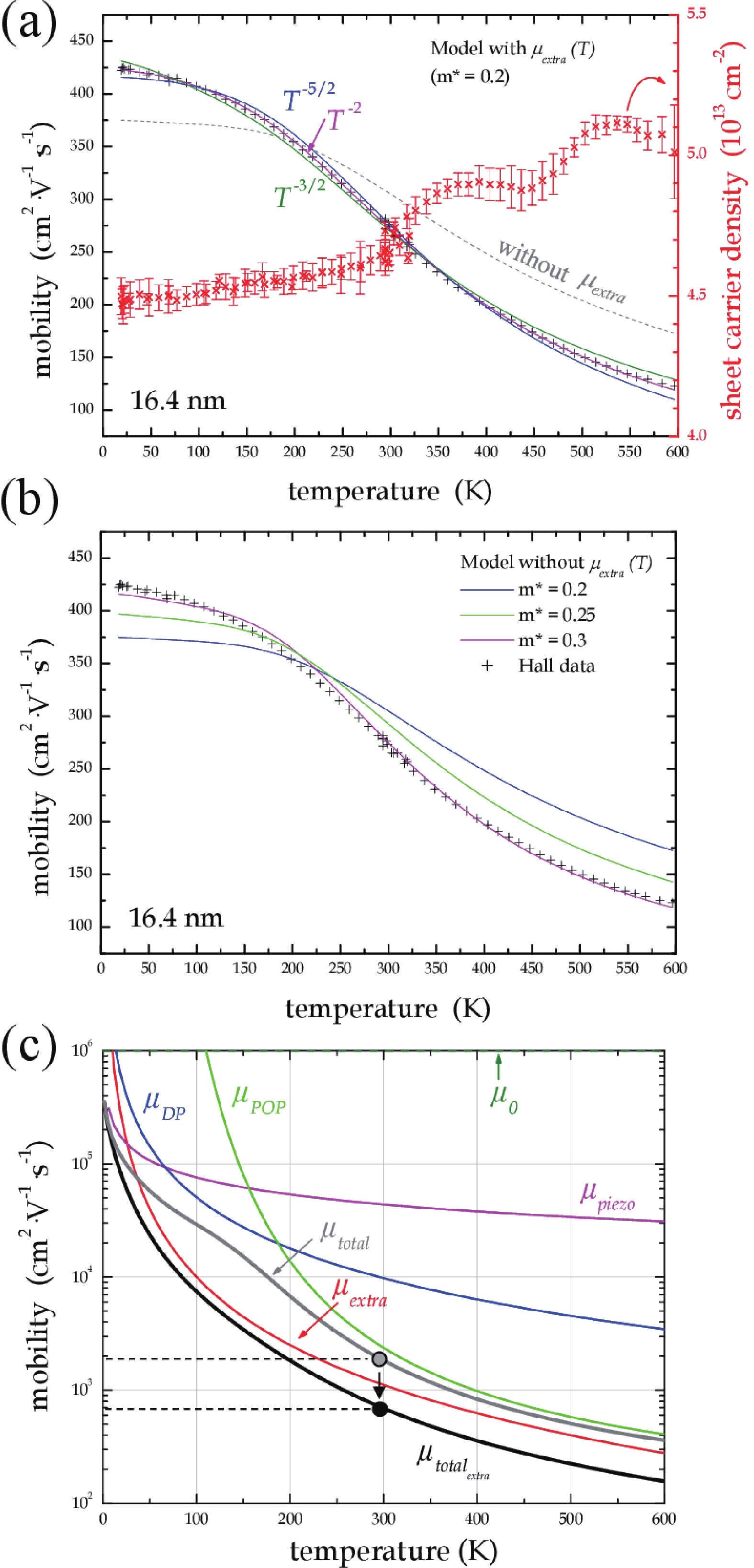 Fig. 6.  (Color online) (a) Temperature dependent mobility data (cross) with several fits from Eq. (7): without the additional term $ \mu_{\rm{extra}} $ (dashed grey line) and including $ \mu_{\rm{extra}} $ but with different exponents. The sheet carrier density is plotted on the right axis for further discussion. (b) Same temperature dependent mobility data (cross) but using different effective mass ranging from 0.2 to 0.3 instead of introducing $ \mu_{\rm{extra}} $ (c) Impact of the different mobilities assuming a $ \mu_{0} $ of $ 10^6 \;{\rm{cm}}^2\cdot{\rm{V}}^{-1}\cdot{\rm{s}}^{-1} $ and an effective mass $ {m^*}\;=0.2 $. The resulting total mobility is calculated both with (black) and without (grey) the additional $ \mu_{\rm{extra}} $ using $ \gamma=10^8 $ cm2·K2·V·−1s−1 and $ \alpha=2 $.
