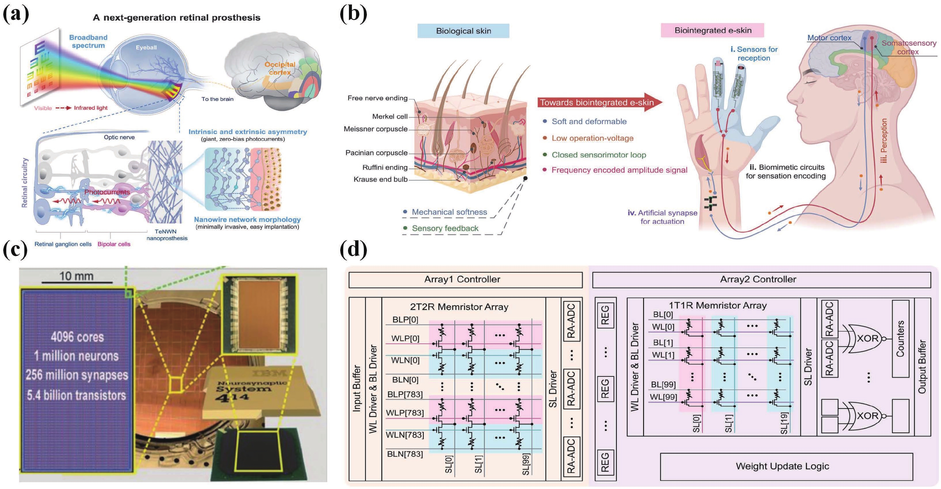 [1] Indiveri G, Liu S C. Memory and information processing in neuromorphic systems. Proc IEEE, 2015, 103(8): 1379 doi: 10.1109/JPROC.2015.2444094[2] Lan G T, Lian H, Qin Z T, et al. Organic photonic synapses for application of bioinspired neuromorphic visual perception and beyond. Adv Funct Mater, 2025: e22513[3] Liu X, Dai S L, Jin Y Y, et al. Near-infrared organic photoelectrochemical synaptic transistors by wafer-scale photolithography for neuromorphic visual system. Nat Commun, 2026, 17: 197 doi: 10.1038/s41467-025-66891-6[4] Wang W C, Jiang Y W, Zhong D L, et al. Neuromorphic sensorimotor loop embodied by monolithically integrated, low-voltage, soft e-skin. Science, 2023, 380(6646): 735 doi: 10.1126/science.ade0086[5] Bao R, Wang S Y, Liu X X, et al. Neuromorphic electro-stimulation based on atomically thin semiconductor for damage-free inflammation inhibition. Nat Commun, 2024, 15: 1327 doi: 10.1038/s41467-024-45590-8[6] Gu L L, Poddar S, Lin Y J, et al. A biomimetic eye with a hemispherical perovskite nanowire array retina. Nature, 2020, 581(7808): 278 doi: 10.1038/s41586-020-2285-x[7] Chen J W, Zhou Z, Kim B J, et al. Optoelectronic graded neurons for bioinspired in-sensor motion perception. Nat Nanotechnol, 2023, 18(8): 882 doi: 10.1038/s41565-023-01379-2[8] Wang Y, Gou S F, Dong X Q, et al. A biologically inspired artificial neuron with intrinsic plasticity based on monolayer molybdenum disulfide. Nat Electron, 2025, 8: 680 doi: 10.1038/s41928-025-01433-y[9] Zhang N, Wang Y, Yan Y J, et al. Floating-gate synaptic transistors for energy-efficient neuromorphic computing. Adv Mater, 2026, 38(8): e15605[10] Wang S Y, Jiang C Y, Yu Y Y, et al. Tellurium nanowire retinal nanoprosthesis improves vision in models of blindness. Science, 2025, 388: eadu2987 doi: 10.1126/science.adu2987[11] Zhou Y, Fu J W, Chen Z R, et al. Computational event-driven vision sensors for in-sensor spiking neural networks. Nat Electron, 2023, 6: 870 doi: 10.1038/s41928-023-01055-2[12] Li S J, Wu T, Xu J L, et al. Biomimetic multimodal tactile sensing enables human-like robotic perception. Nat Sens, 2026, 1: 52 doi: 10.1038/s44460-025-00006-y[13] Chang J K, Maltby T, Moineddini A, et al. Piezoelectric nanofiber–based intelligent hearing system. Sci Adv, 2025, 11: eadl2741 doi: 10.1126/sciadv.adl2741[14] Zhong B W, Qin X K, Xu H, et al. Monolithic cell-on-memristor architecture enables wafer-scale integration of oscillatory chemoreceptors for bio-realistic gustatory chips. Nat Mater, 2026, 25: 275 doi: 10.1038/s41563-025-02436-y[15] Merolla P A, Arthur J V, Alvarez-Icaza R, et al. A million spiking-neuron integrated circuit with a scalable communication network and interface. Science, 2014, 345: 668 doi: 10.1126/science.1254642[16] Yao P, Wu H Q, Gao B, et al. Fully hardware-implemented memristor convolutional neural network. Nature, 2020, 577: 641 doi: 10.1038/s41586-020-1942-4[17] Zhang W B, Yao P, Gao B, et al. Edge learning using a fully integrated neuro-inspired memristor chip. Science, 2023, 381: 1205 doi: 10.1126/science.ade3483[18] Liu Z W, Mei J, Tang J S, et al. A memristor-based adaptive neuromorphic decoder for brain–computer interfaces. Nat Electron, 2025, 8: 362 doi: 10.1038/s41928-025-01340-2[19] Yu R H, Wang Z, Liu Q, et al. A full-stack memristor-based computation-in-memory system with software-hardware co-development. Nat Commun, 2025, 16: 2123 doi: 10.1038/s41467-025-57183-0[20] Ning H K, Wen H D, Meng Y, et al. An index-free sparse neural network using two-dimensional semiconductor ferroelectric field-effect transistors. Nat Electron, 2025, 8: 222 doi: 10.1038/s41928-024-01328-4 -