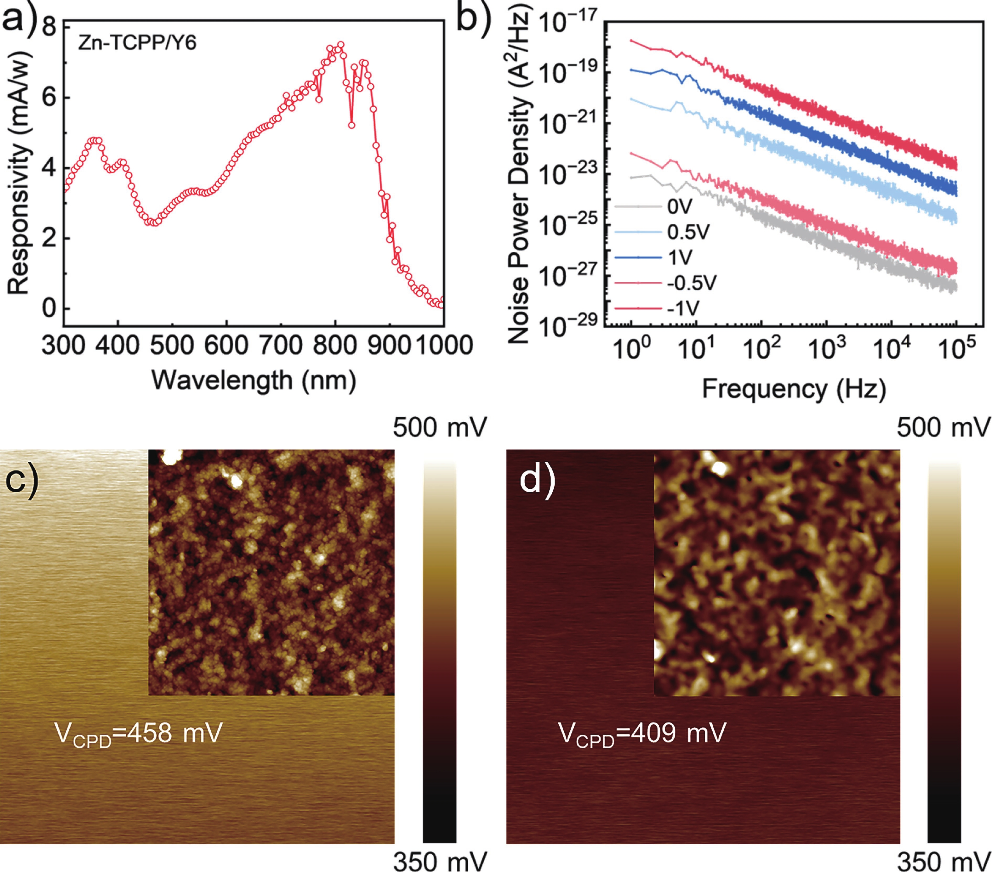 Broadband, low-power, and solution-processable organic photodetectors are essential for next-generation optoelectronic sensing. Two-dimensional conductive metal-organic frameworks (2D cMOFs) based on zinc tetracarboxyphenyl porphyrin (Zn-TCPP) offer strong light absorption and efficient charge transport, yet their photoresponse remains confined to the UV−visible region. To address this limitation, this study develops a solution-compatible strategy for constructing a well-defined MOF/organic semiconductor type-II heterojunction by spin-coating a high-performance Y6 layer onto Zn-TCPP films. The resulting heterostructure provides complementary spectral absorption, promotes efficient exciton dissociation, and enables directional charge carrier transport, thereby achieving self-powered broadband photodetection spanning the ultraviolet to near-infrared (UV−NIR) range. The device demonstrates outstanding performance, including an ultra-low dark current (down to 3.40 × 10−13 A), high responsivity, and an ultrafast transient response with a rise time of 4.4 ms. This work establishes a generalizable approach for engineering high-efficiency MOF/organic semiconductor heterojunctions and offers a promising platform for low-cost, broadband, and self-powered photodetectors for biomedical and advanced sensing applications.