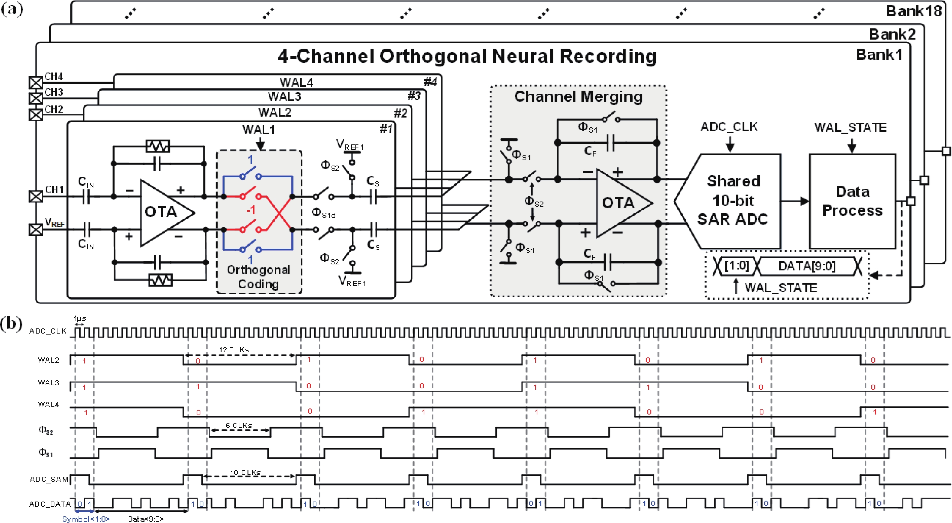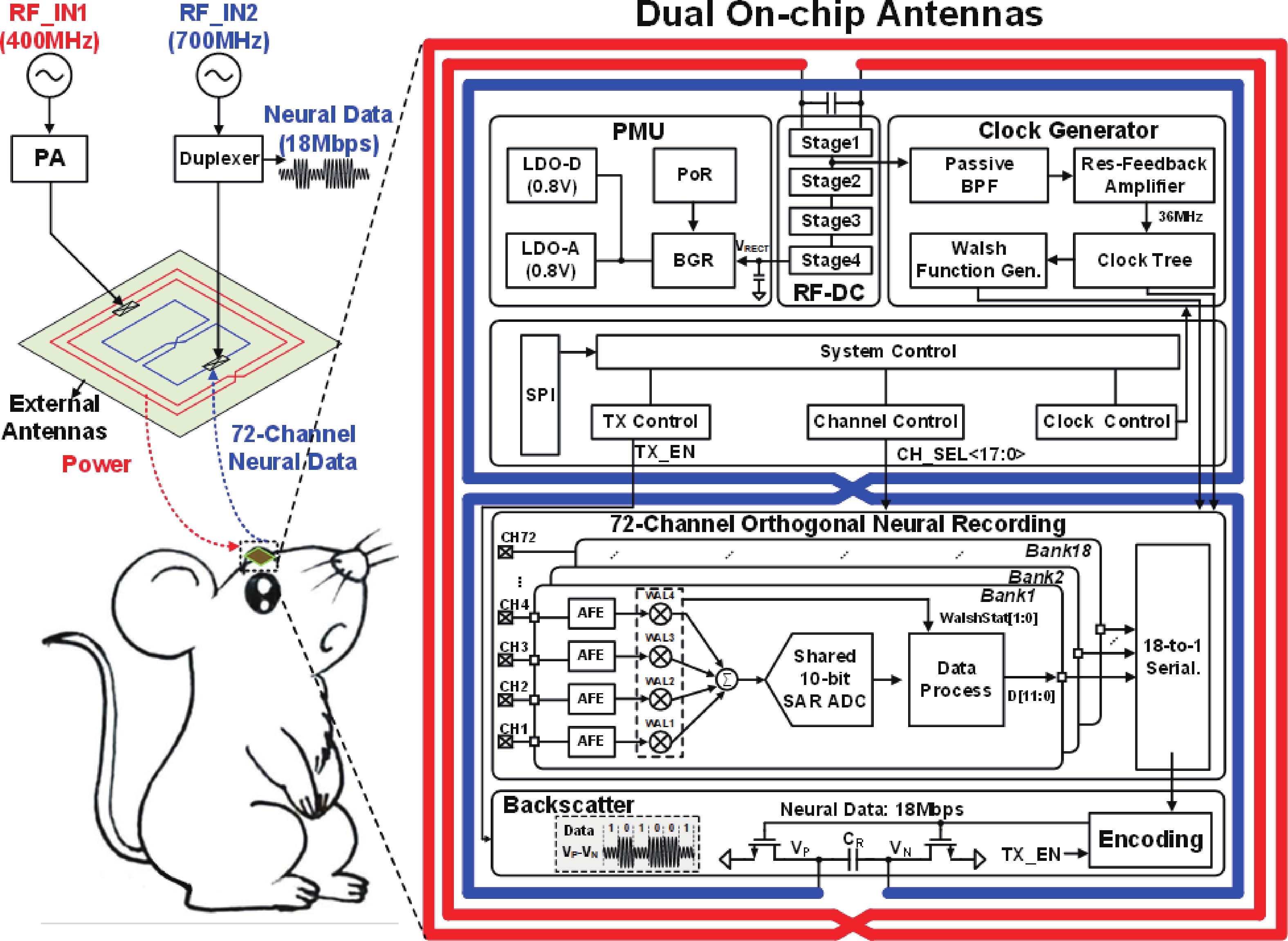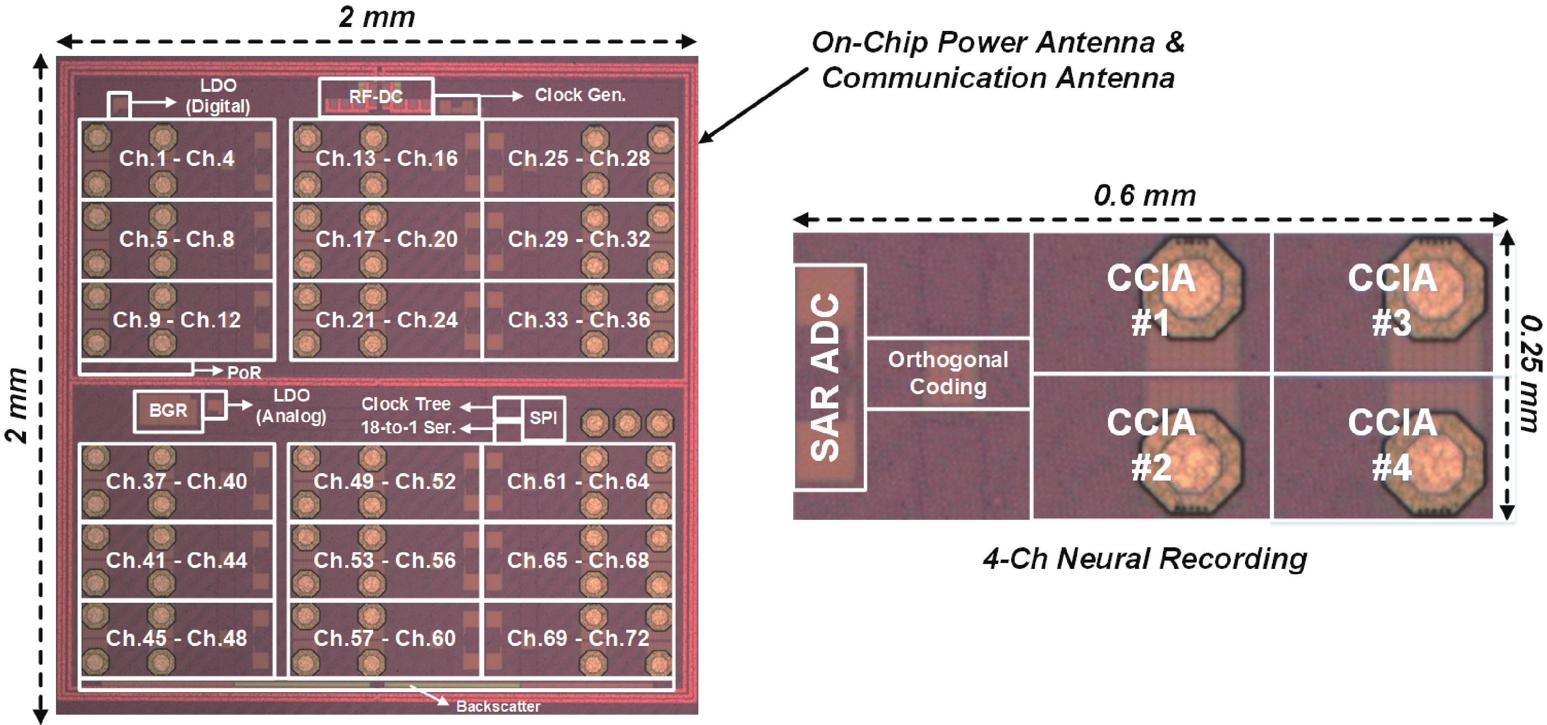Battery-free radio systems utilizing wireless power transfer (WPT) further facilitate the miniaturization of neural implants. However, simultaneous monitoring of multiple neuronal activities is required to obtain high-fidelity neural signals. Consequently, the integration of numerous channels on a single chip and the wireless transmission of massive multi-channel data pose significant challenges for implantable battery-free neural interfaces. This work introduces dual overlapped on-chip antennas to eliminate the need for a battery in the neural implants and enable high-data-rate backscatter for transmitting the massive data acquired simultaneously from 72 channels. Additionally, an orthogonal coding and sampling technique is employed to reduce both power consumption and area per channel. Fabricated in a 65 nm CMOS process, the proposed chip integrates 72 neural recording channels within a 2 mm × 2 mm area and achieves a backscatter data rate of 18 Mbps.