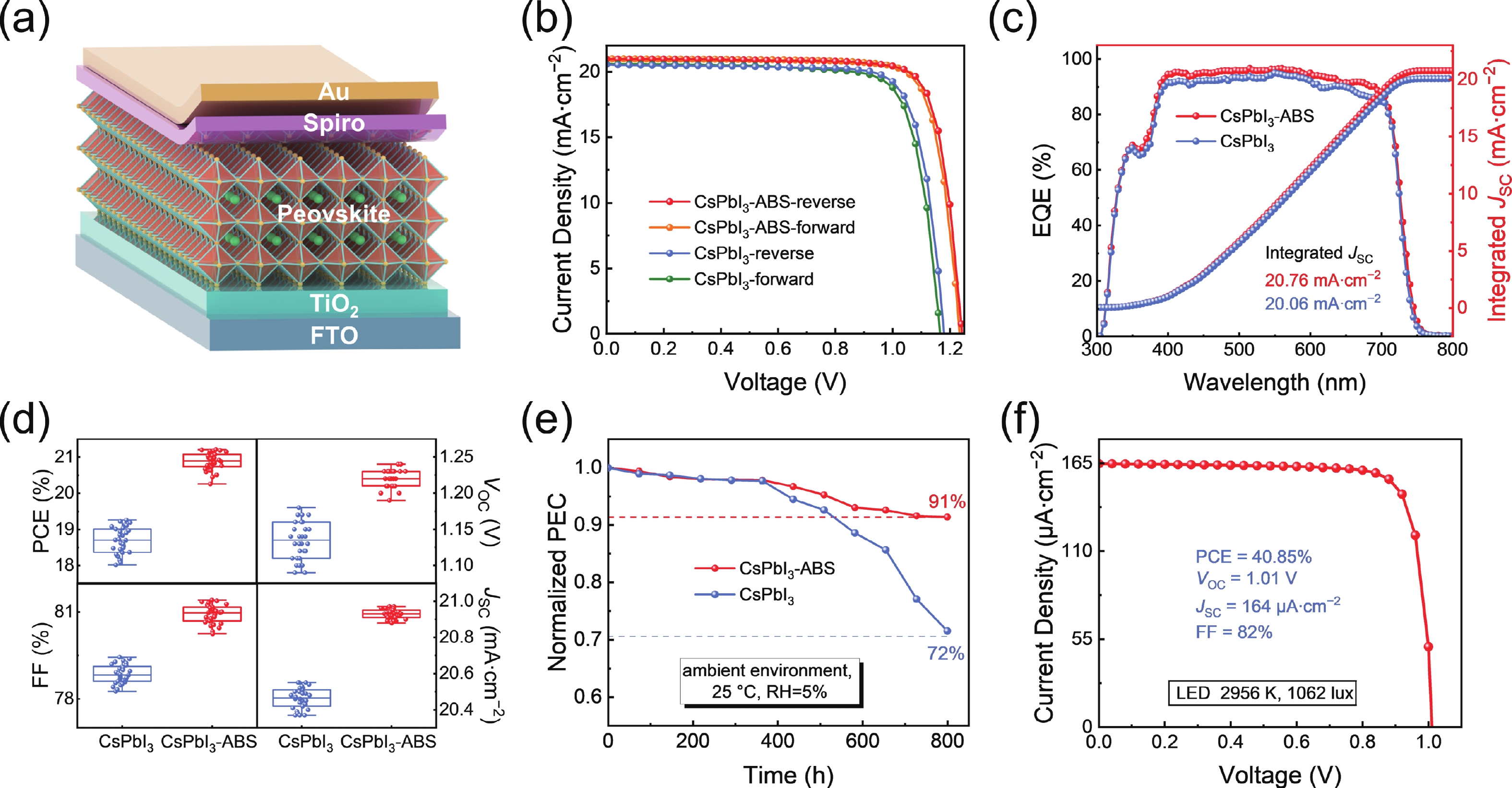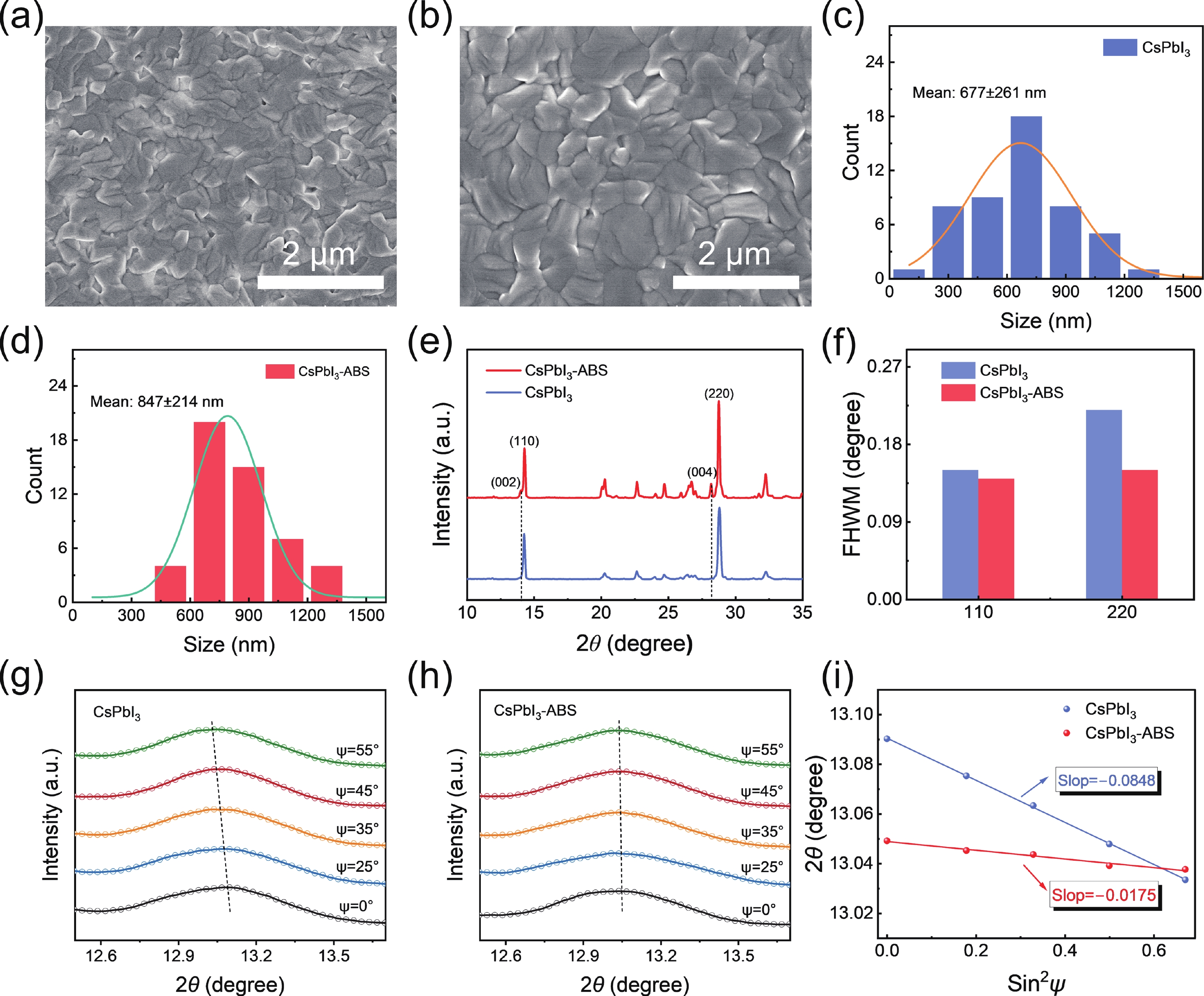 Inorganic cesium lead iodide (CsPbI3) perovskites are promising photovoltaic materials owing to their excellent thermal stability and optoelectronic properties. However, CsPbI3 film fabricated via solution processing typically suffers from high defect densities and detrimental residual tensile stress due to uncontrolled crystallization and thermal expansion mismatch with the substrate, which impedes its practical application. Herein, we introduce ammonium benzenesulfonate (ABS) as a bifunctional additive to modulate crystallization, thereby passivating defects and regulating residual stress. The sulfonate group of ABS coordinates with undercoordinated Pb2+ ions, while its ammonium group forms hydrogen bonds with iodide ions. The molecular structure of ABS bridges adjacent [PbI6]4− octahedra at grain boundaries. This dual interaction effectively enhanced crystallinity, suppressed non-radiative recombination, and improved structural stability. As a result, ABS-modified CsPbI3-based perovskite solar cells achieve an impressive power conversion efficiency (PCE) of 21.21% under standard illumination. Remarkably, they deliver a PCE of 40.85% under indoor lighting conditions. Moreover, unencapsulated devices retains 91% of their initial PCE after 800 hours of storage in ambient air at a relative humidity of 5%.